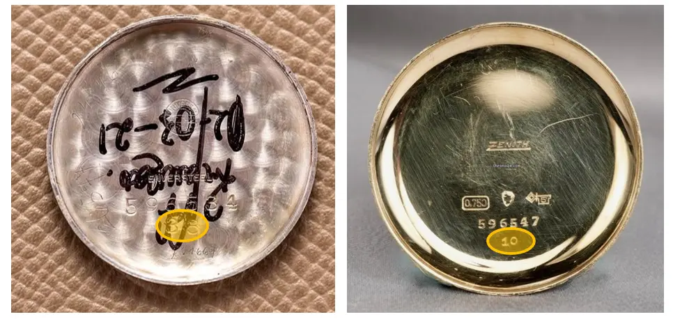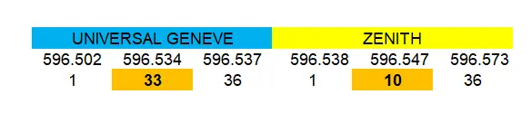 I always check the serials of watches like this against my mastertable of chronographs to see whether they fit in (actually: fit out) and this time it was a close call with a Zenith serial. This watch was sold in the past by L'Orologiese but no working links anymore unfortunately. Serial of the UG: 596.534, Zenith: 596.547. However: these numbers were not the only ones in the caseback. Both watches have a 2 digit number below the serial: