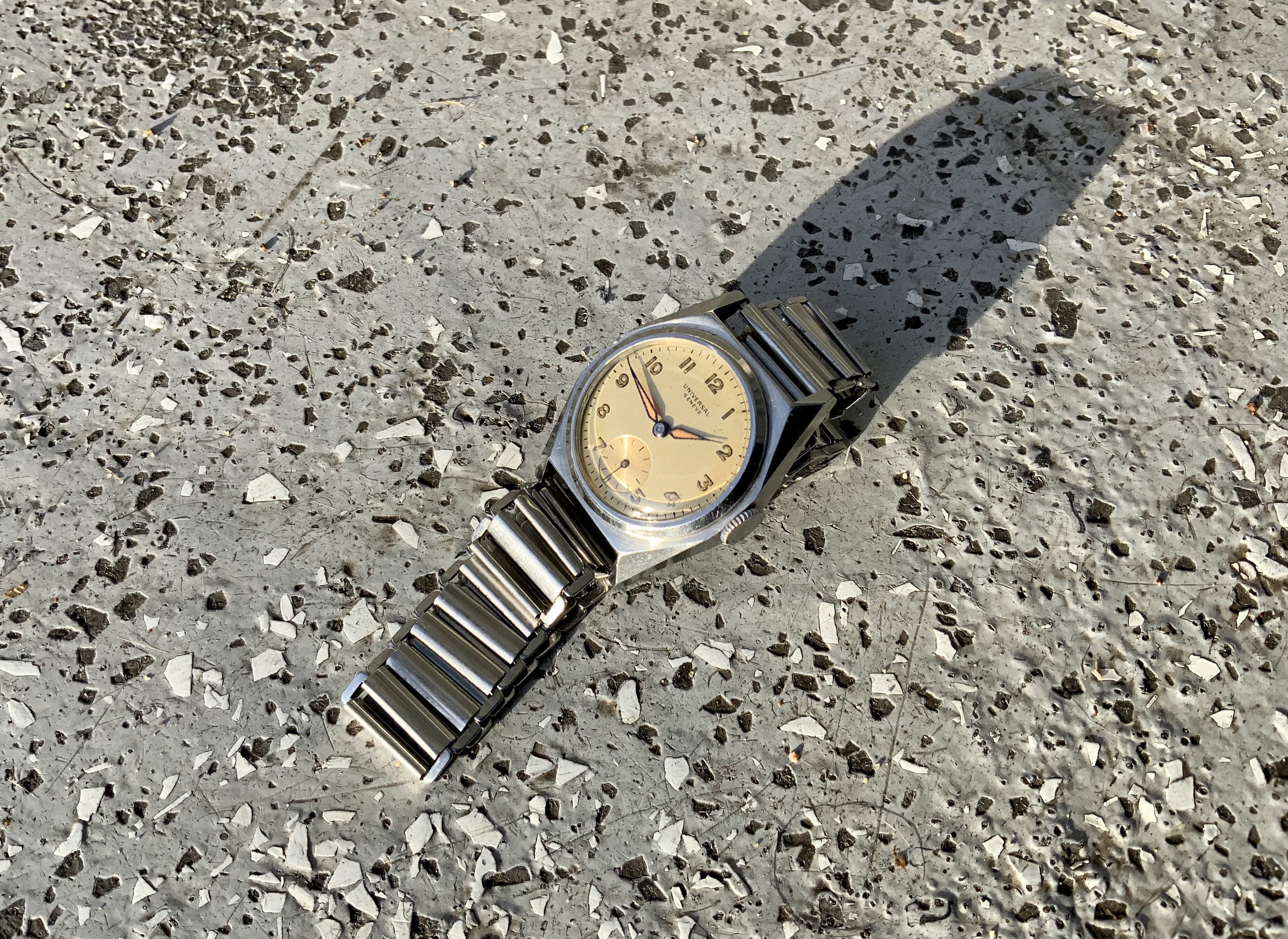 The serial places this piece to around 1939. The hulking case is in fine shape considering it is over 80 years old and was presumably no safe queen, particularly when evaluated alongside its original battered bonklip bracelet.