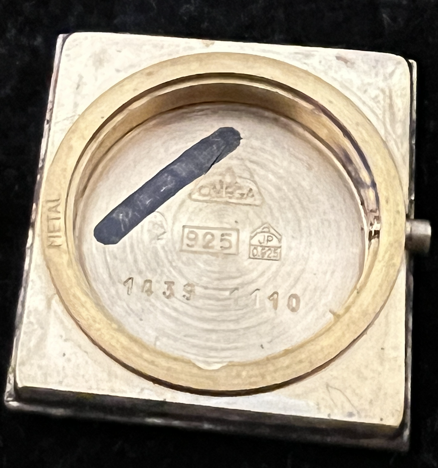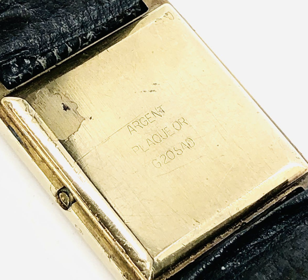 This one appears to be a 20mm lug width case from my approximations, and (to be google'd in the future) it says "ARGENT PLAQUE OR G20" on the back, there are some Cartier tanks that both say this, and have 925 etched, so my hope is that thing near the crown could indeed be a hallmark and it could be silver