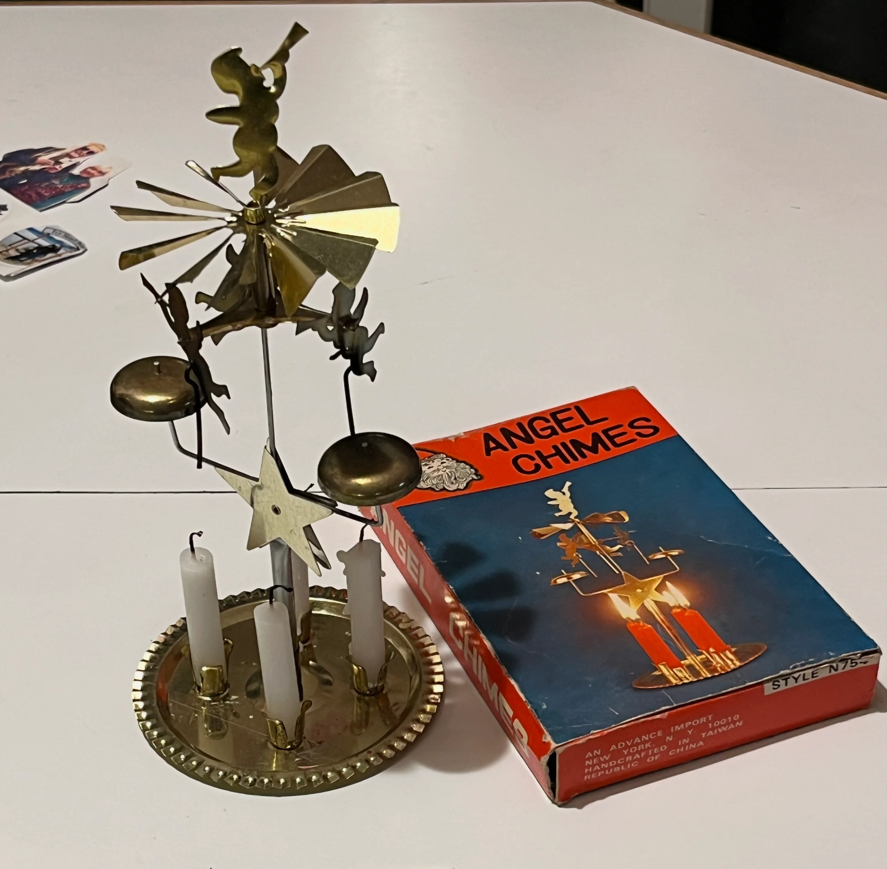 ·I think this candle toy came from my grandmother. I recall it on the kitchen table. It was broken one of the angels was missing and another had the hole with the rod mis punched and worn through. My guess it came from the 1950s or 1960s. I love the box as well. Back when cheap quality toys were well made (more or less.)