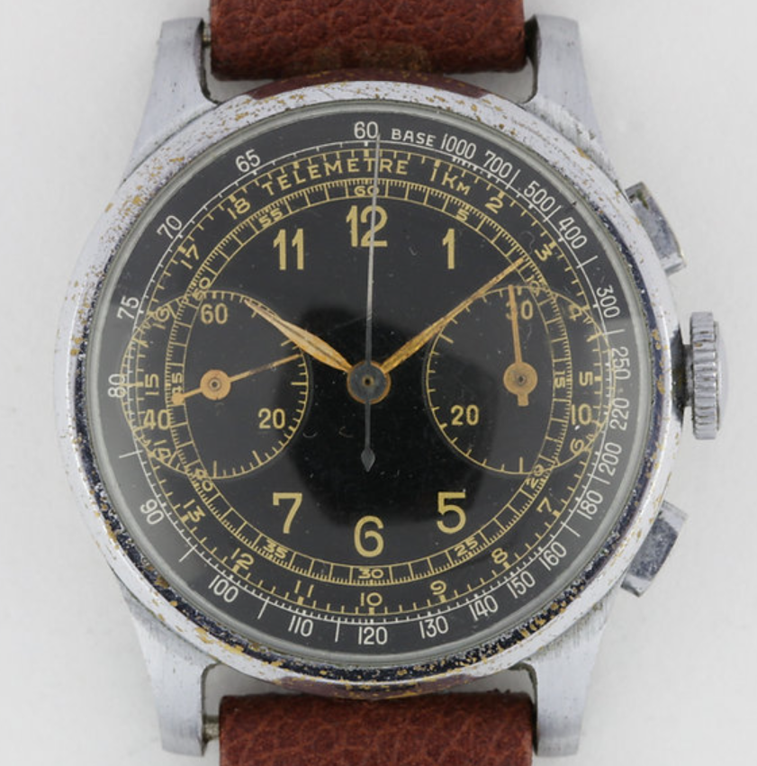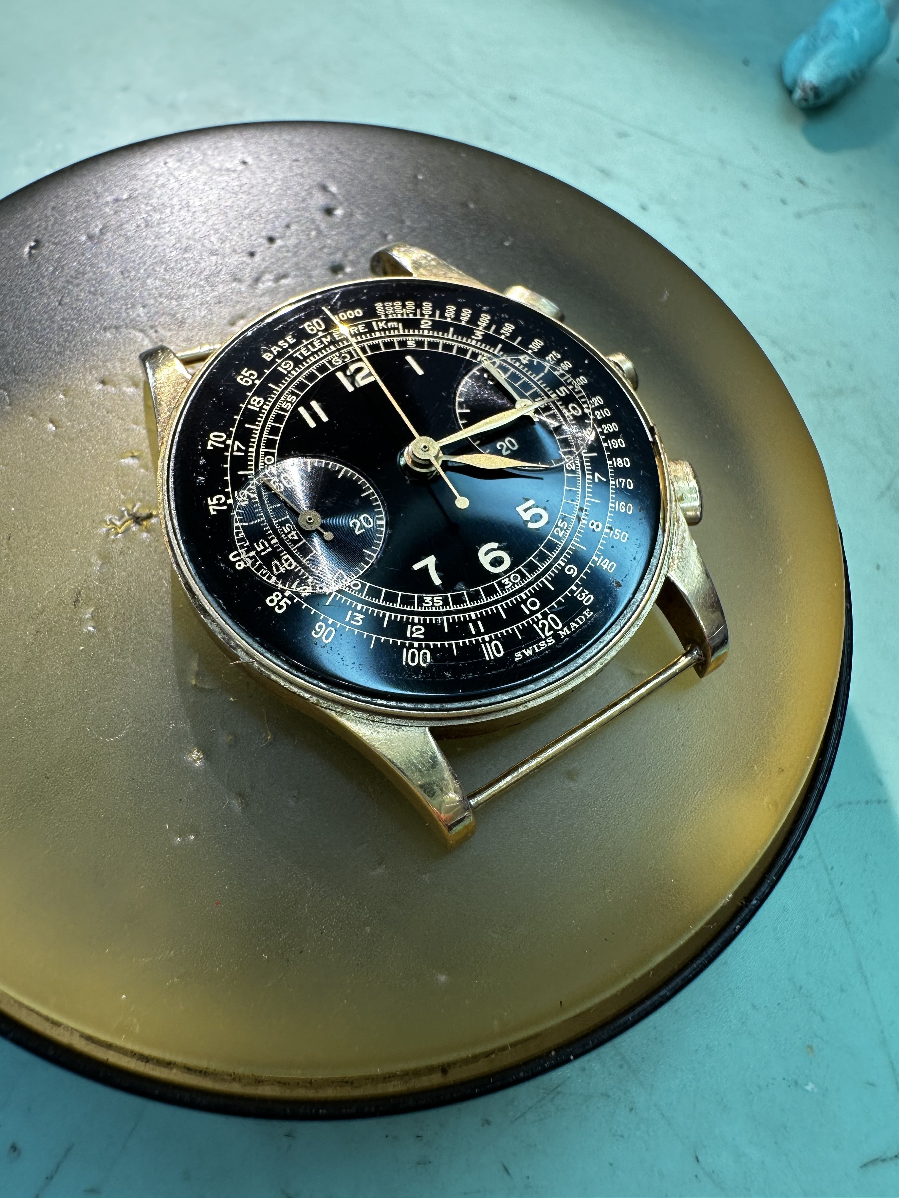 Tha black dial with the two counters and a telemetre scale is unbranded. It seems in good condition besides the replaced second hand and the top springbar in precarious conditions.