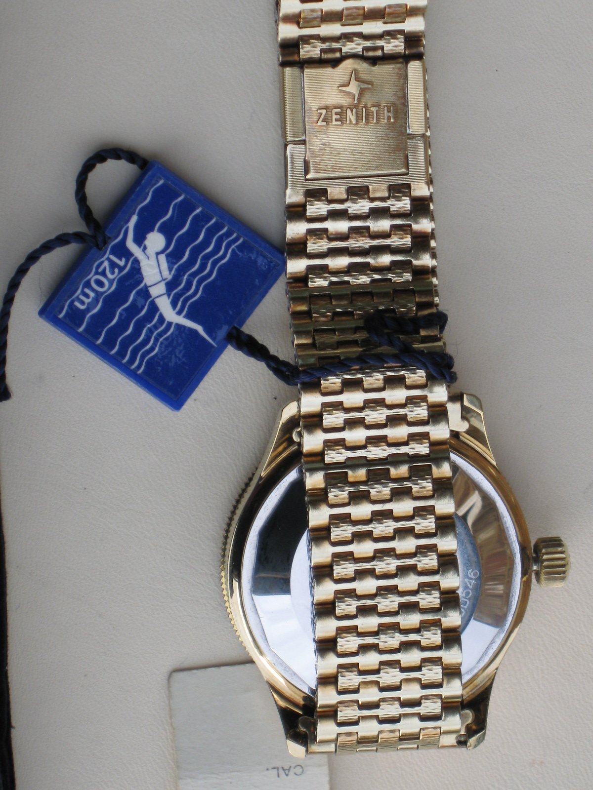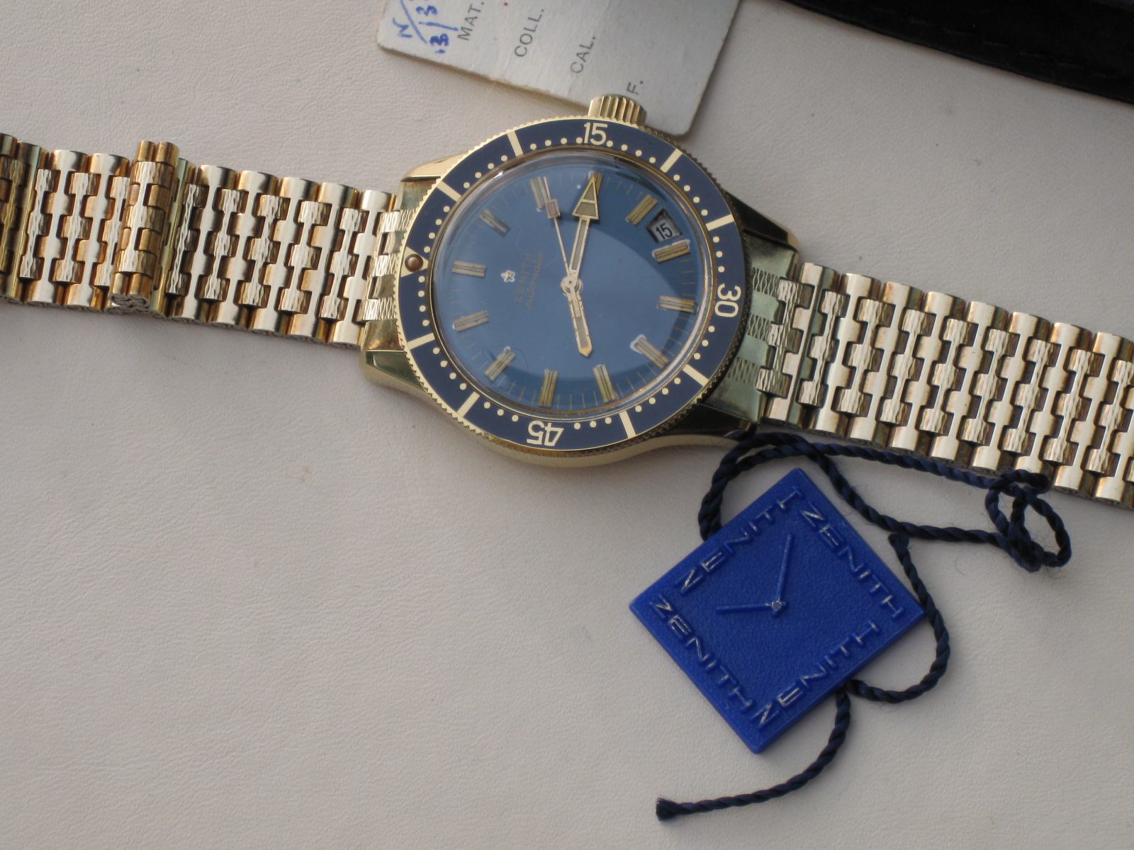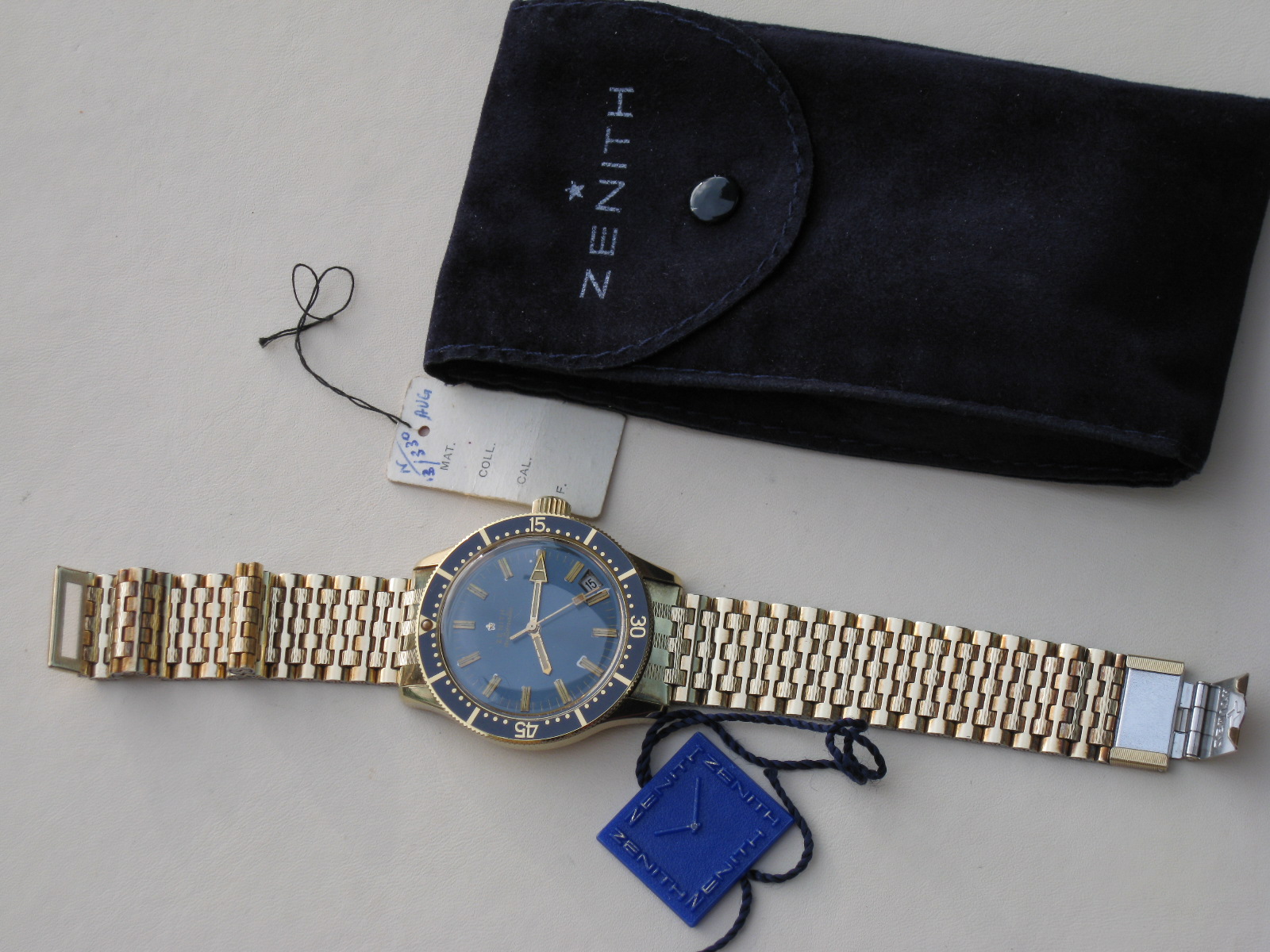·NOS Zenith Divers watch from the end 60′s. Great looking high quality divers watch with large 39mm case and bi-directional rotating bezel. The watch is completely original, never polished and in NOS condition. It still retains the numbers in the case back. The original bleu dial is in good condition, at some places the laceur came off. Slightly aged luminous on dial and hands. Movement is the high quality Zenith Automatic Caliber.