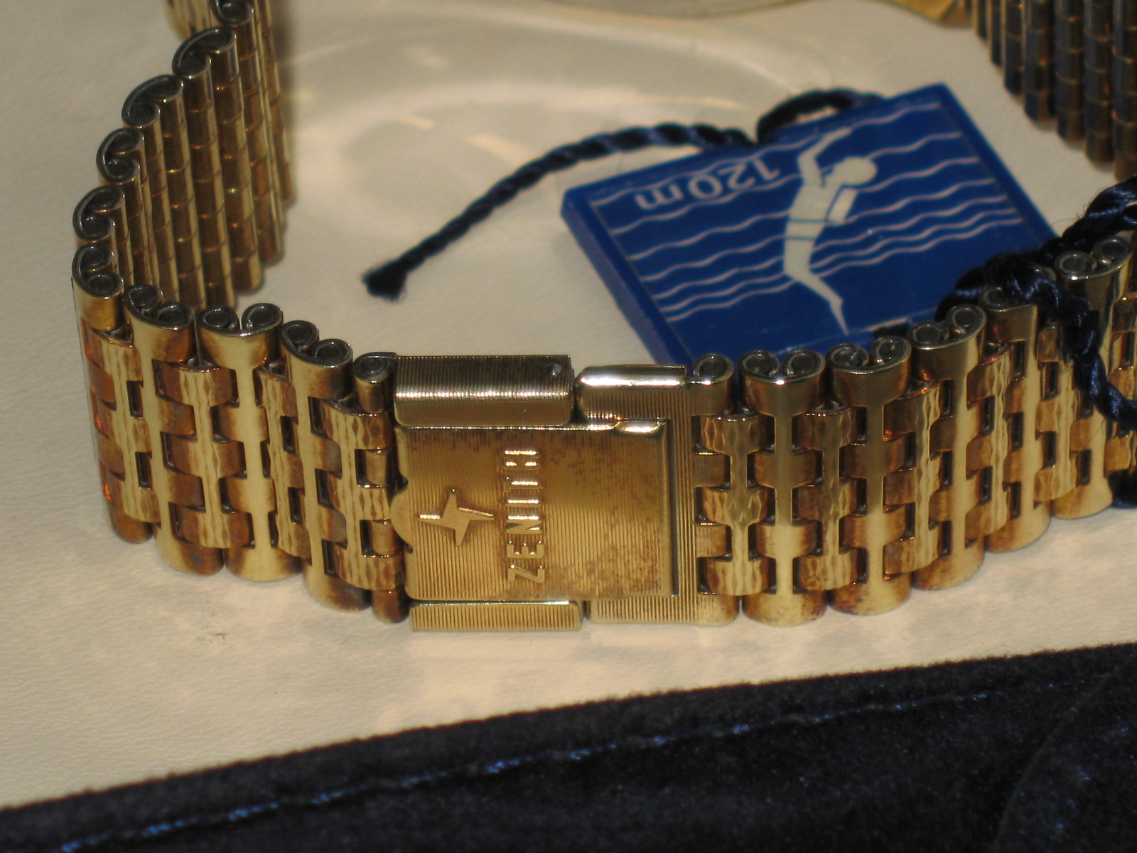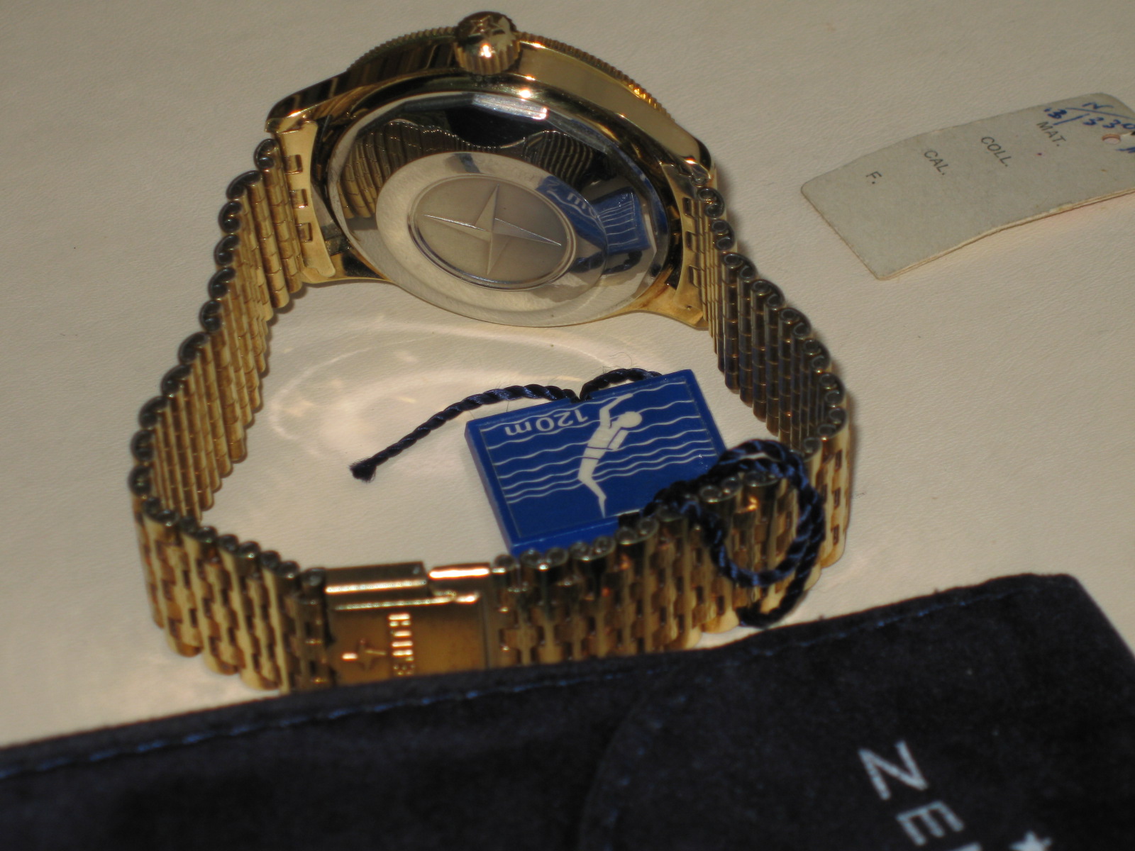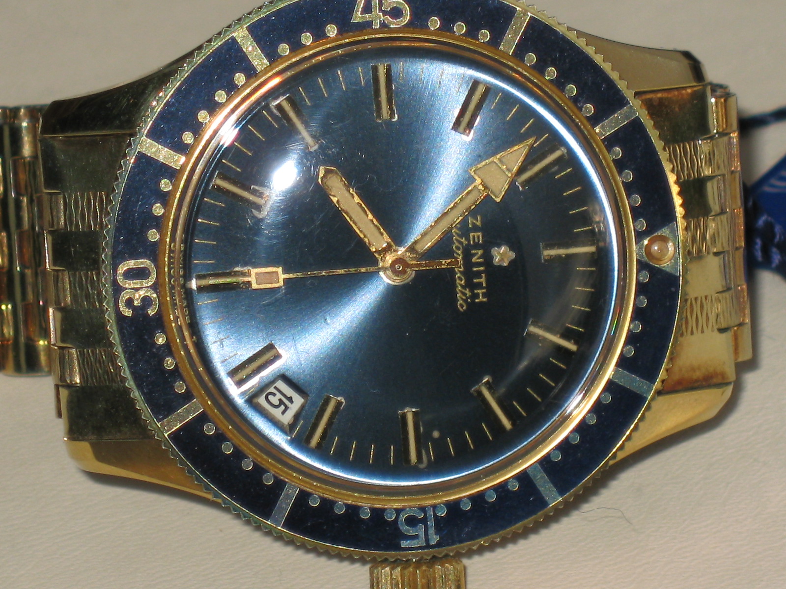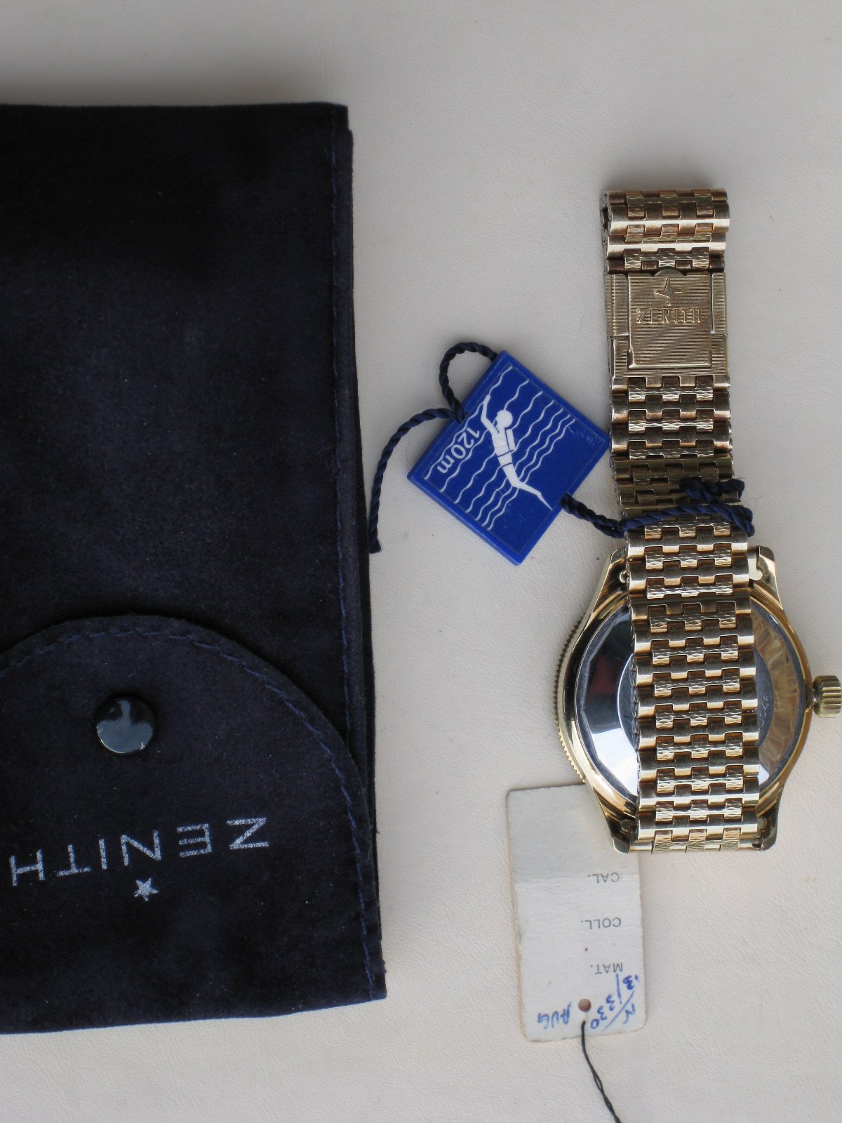 ·NOS Zenith Divers watch from the end 60′s. Great looking high quality divers watch with large 39mm case and bi-directional rotating bezel. The watch is completely original, never polished and in NOS condition. It still retains the numbers in the case back. The original bleu dial is in good condition, at some places the laceur came off. Slightly aged luminous on dial and hands. Movement is the high quality Zenith Automatic Caliber.