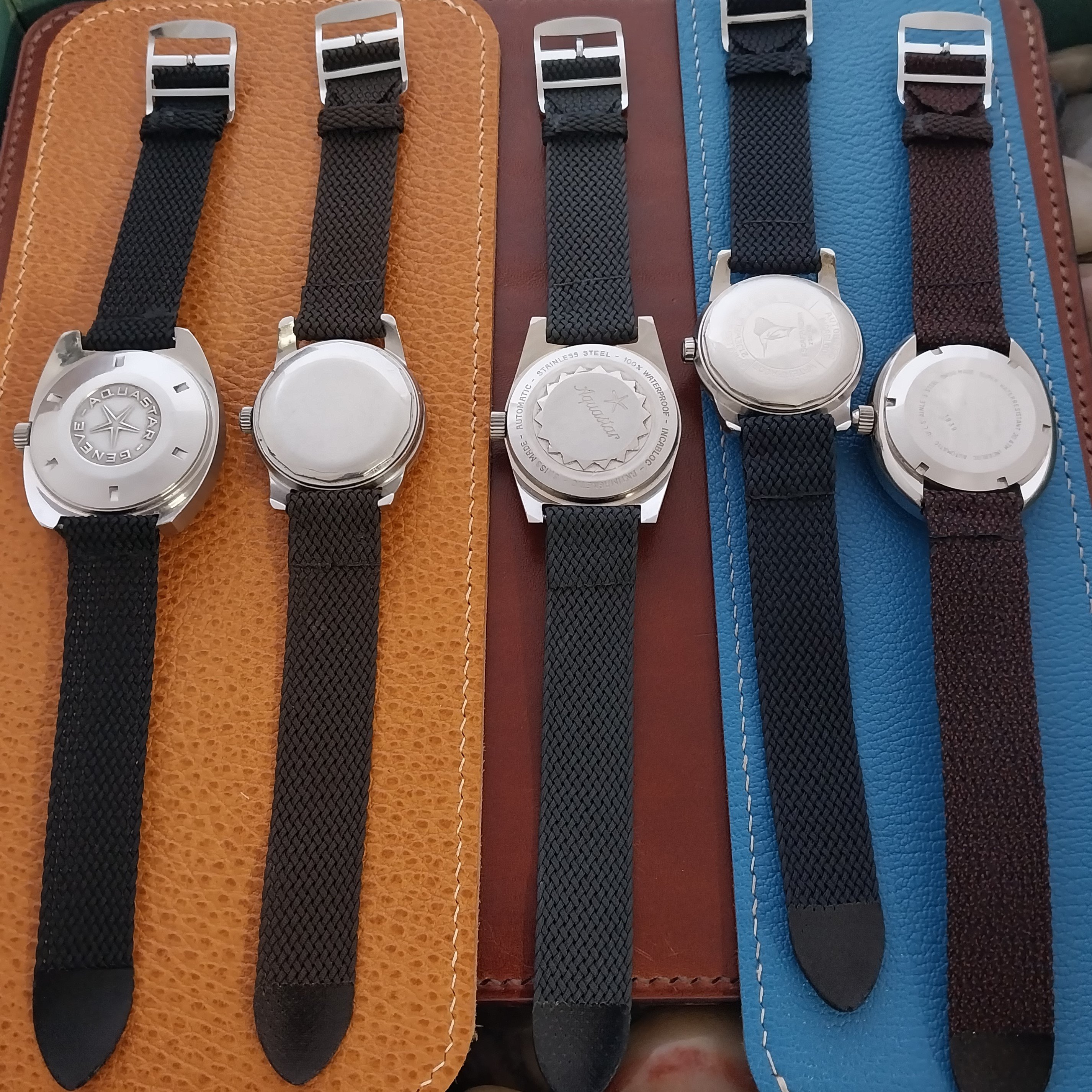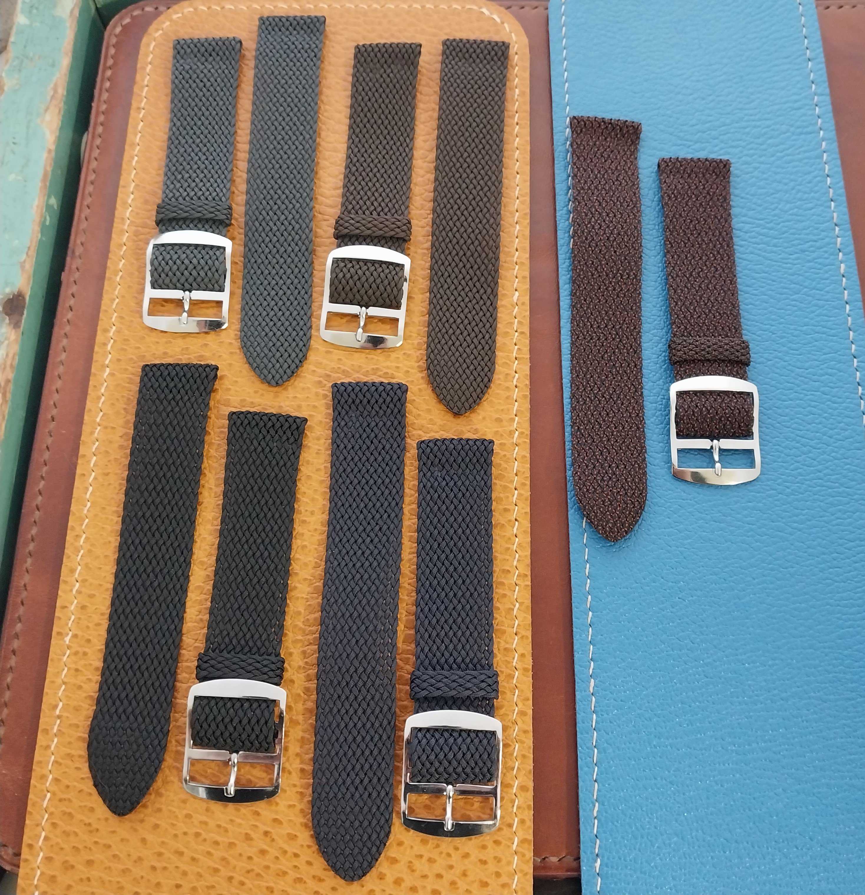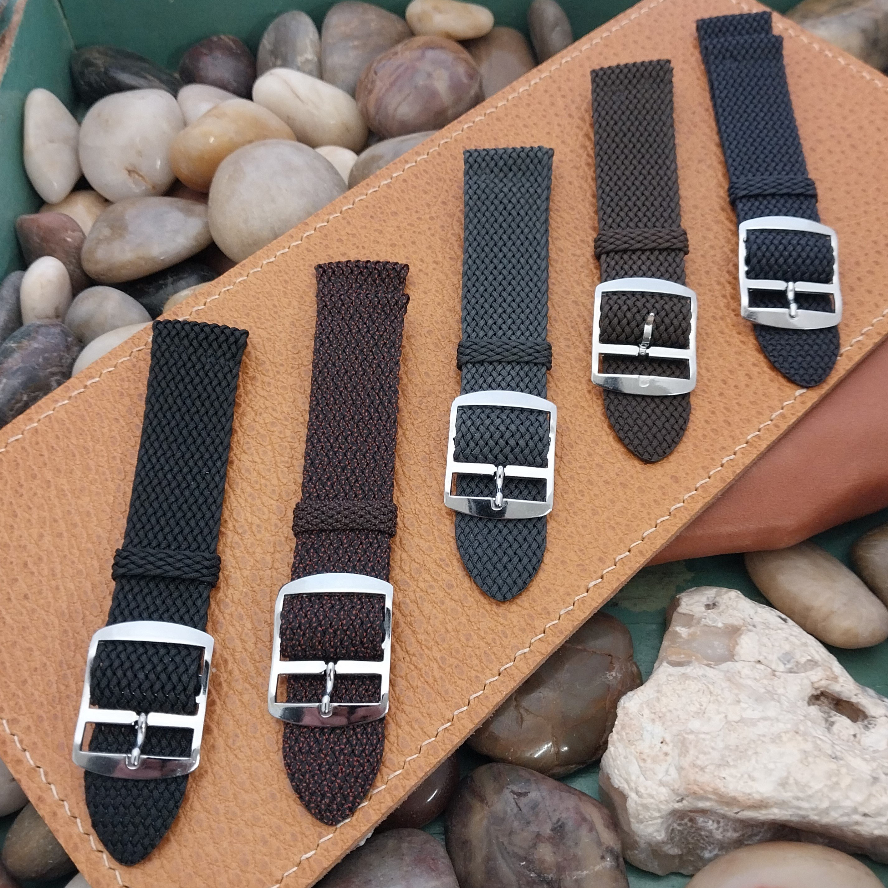 ·Unused Old-Stock 1960s Swiss braided perlon two-piece perlon straps with silver-tone buckle.
