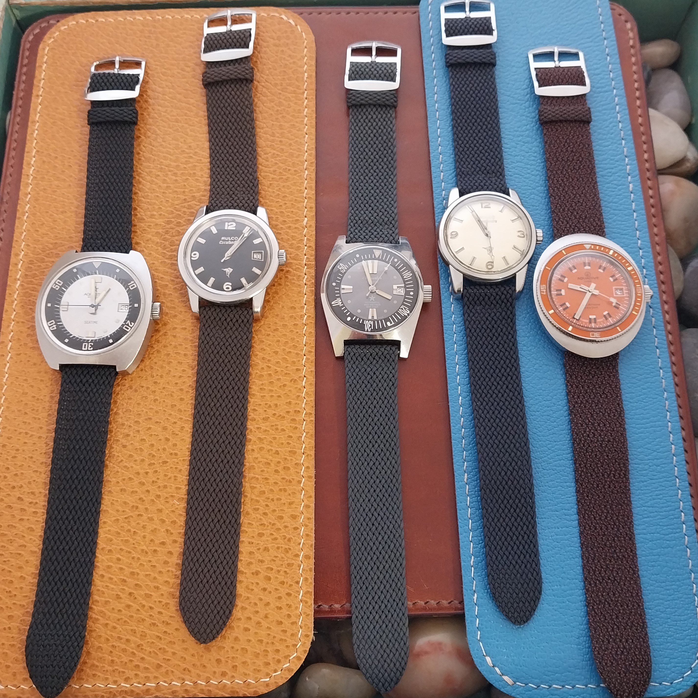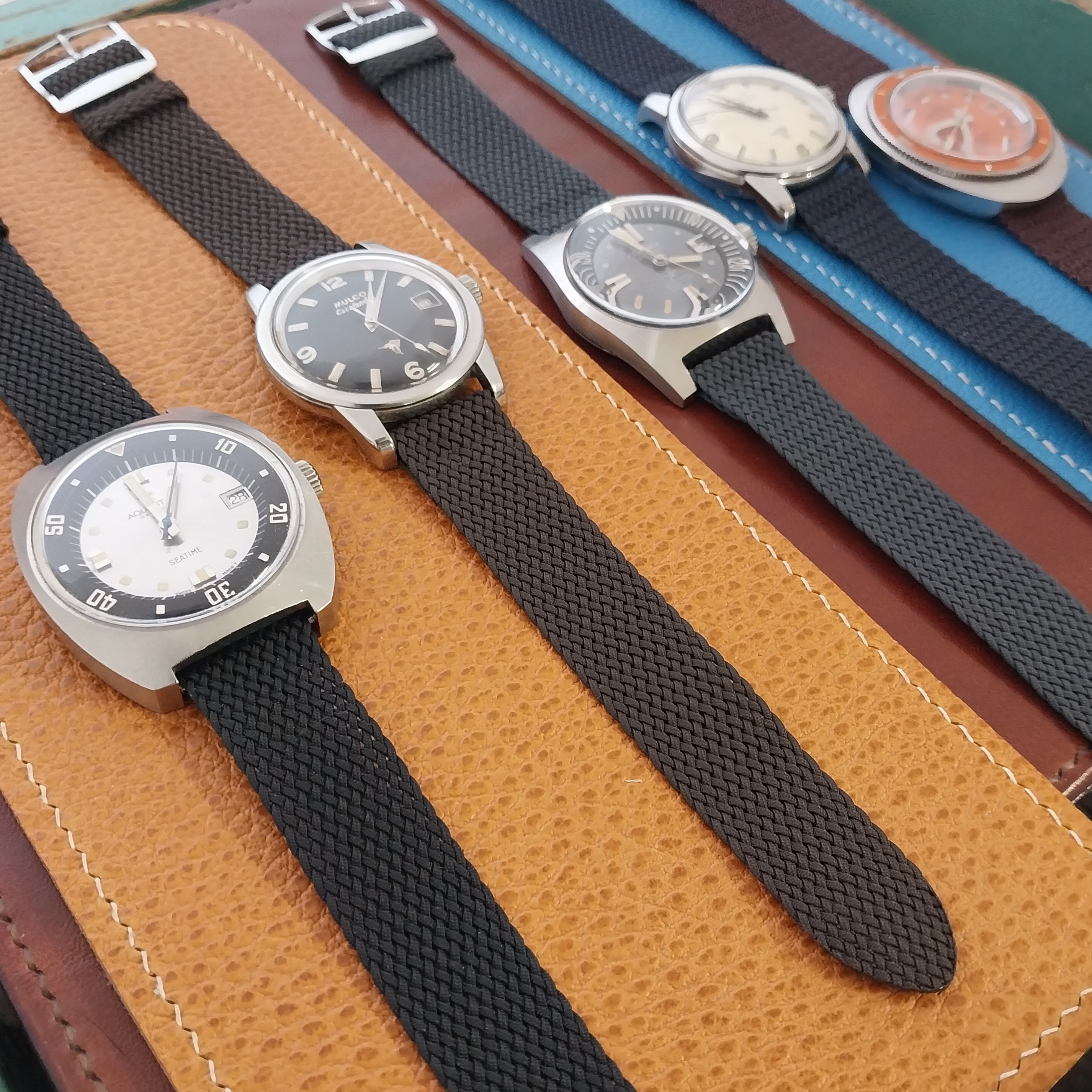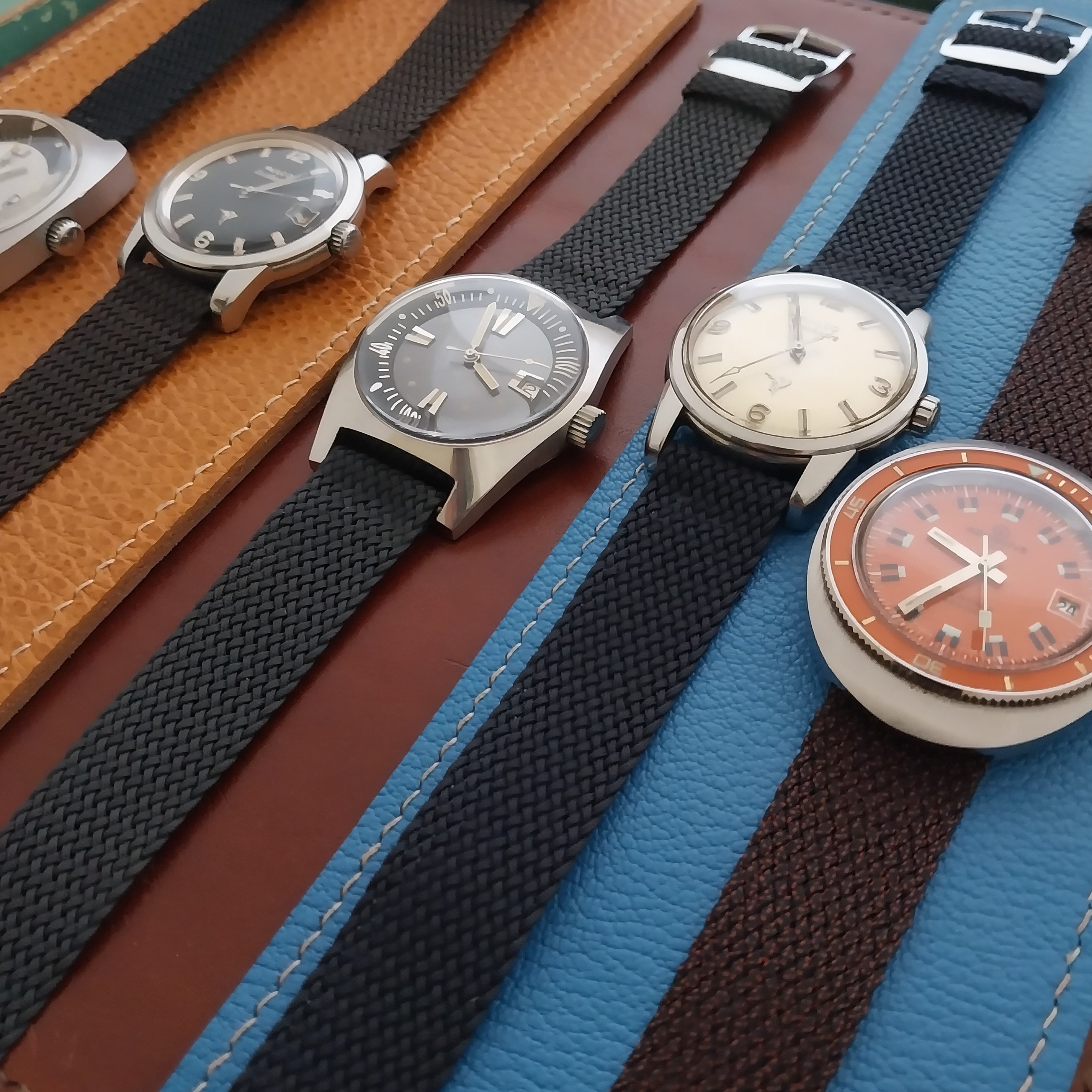 ·Unused Old-Stock 1960s Swiss braided perlon two-piece perlon straps with silver-tone buckle.