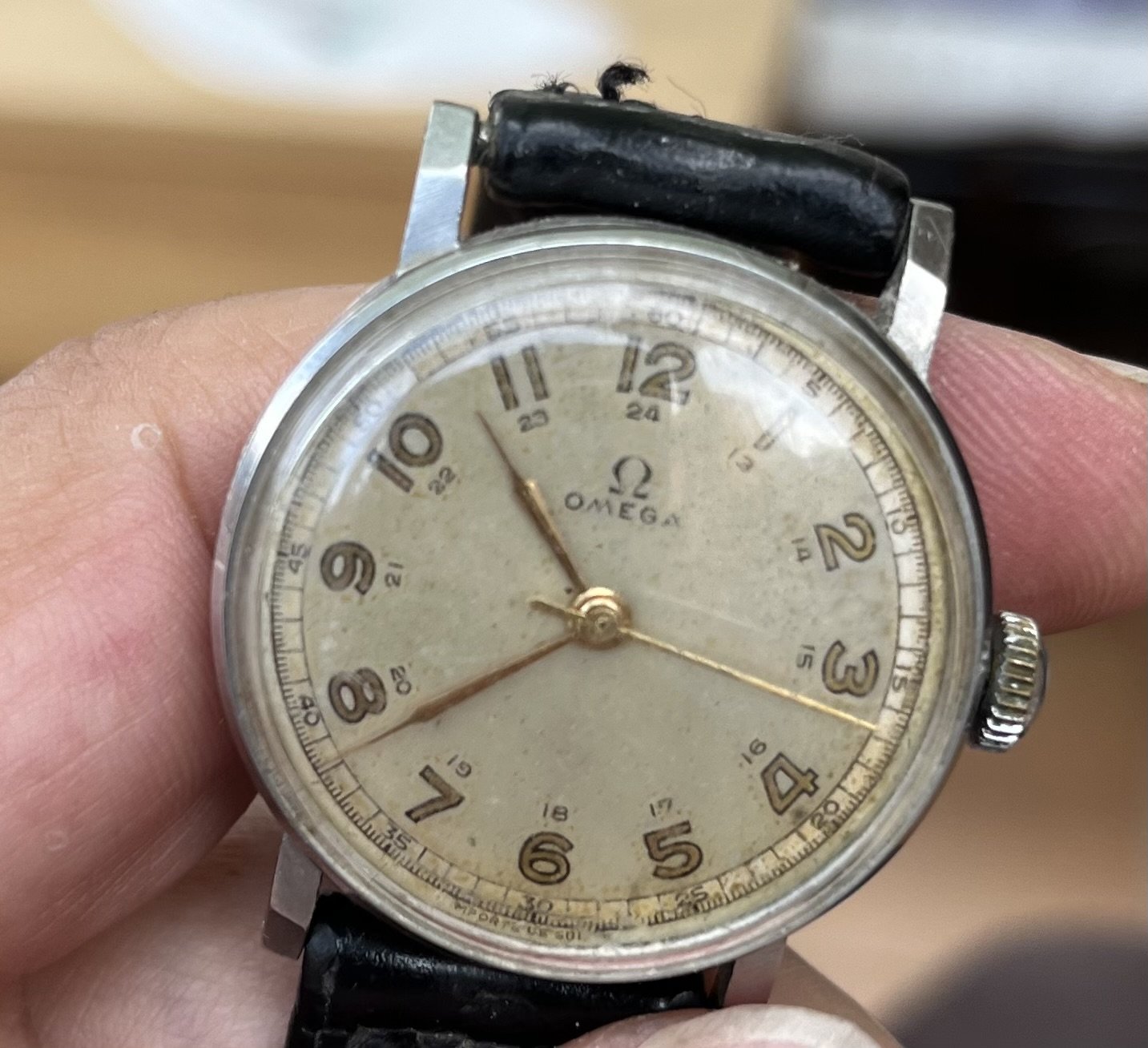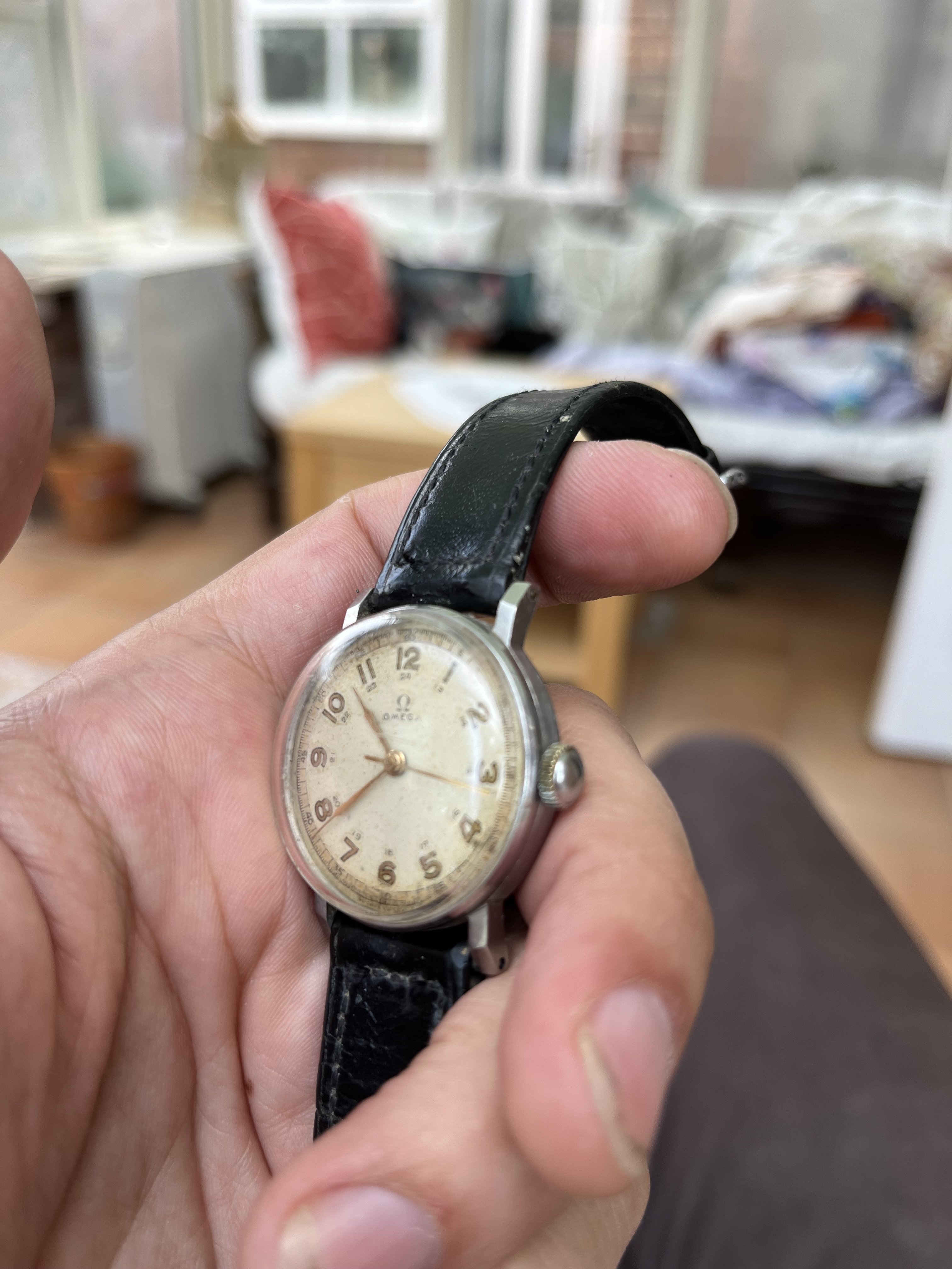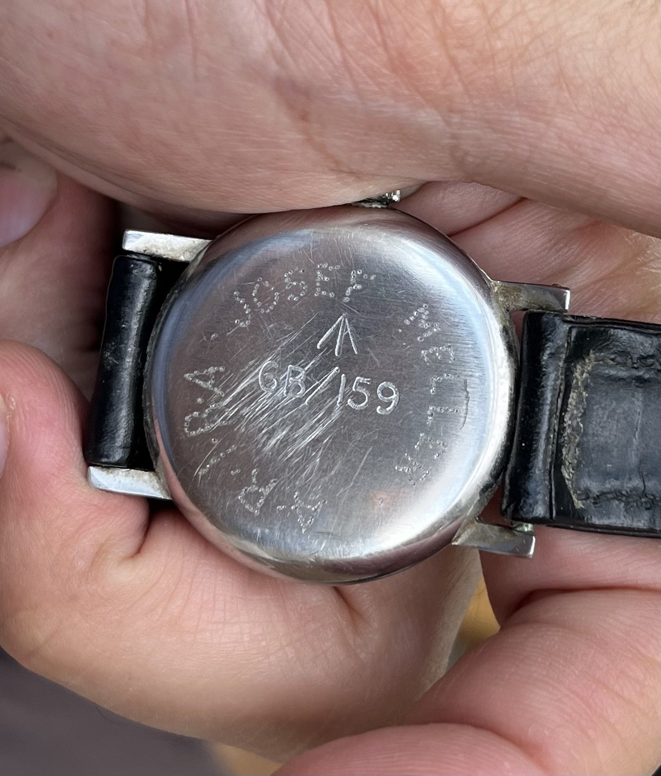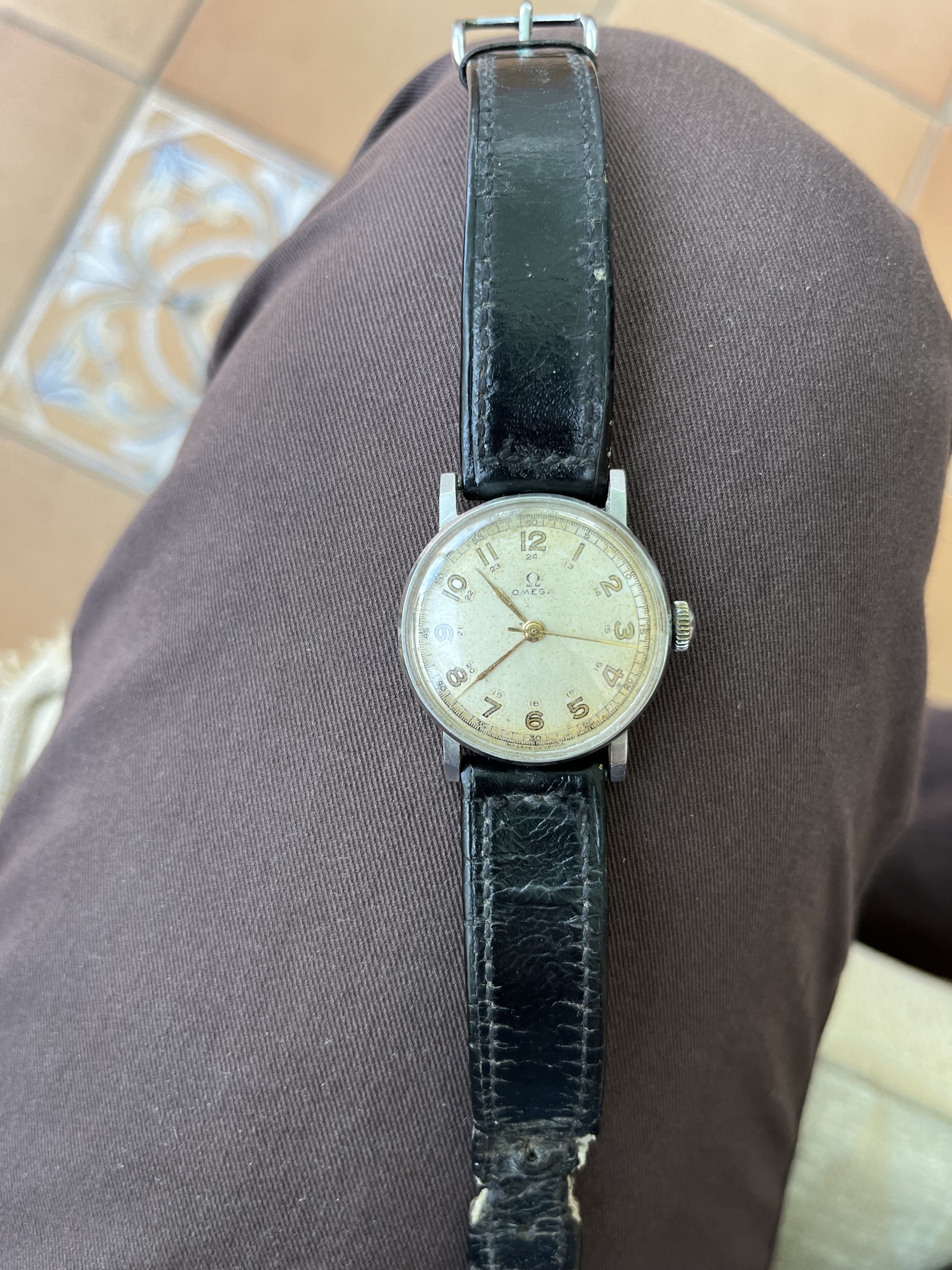 My mother died a while ago and I’ve been sorting through her belongings. I’ve just found her father’s watch. I’ve had a good search online and although there are lots of Omega 6B/159 models for sale on eBay and vintage watch websites, I can’t find this exact one anywhere. It’s got a 24-hour dial and (I think) brass hands. I’m told that the mark on the back indicates it was a military-issue watch. At the bottom it says something like “Import UK Suisse”, but the text is a bit worn so I can’t tell exactly. Anyway, made in Switzerland by the look of it. Is anyone able to tell me when it would have been manufactured and its approximate value, please? Just out of curiosity - it’s a lovely reminder of my grandfather and I would never sell it. Many thanks in advance for any information.