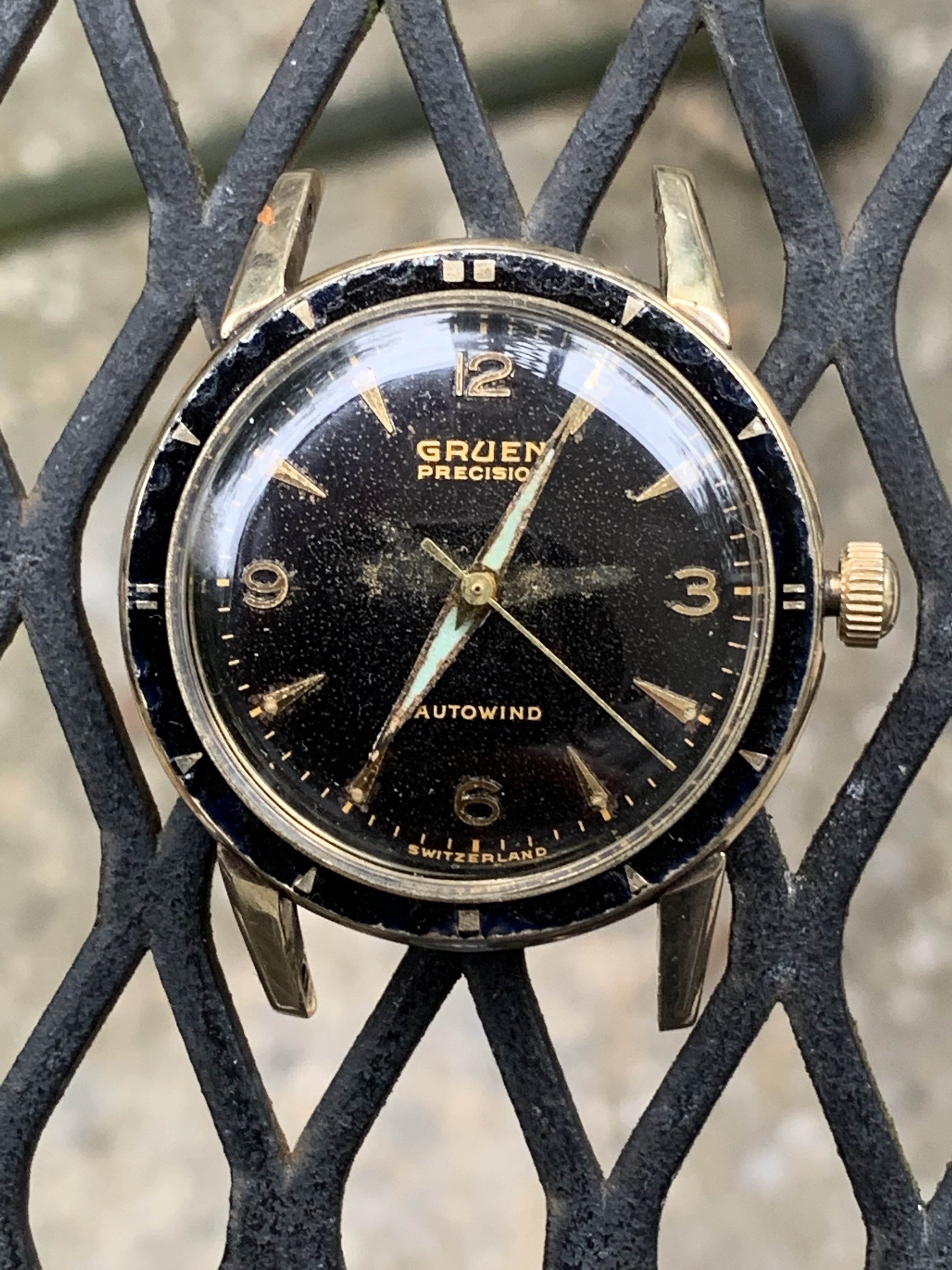 460SS movement puts it around 1948 as does the “Switzerland” on the dial which changed around ‘49. 10k Gold filled case is common for the era, but the black gilt dial arrow hands and enameled bezel are not common for Greun of this era.