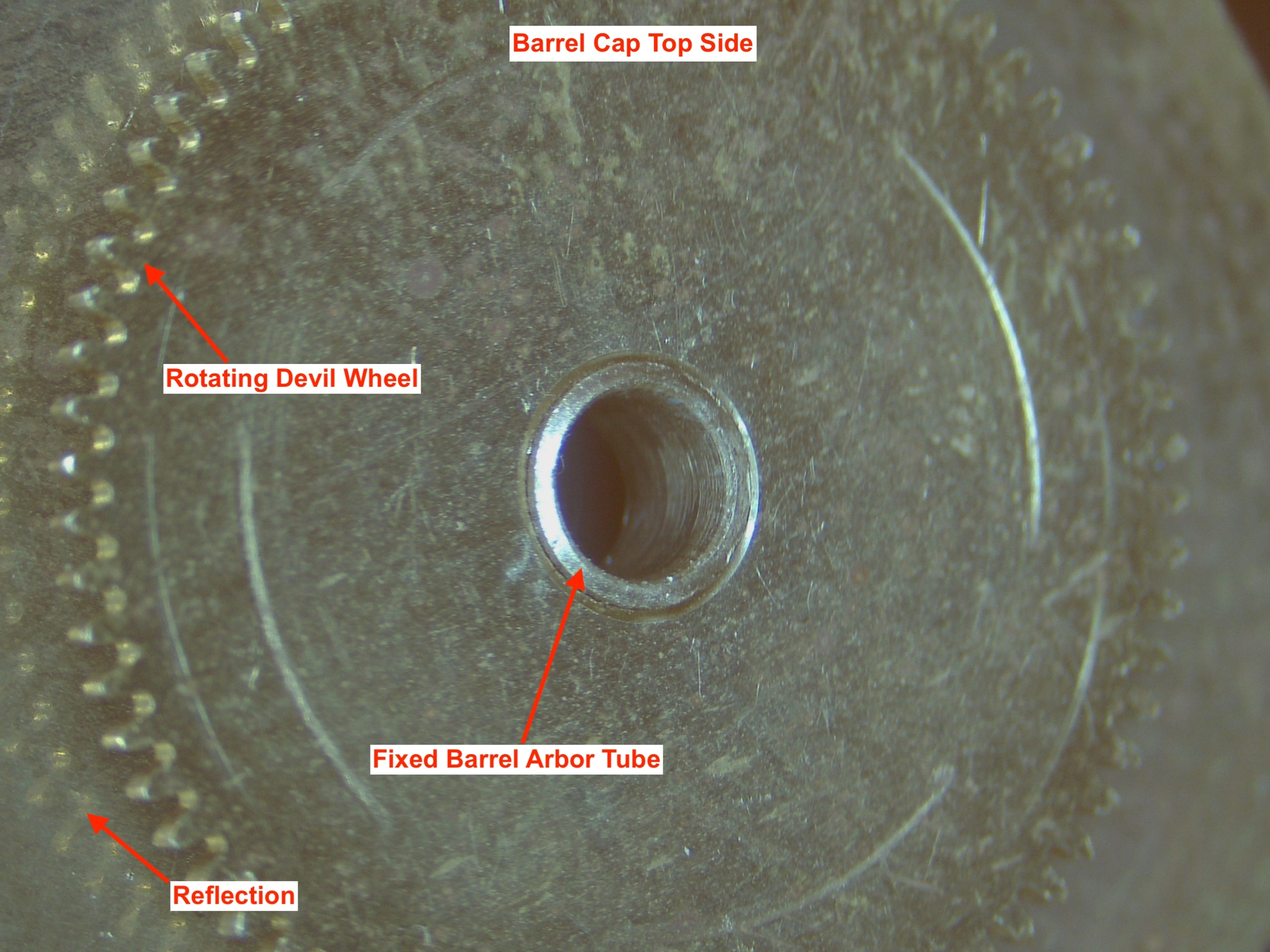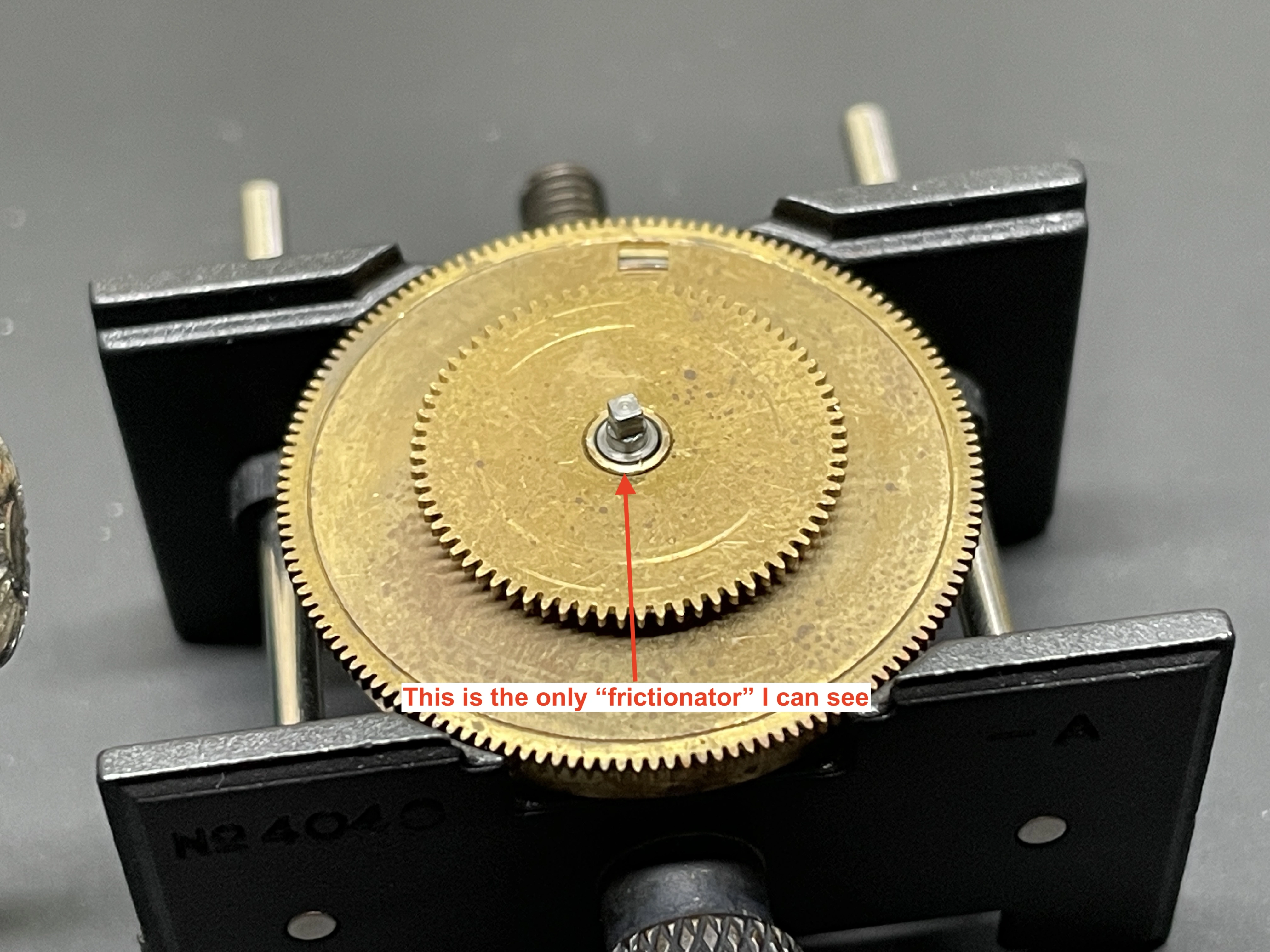 Unlike a standard gear train, the mainspring barrel only drives the gear train from the barrel to the escape wheel and the time keeping/setting is driven by a friction wheel fitted to the top of the main barrel.