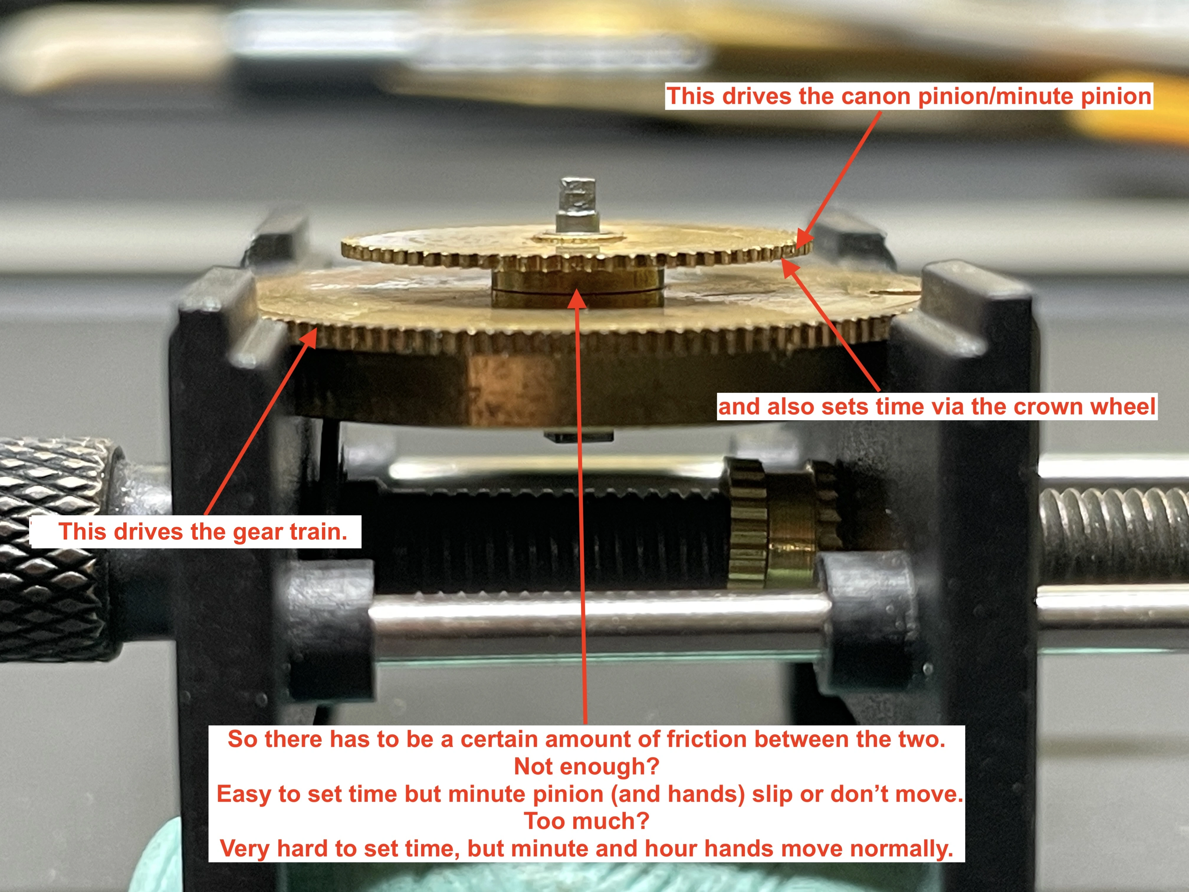 Over time, the "friction" that was between the two components has deteriorated due to wear, primarily because the time setting from the crown wheel to the minute pinion must turn the "friction wheel".