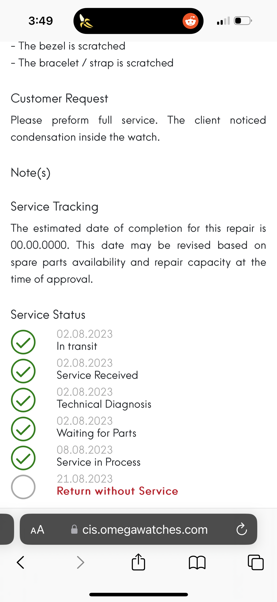 The next day I sent it down to the boutique and off for service. The watch was running really well, +1 ish, no beat error prior. Watching the portal it has said that the watch is to be sent back, return without service (supplied photo from their portal). Has anyone else experienced anything like this or know what it would mean?