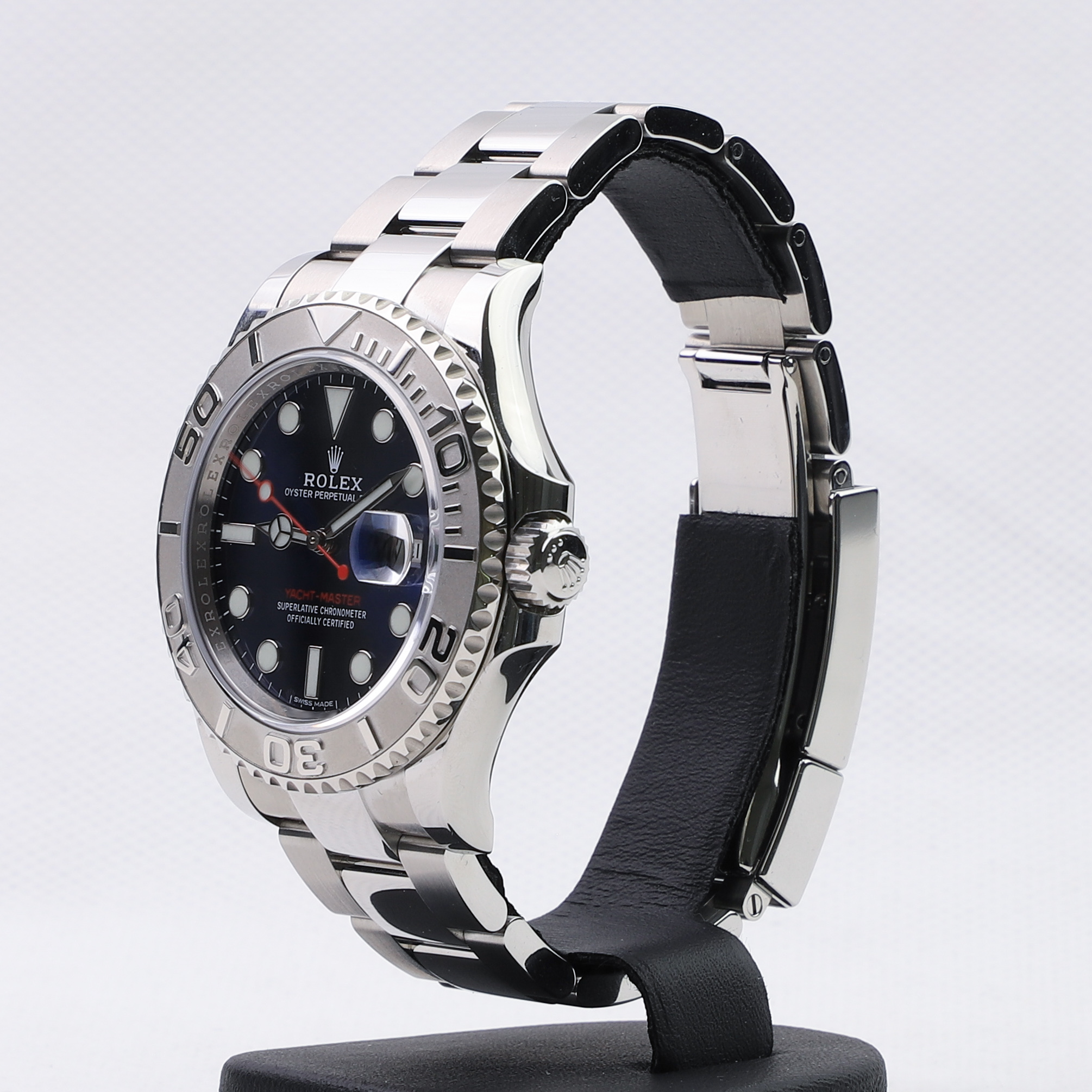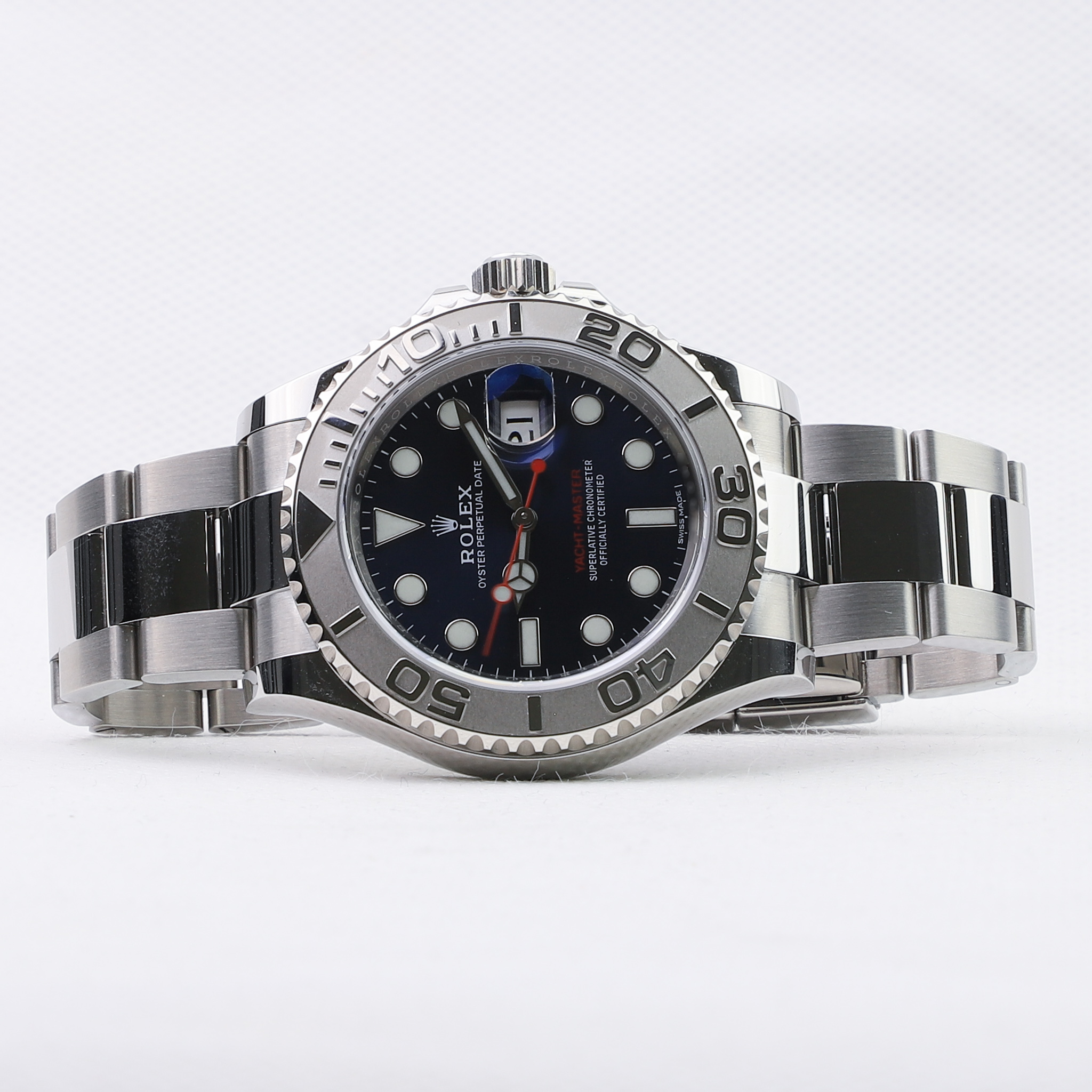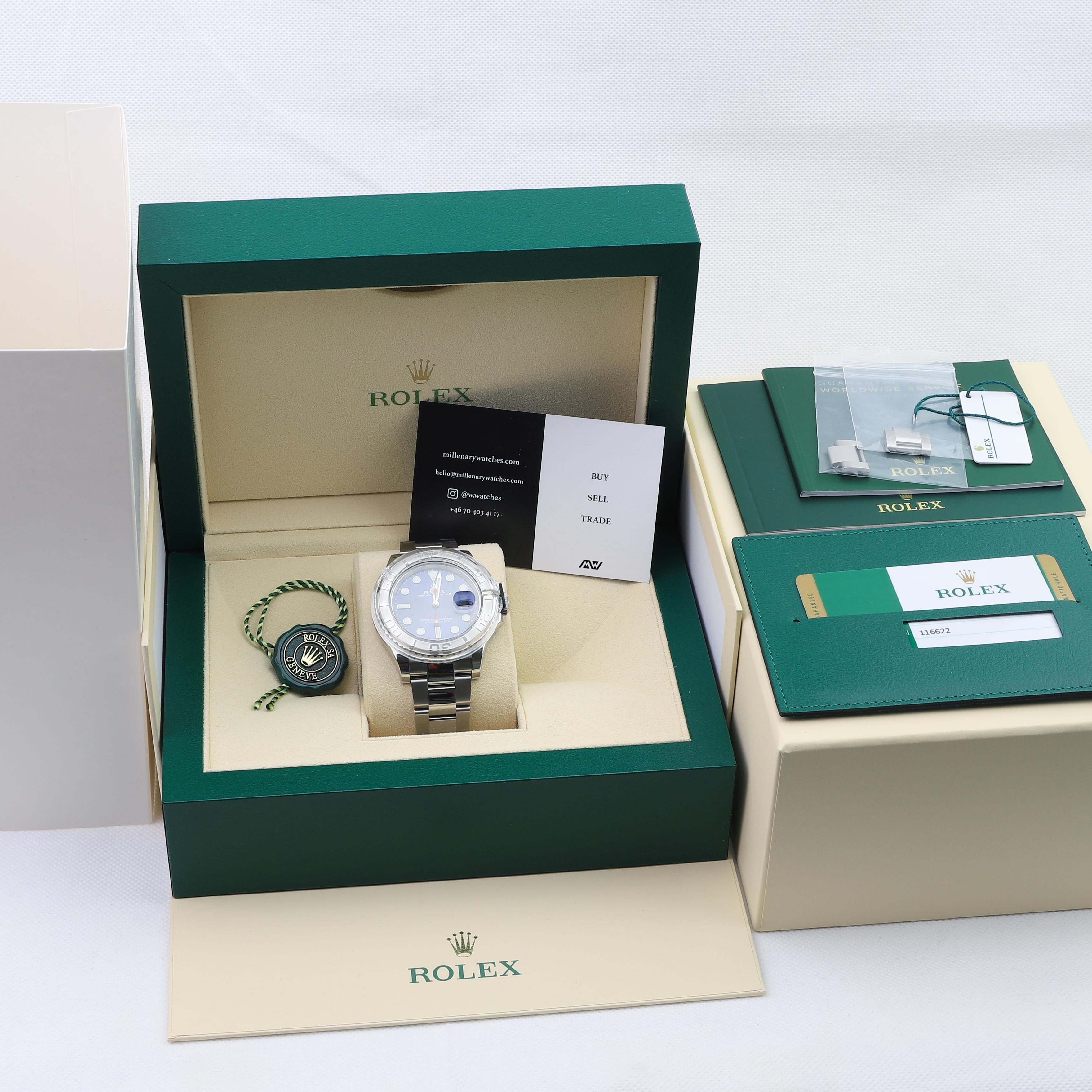 Selling an unworn Rolex Yacht-Master reference 116622 with blue sunburst dial. The watch comes complete with box and papers. The certificate is dated 2019.