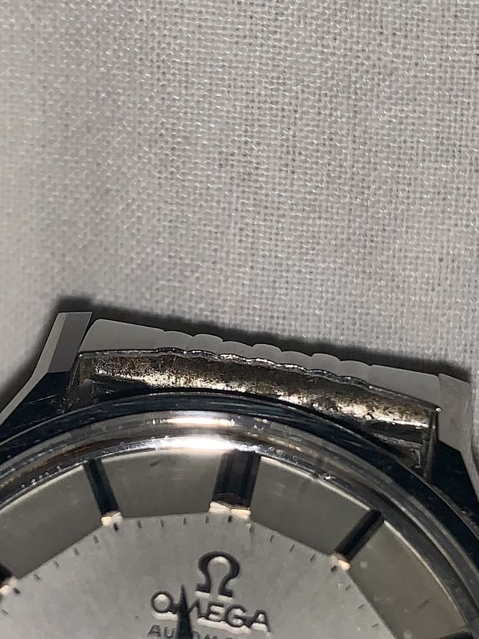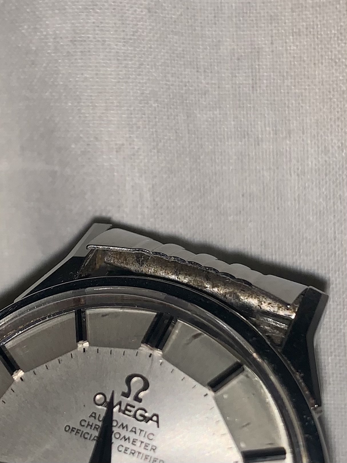 No pictures of the movement and such a dirty case.Well, when I buy a SS pie pan with date (168.005) I always prefer ones with original crown (decagonal with thin logo) hour markers with onyx inserts and small hour marker next to date window. Cross hair is a bonus.