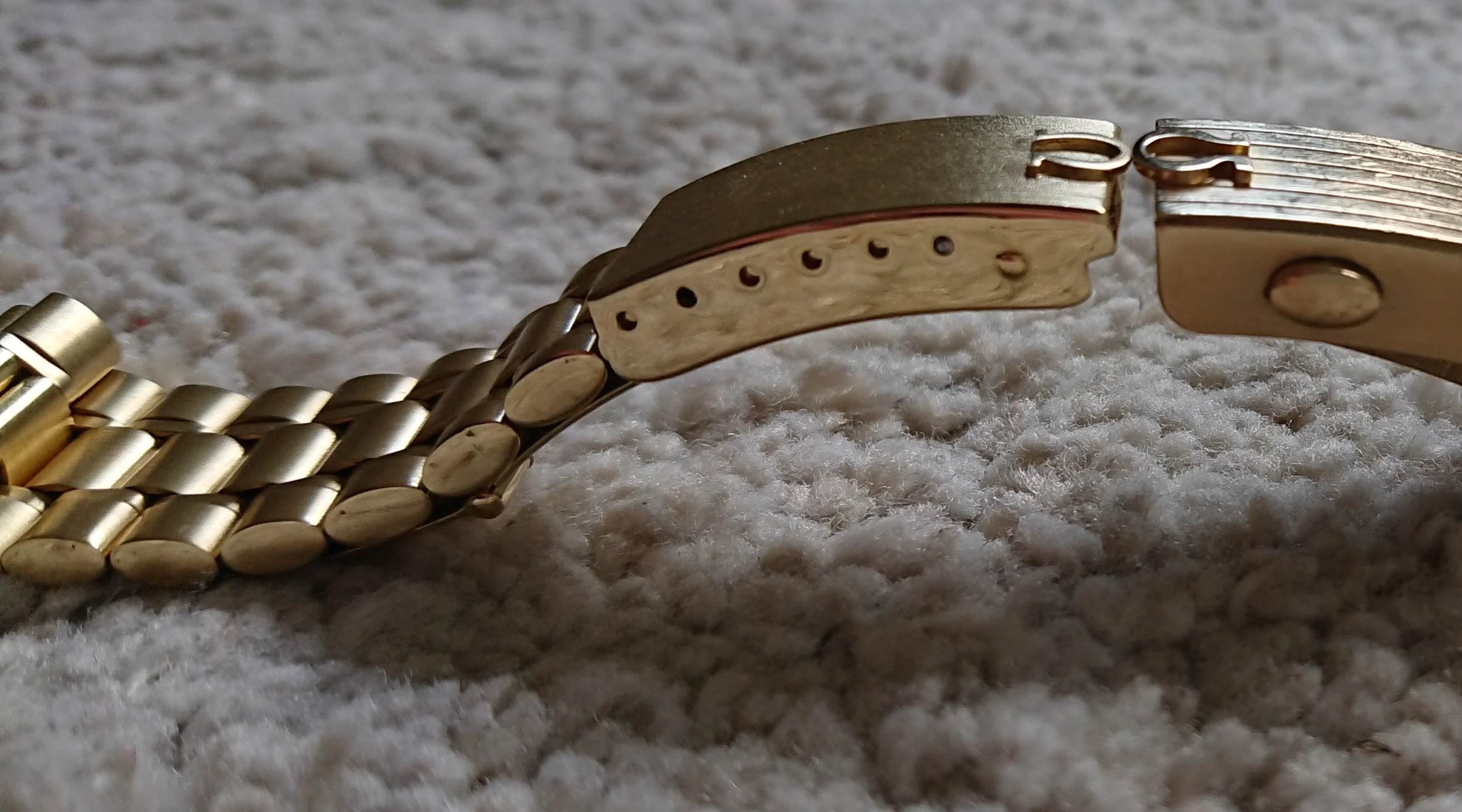 I think the gold is similar to the steel 1116 bracelet, in which case the links are either screws or push-pin with springs.
