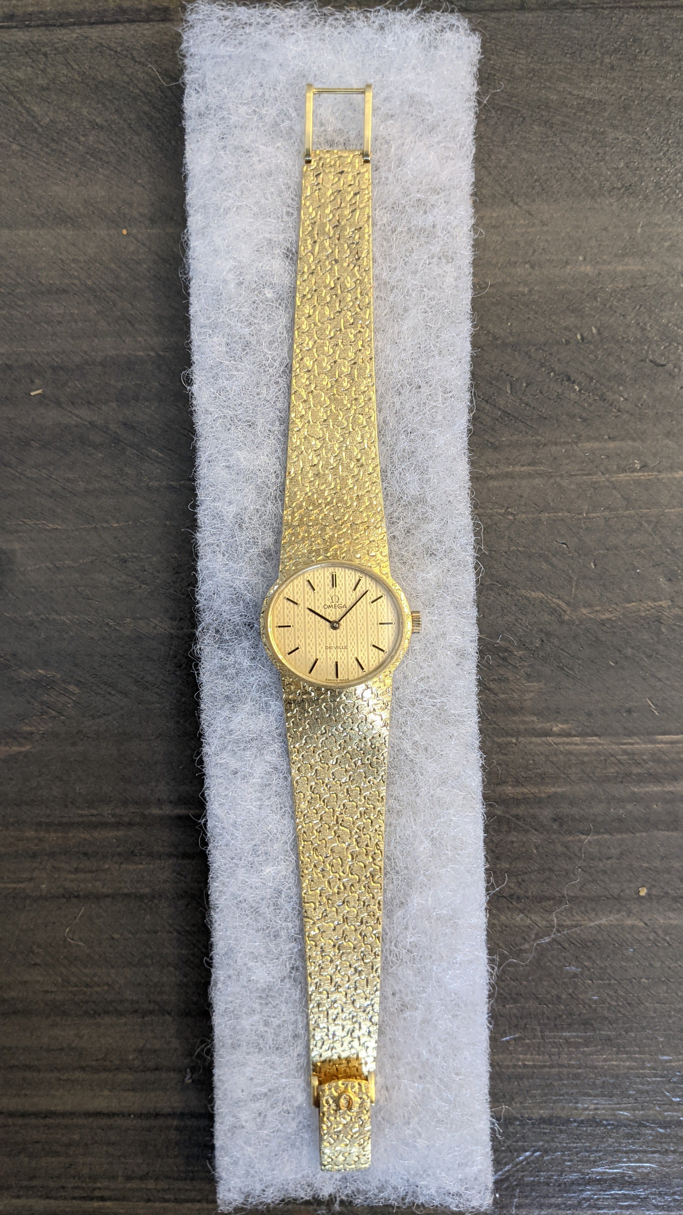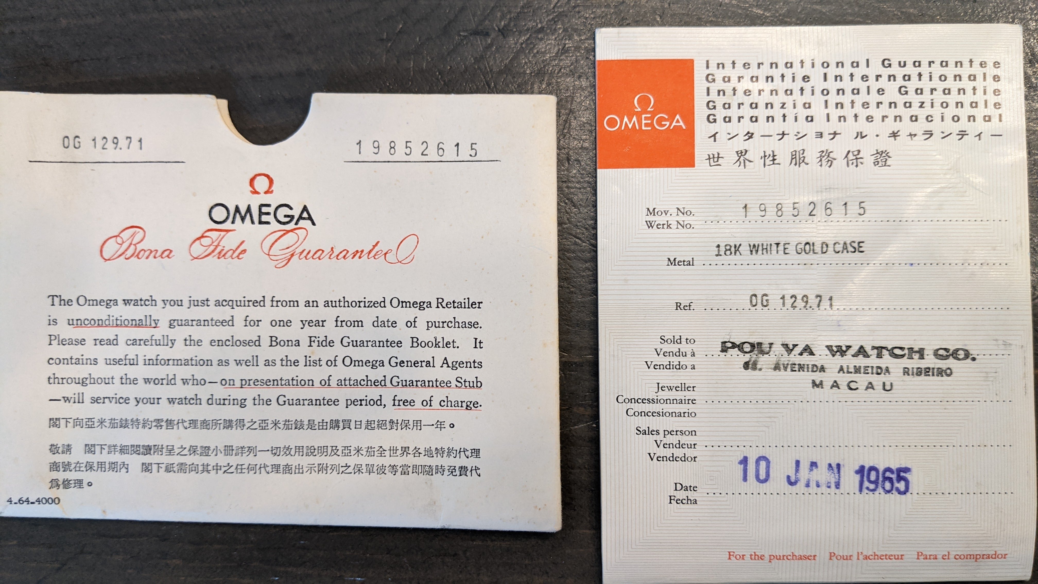 This piece was given to us from my father-in-law whose mother purchased it from a jewelry store in Macau in 1965. It has been tough to gather information on it and was hoping this community could share their knowledge. I have the Omega certificate which shows the reference number as OG 129.71 and the mov. number as 19852615. I believe this is the serial number? I am not sure what "18K white cold case" refers to as this very much looks like a yellow gold watch. I believe it to be all original, but there is no omega stamp on the back of the face. The watch weighs 62 grams. I am scared to open it and do not have the tools to do so, but I think a serial number would be inside? Any info is appreciated. I do not believe it has ever been worn all but a few times. Thank you!