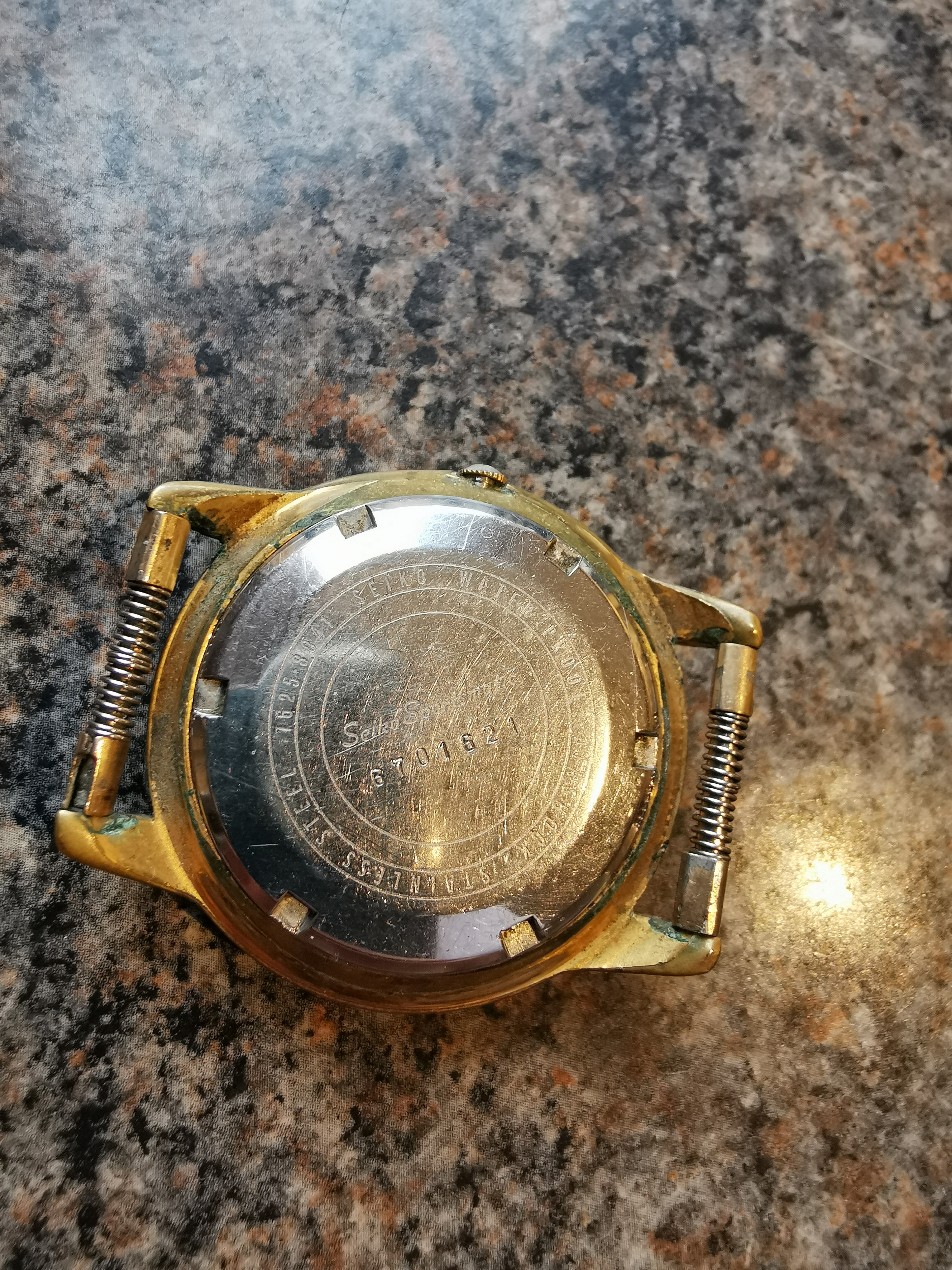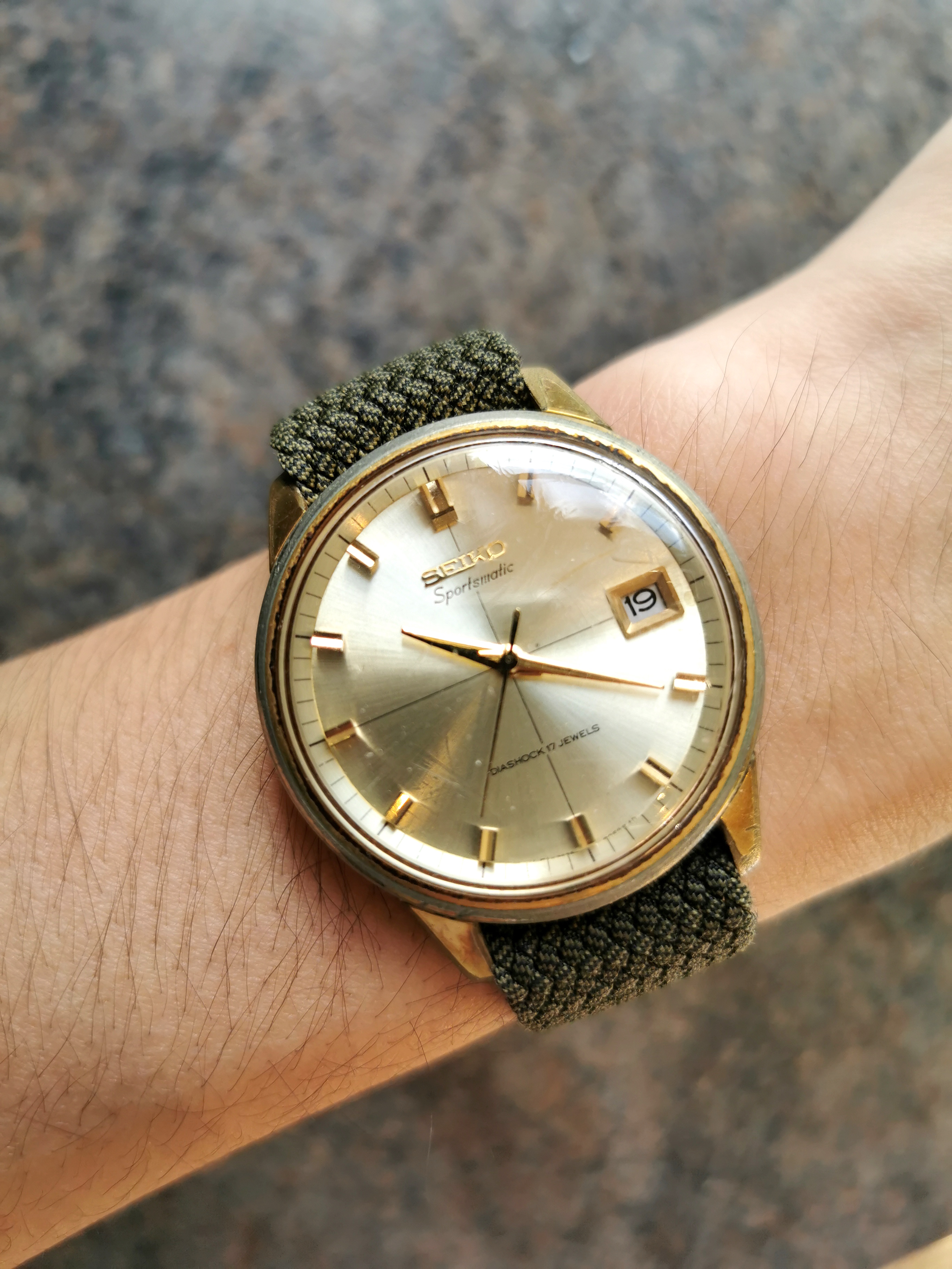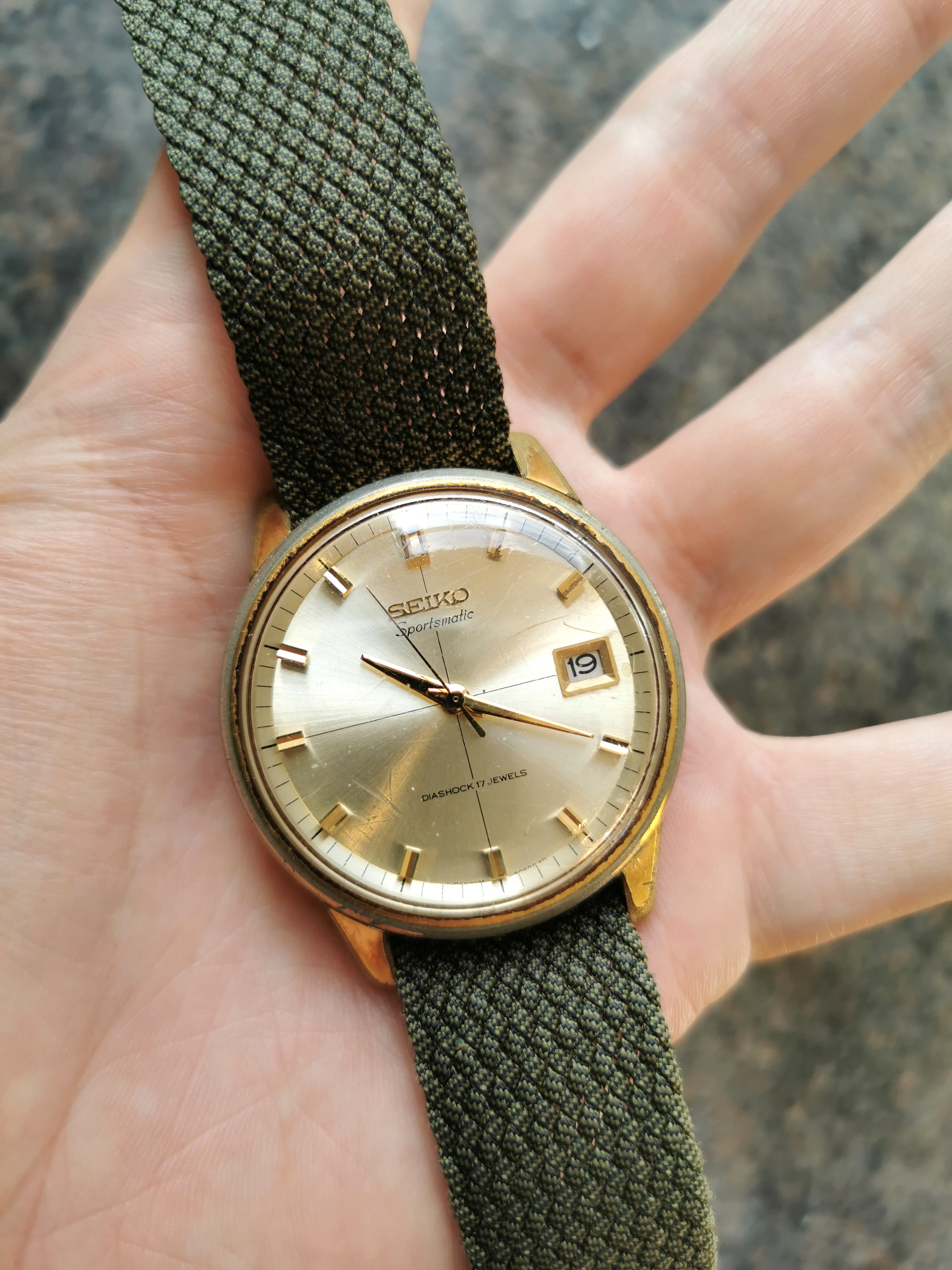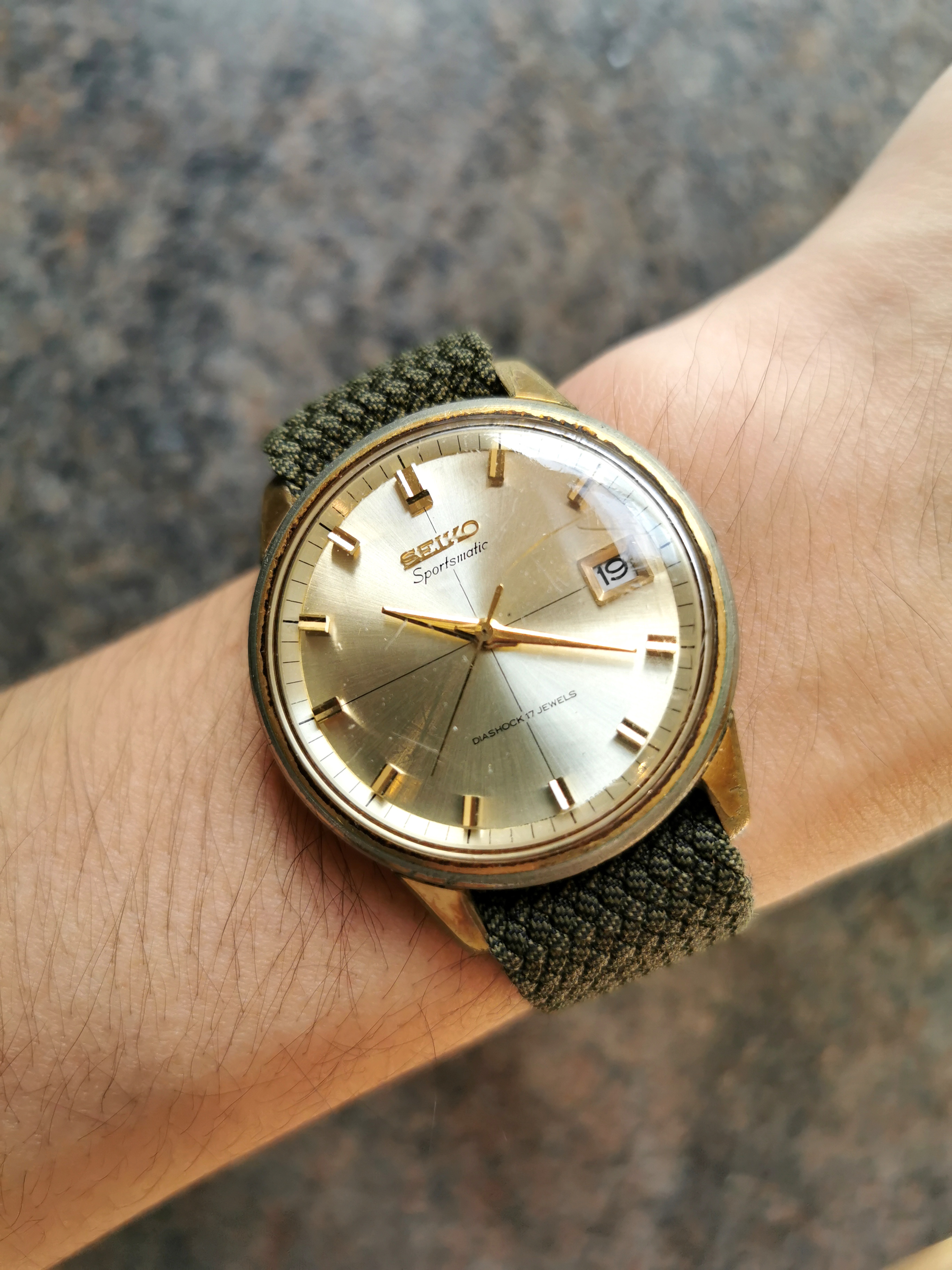 In my opinion, a less common variant of the Sportsmatic diashocks you see elsewhere. There is a chip and some scratches to the crystal, and gold plating on case is worn. Watches runs well the moment you pick it up and shake. For daily use, please consider a service.
