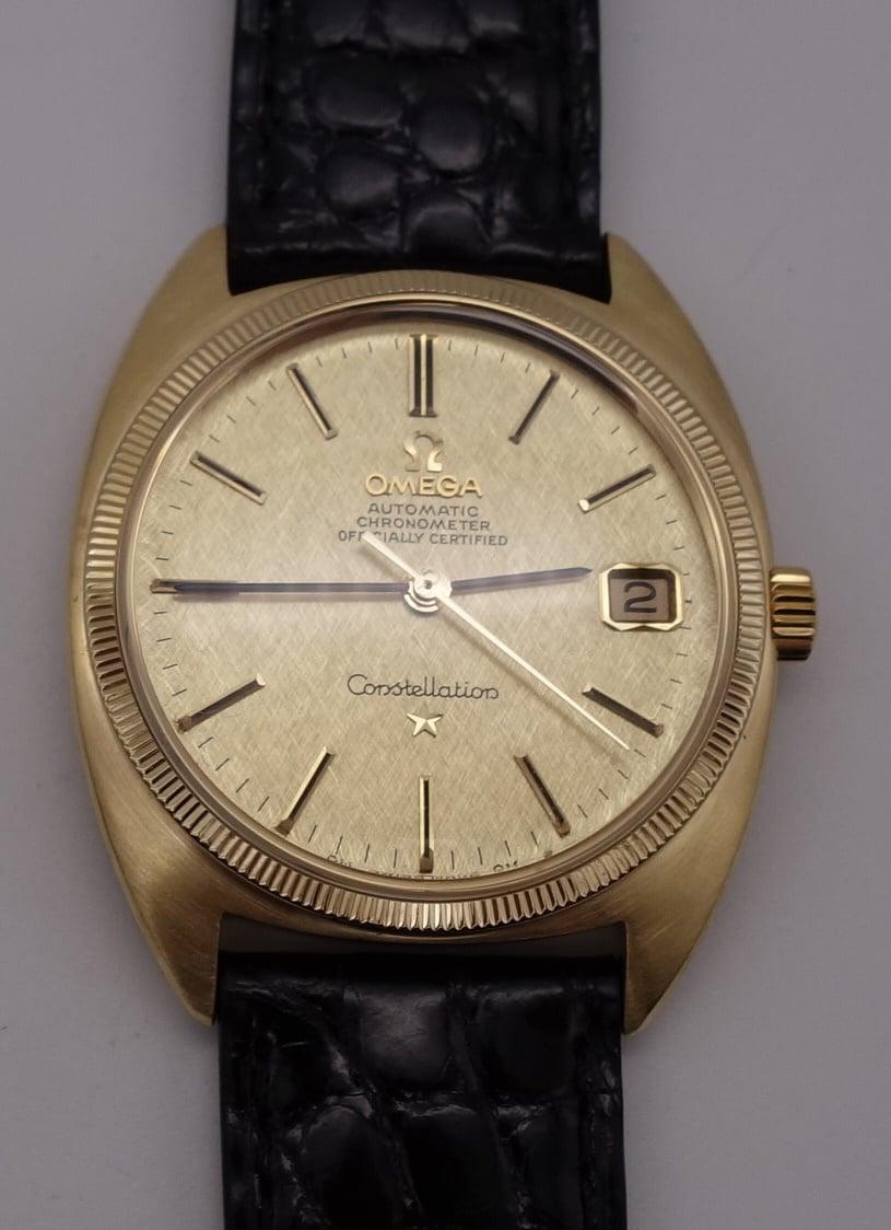 "Truly an exceptional beautiful beast you got there! It's a full gold version which you guesses right, it got cal 1021. It came around 1972, early 70s if I recall, designed for Omega by Gerald Genta. Finding one is rare enough. And seems that yours "suffered" an over polished case which the satin finish is almost gone I think.... You could give it to a watchmaker nearby you to make it how it should be. Supposed to be he flagship of Omega at the time given by its first high frequency calibre that runs at rate 28800 bph or 4Hz, which in its time was regarded as the fast beat calibre. And its movement is pretty thin too, around 3-4 mm in height, including the oscillating weight which is pretty cool to have. But I still don't know why most collectors does not consider these hidden jewels from Omega. The problem is the thin movement. It's thin enough, that some times the reverser wheel would break easily. And yeah, finishing wise... It's not as stunning as the three digits calibres. And sadly for manufacturing sake, the finishing are left behind for its effectiveness during manufacturing process. Don't worry it's still got a very nice finishing but not as elaborate as the three digit calibres, which is why most collectors have less regard. Pretty sad because this one deserves more attention, as without this, Omega would've never been as it is today.... It is supposed to be a historical piece. It opened up the opportunity of Omega to do some futuristic approach in watchmaking, with it's first and the last in-house high frequency Omega calibres. I would say congratulation to you and your piece. What you got there is an historically important piece for omega, a hidden jewel that went under the radar for the most of the connoisseurs."
