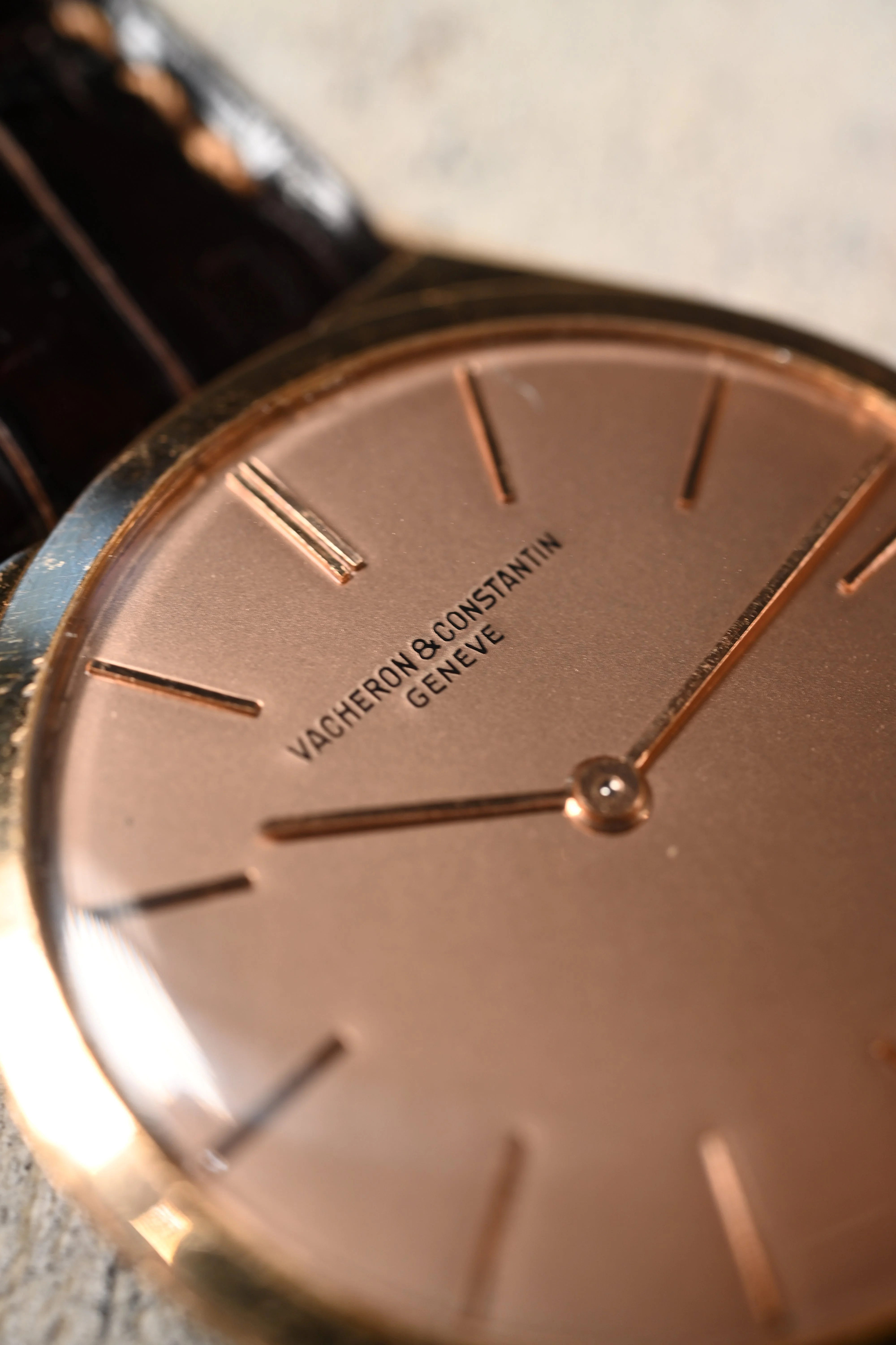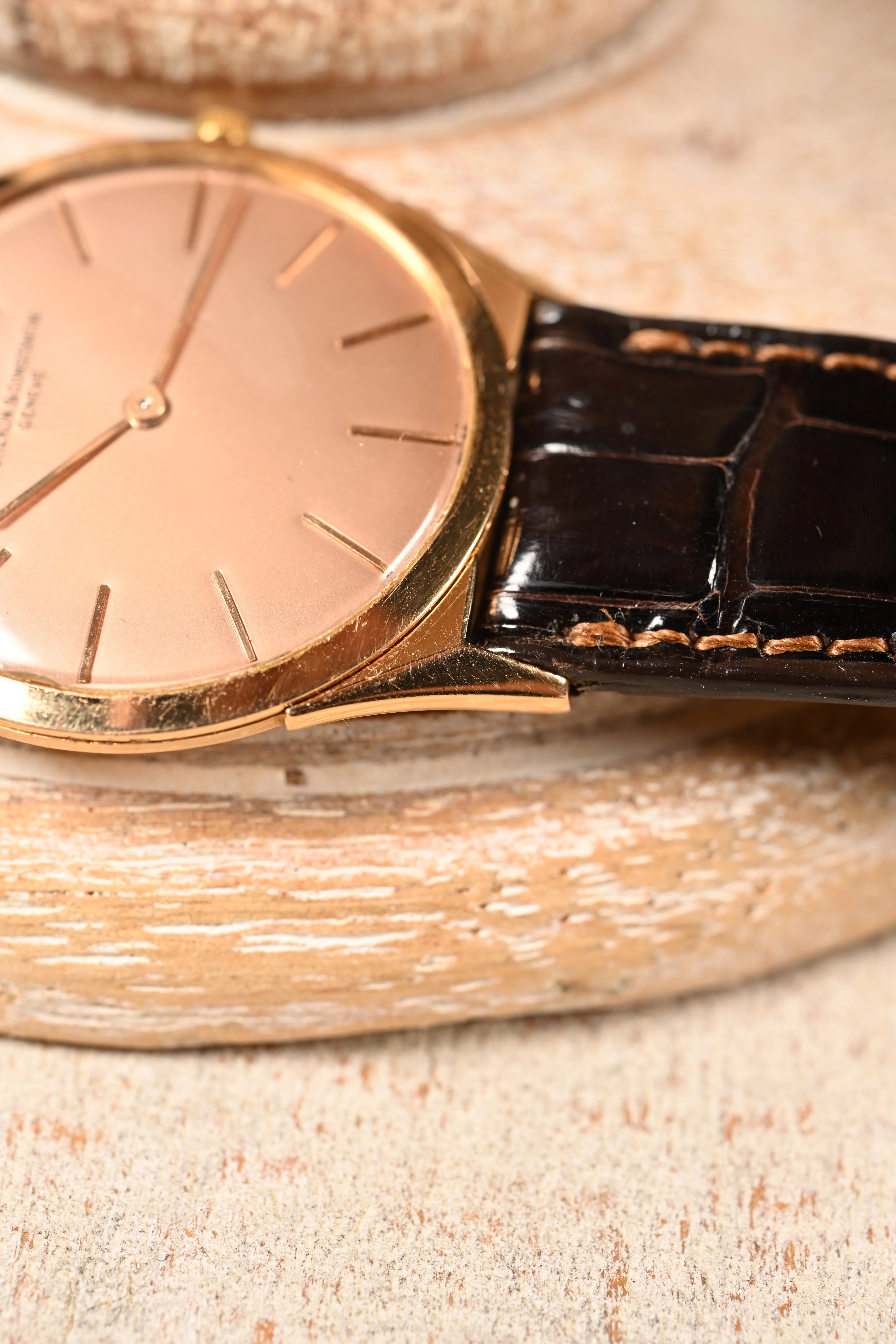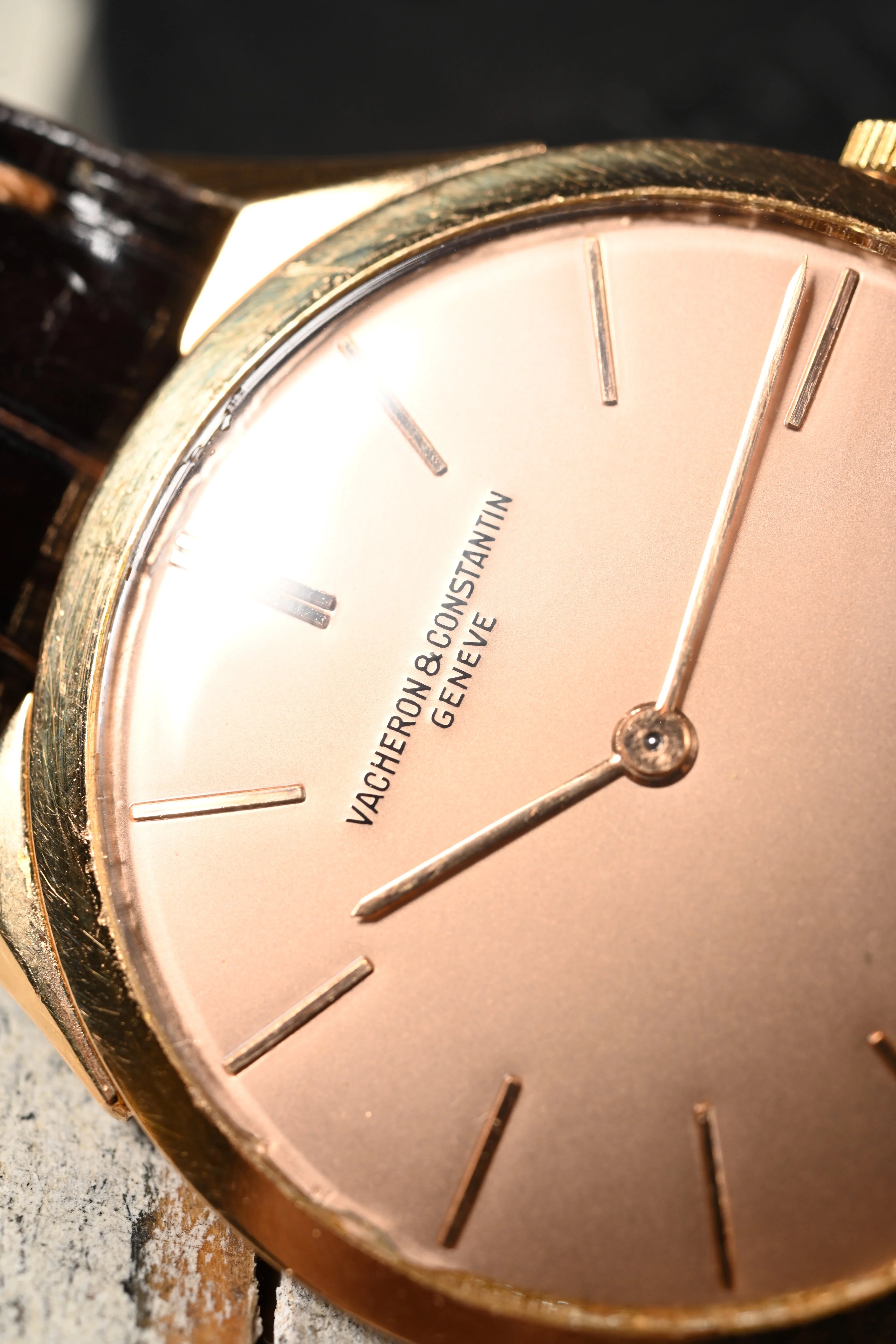 DIAL: An original pink enamel dial complete with raised enamel "Vacheron & Constantin Geneve" Signature. The raised signature is completely intact and pronounced. The dial exhibits no signs of cleaning. There is one very faint, small dot near the 6 o'clock hour marker than can be seen during certain lighting and viewing angles.