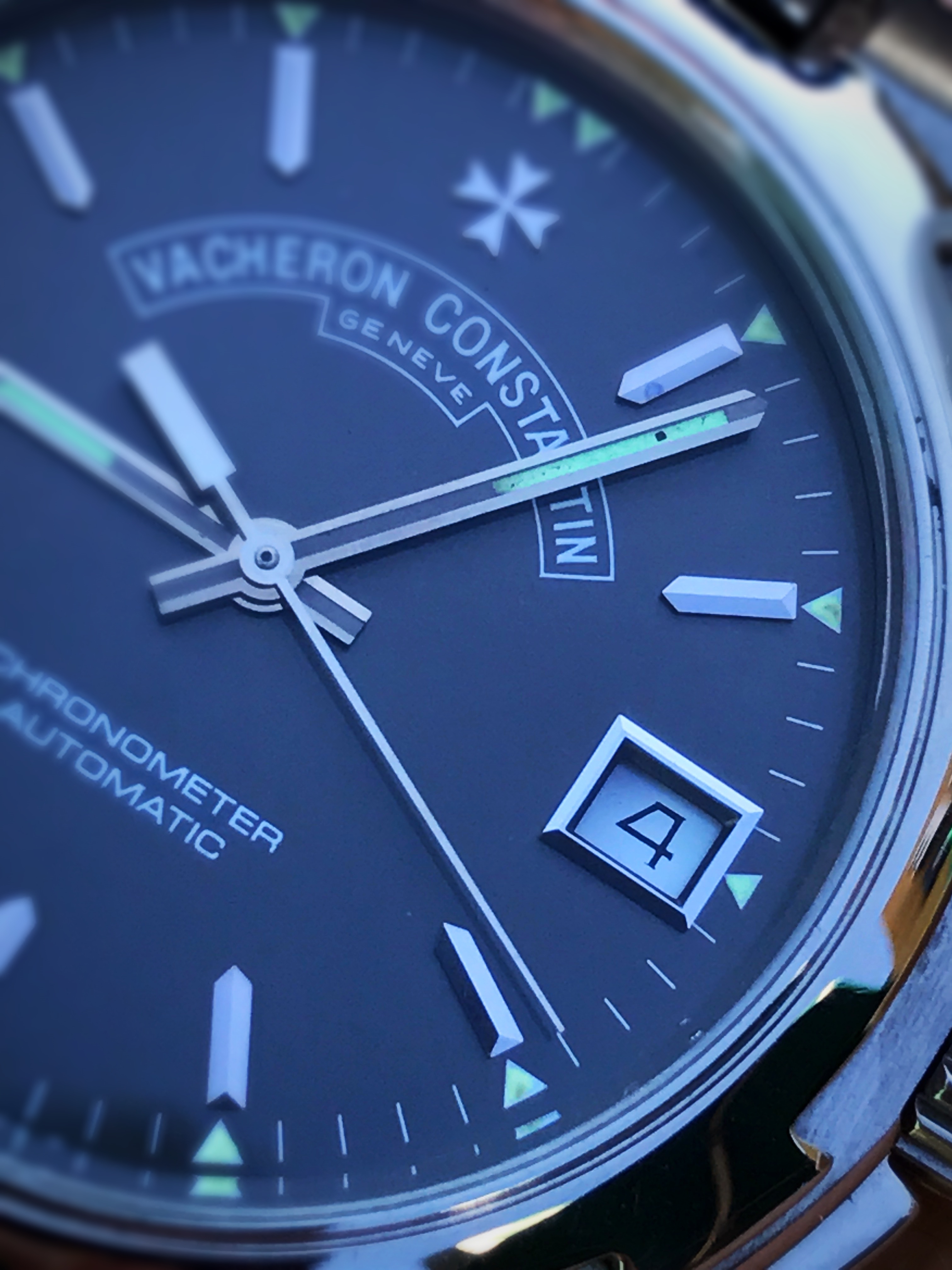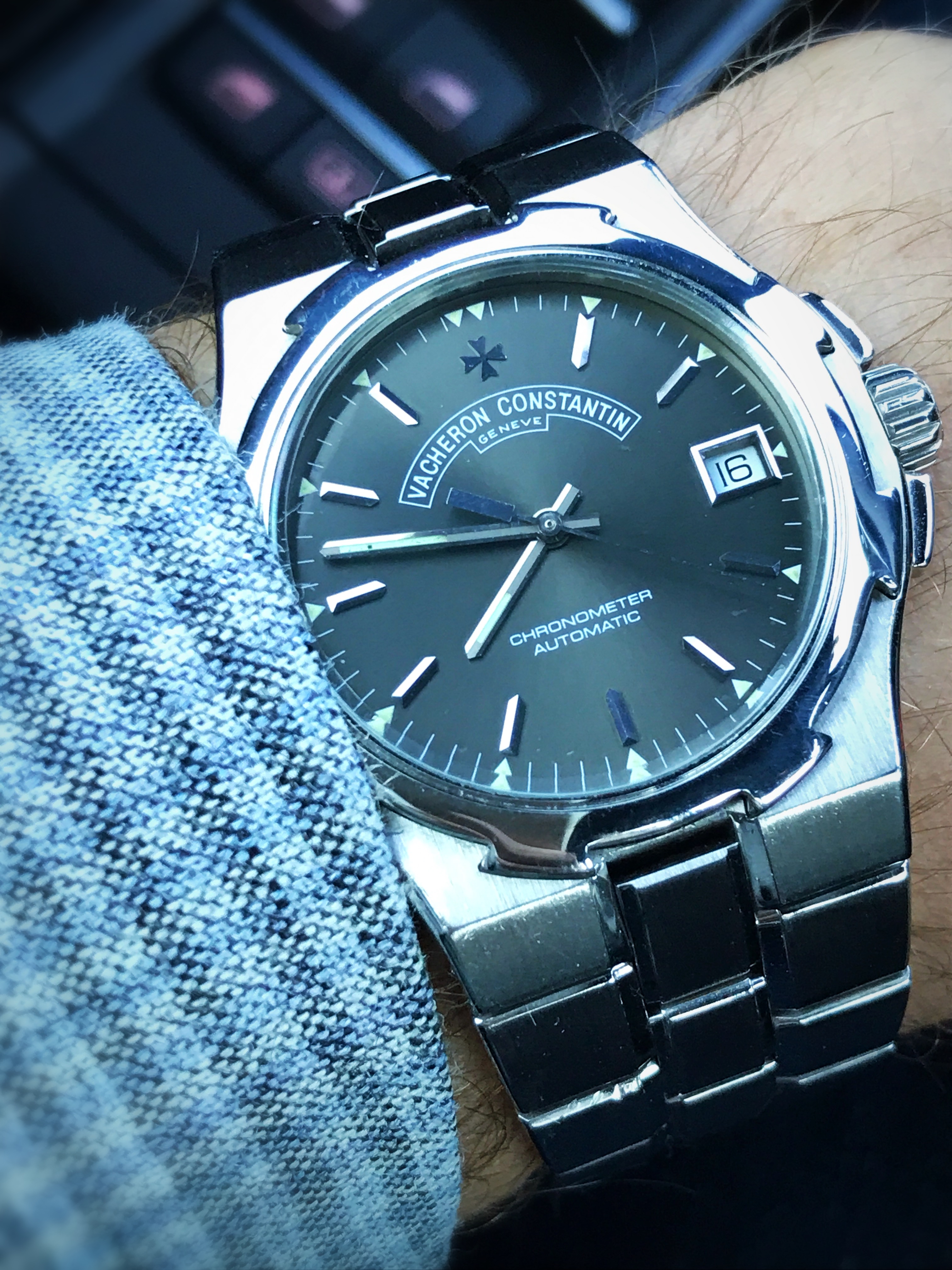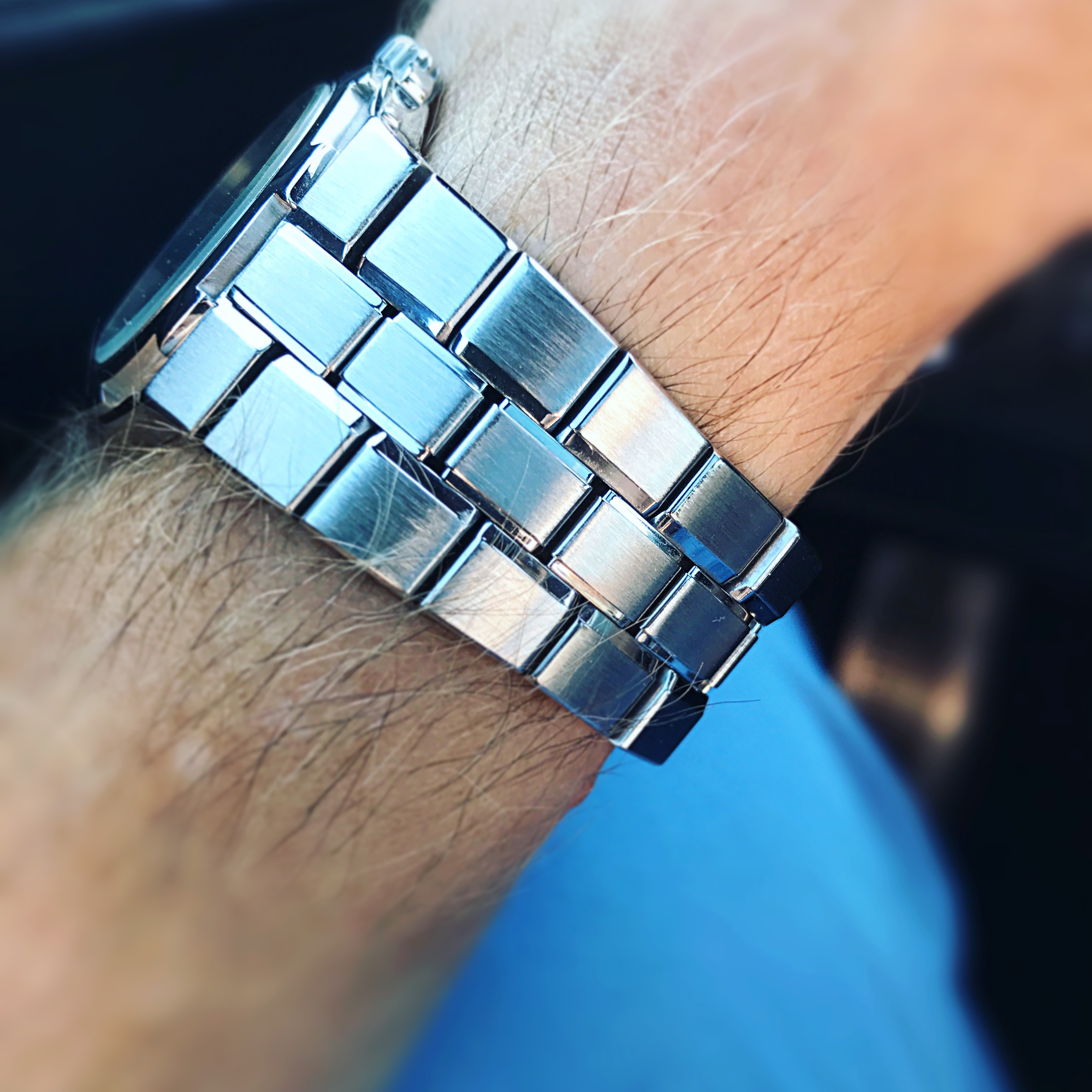 Very good condition 1st addition Overseas . Keeps good time , grey sunburst tritium dial , Sapphire crystal, integrated bracelet does show some wear a couple small nicks and light scratches.. come s with 3 removable links .. probably fit up to 7 inch wrist