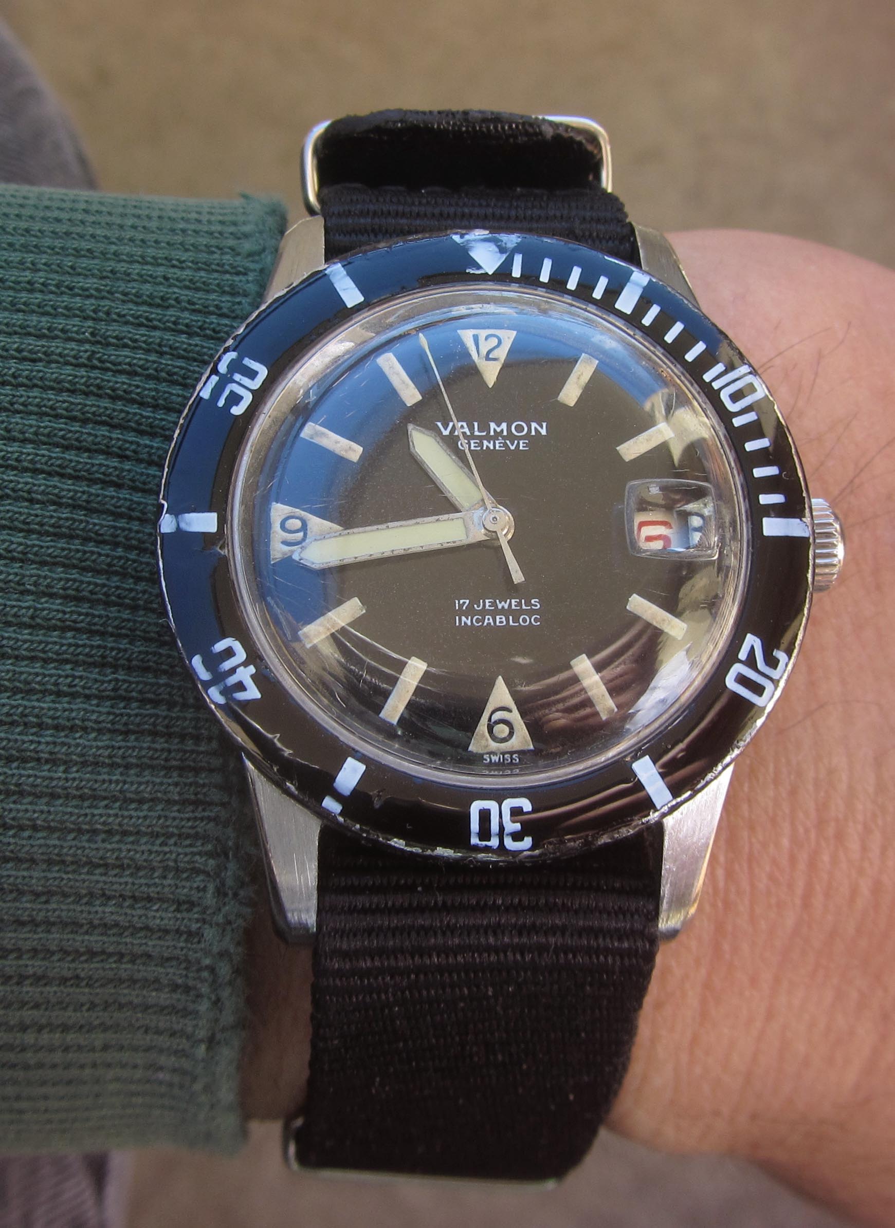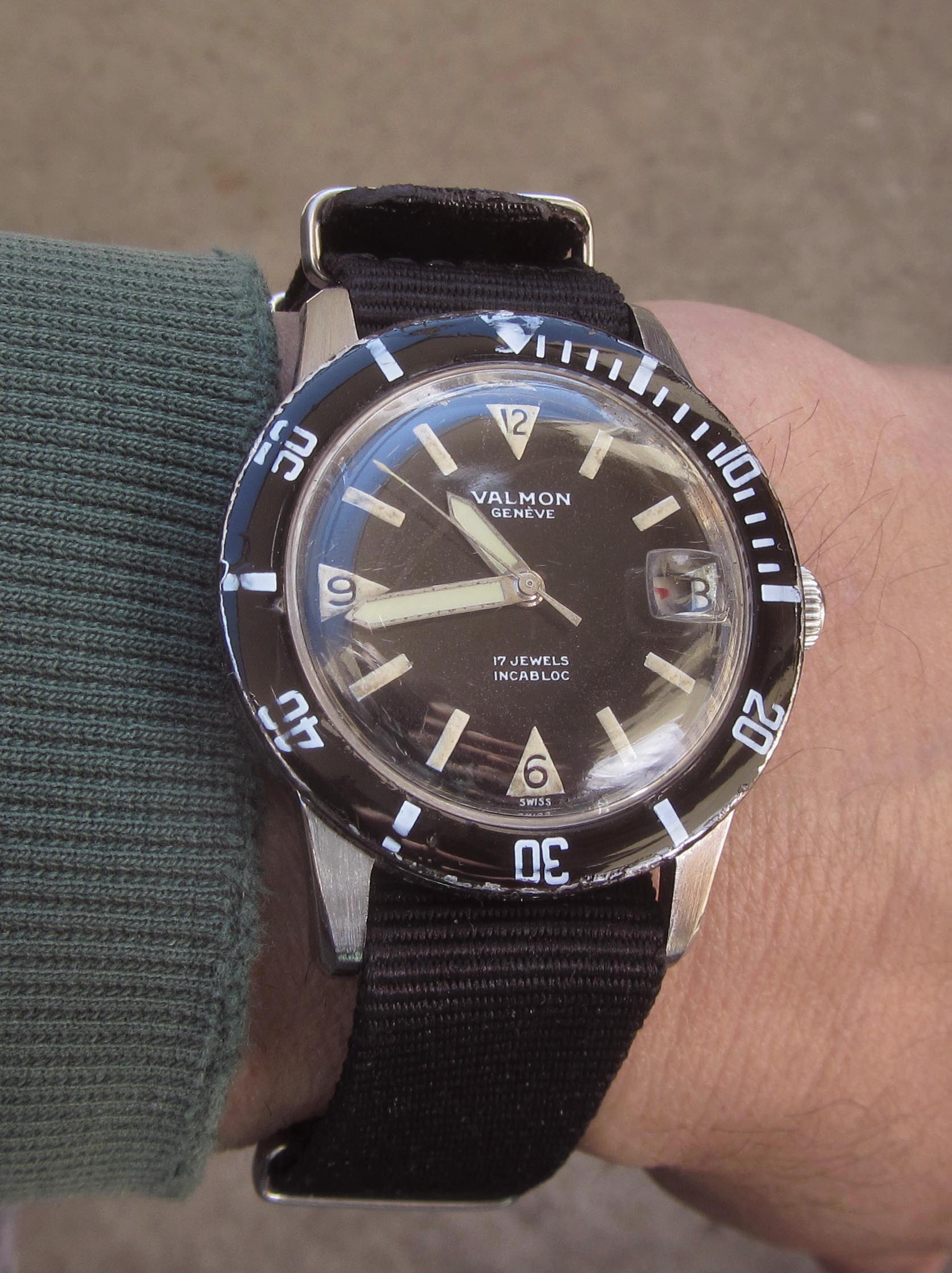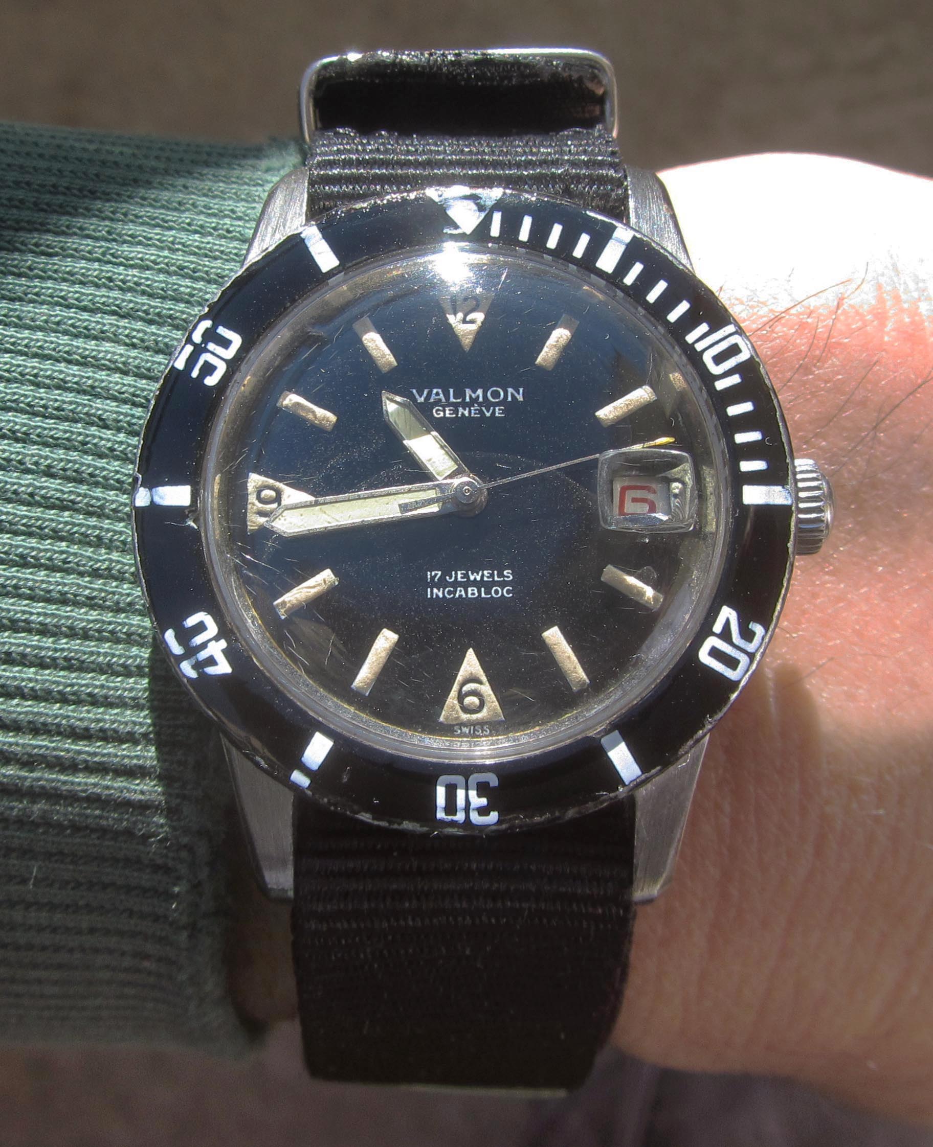 This year, a "Valmon"* 1195 diver's watch (never heard of it before) in a screw-down 36mm steel case, with black radium gloss dial and red date display. Inside works a Felsa 692 Bidynator, which still shows a bit that it´s a 40s construction. And it runs really fine.