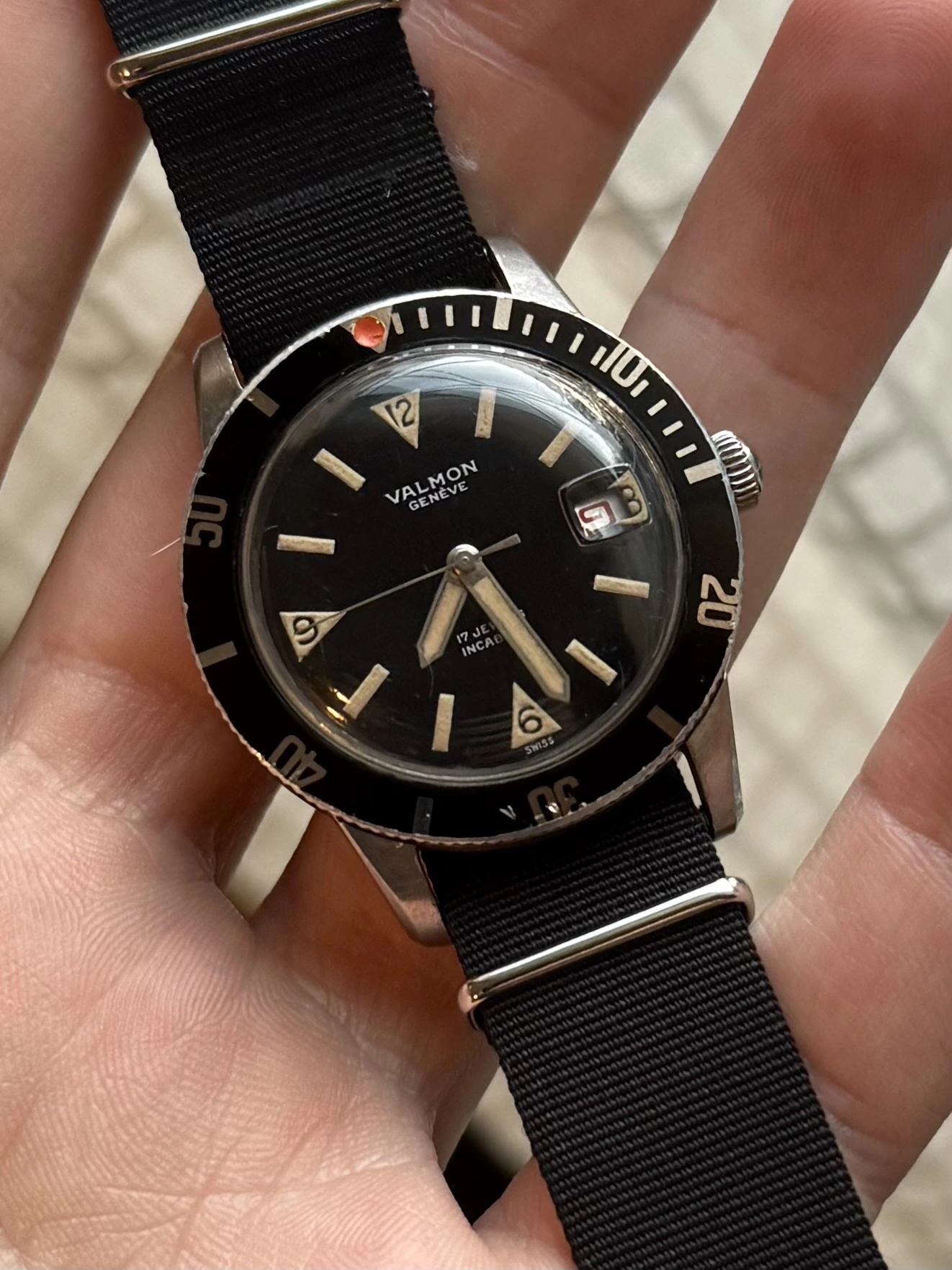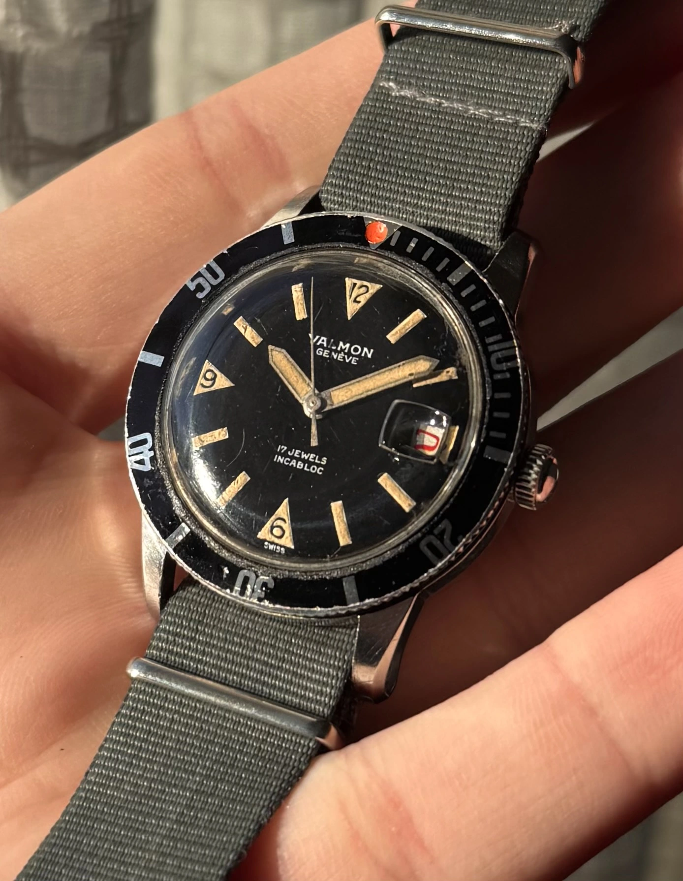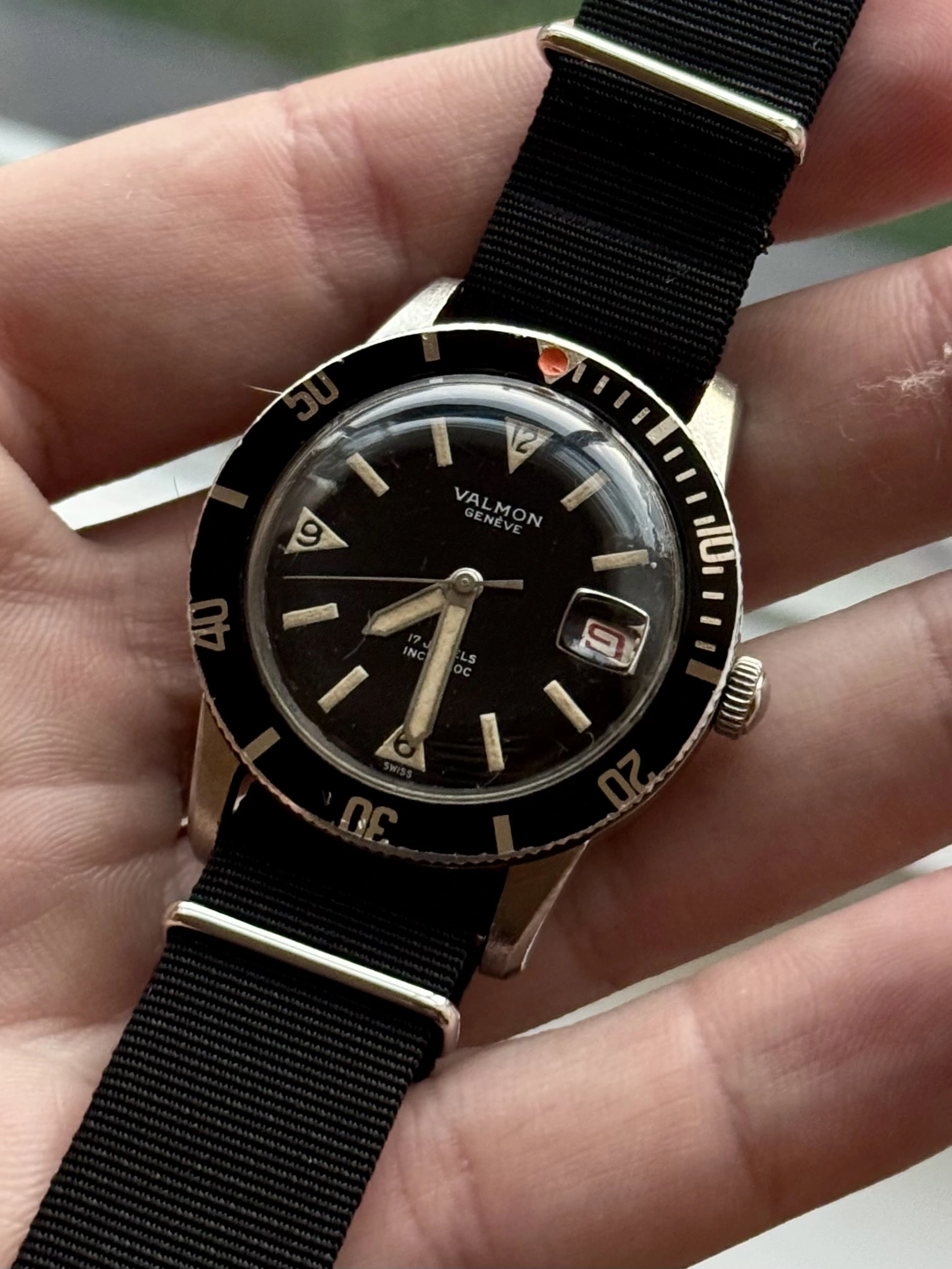 This year, a "Valmon"* 1195 diver's watch (never heard of it before) in a screw-down 36mm steel case, with black radium gloss dial and red date display. Inside works a Felsa 692 Bidynator, which still shows a bit that it´s a 40s construction. And it runs really fine.