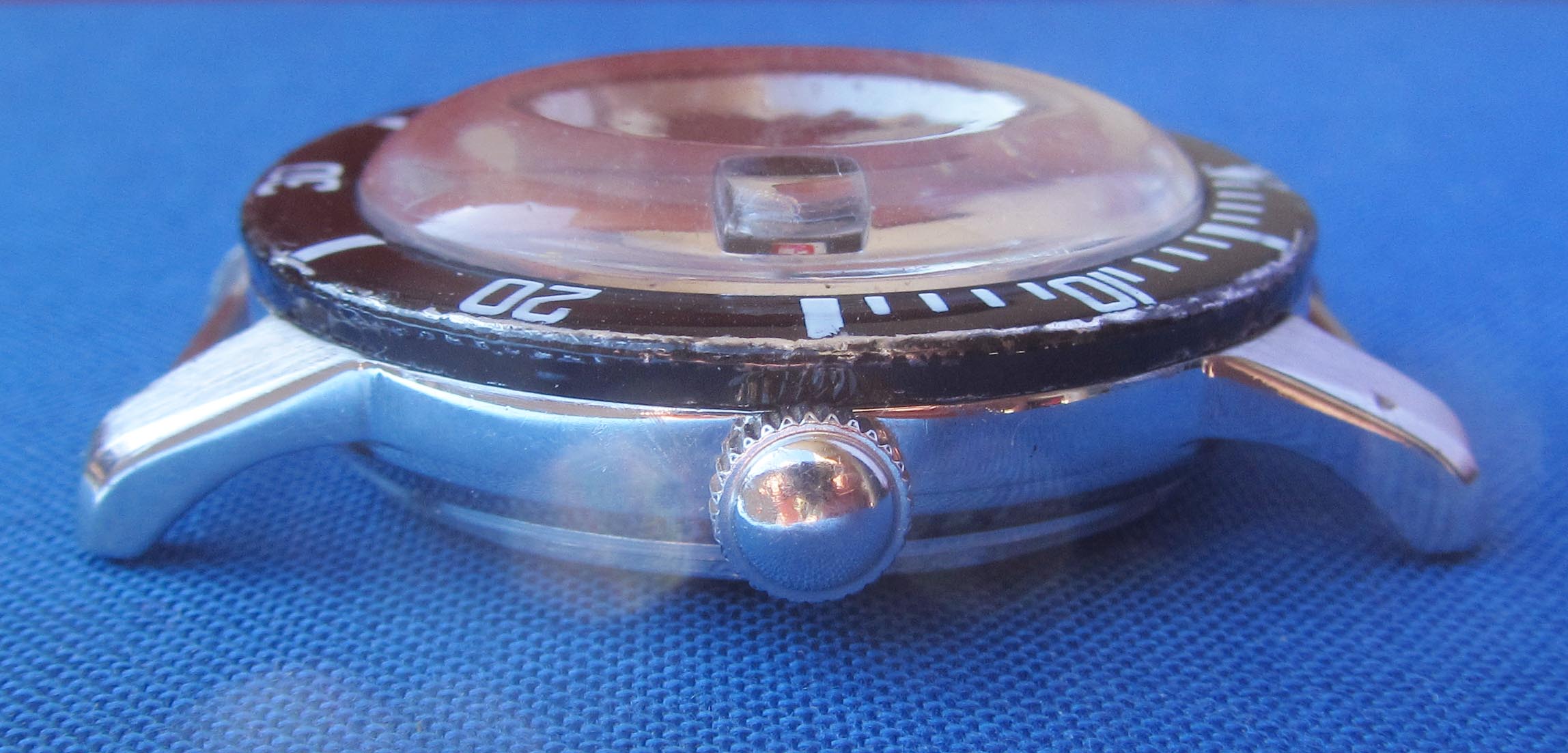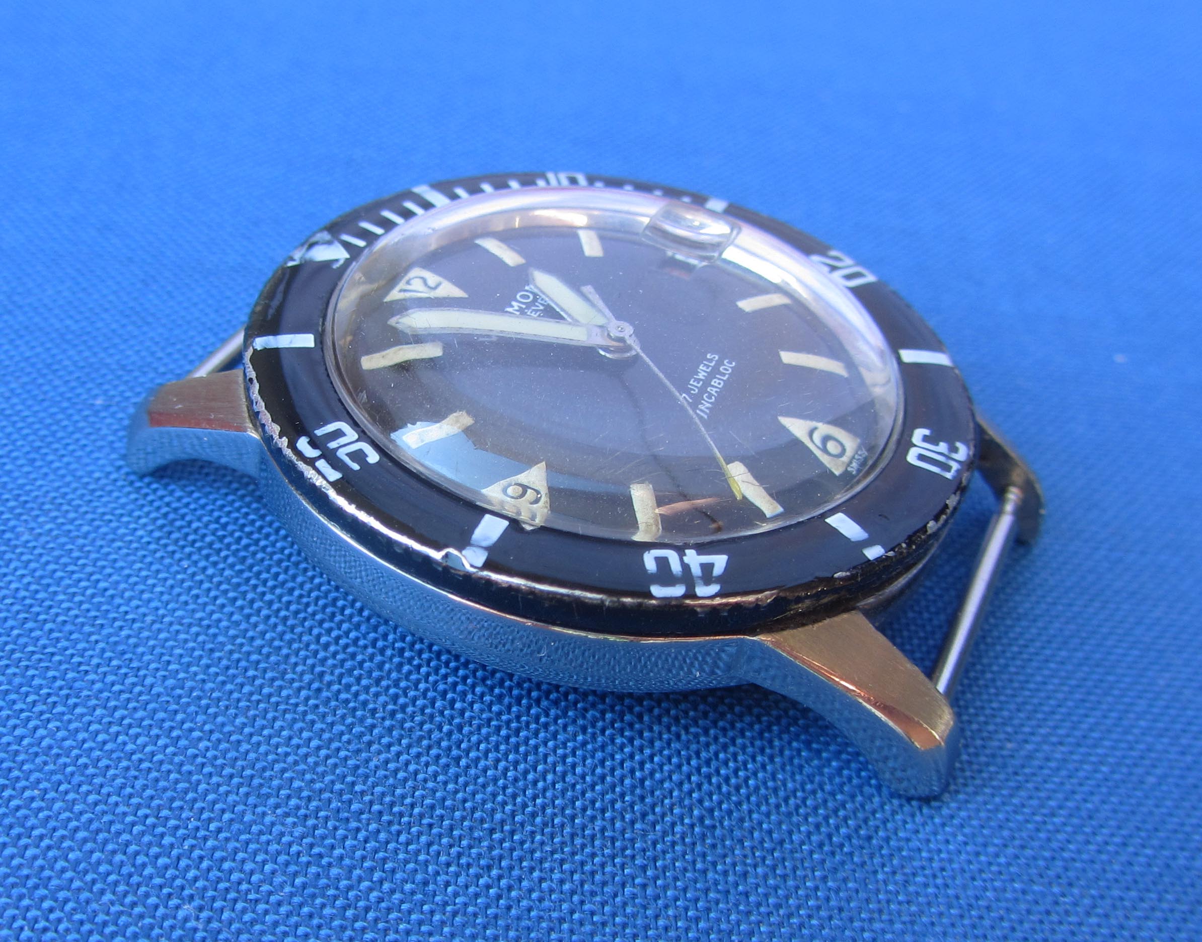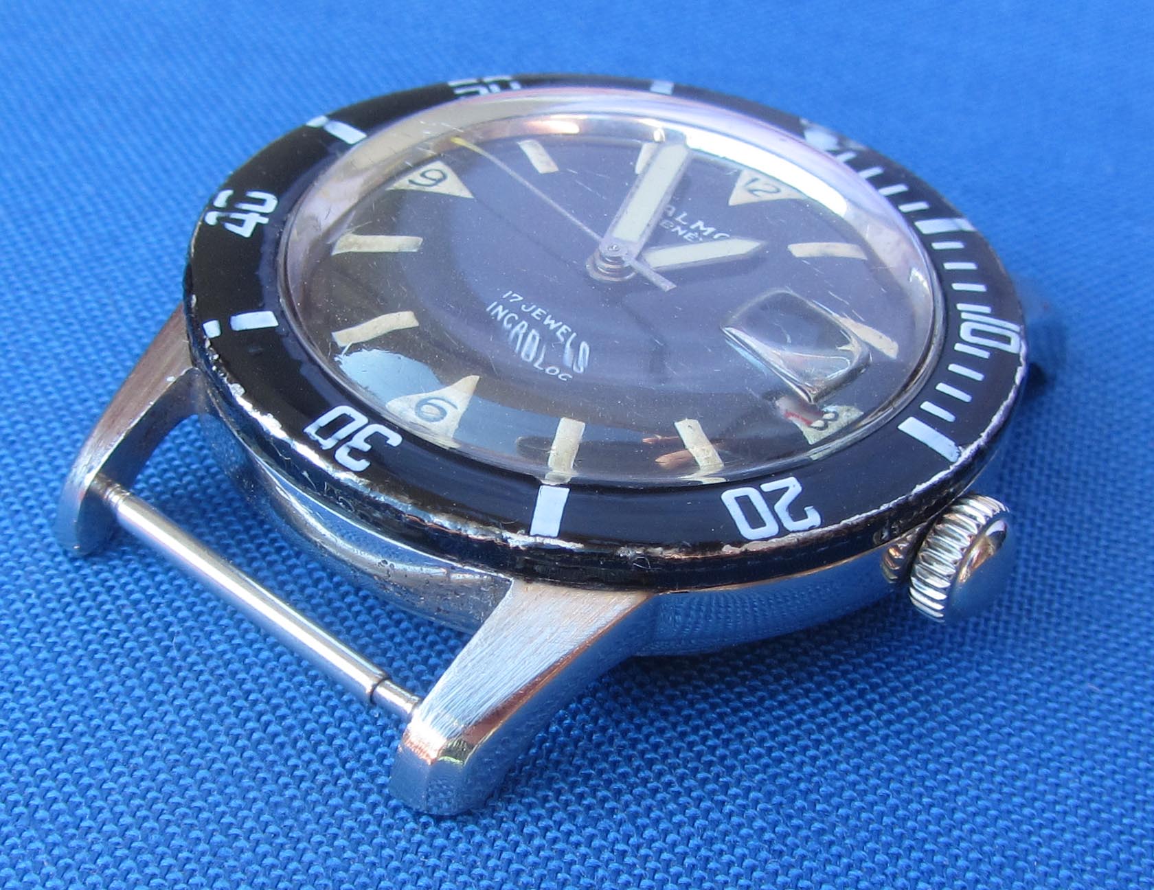 The dial reminds of early KonTiki´s or Certinas with baroque radium decor, the red numerals on the date disc adding some visual excitement. Funnily enough, they didn't just omit the "3" in favor of the date window, but cut it. The glass with the date magnifier inside is probably still the first one. At least quite old, because of the stress cracks.
