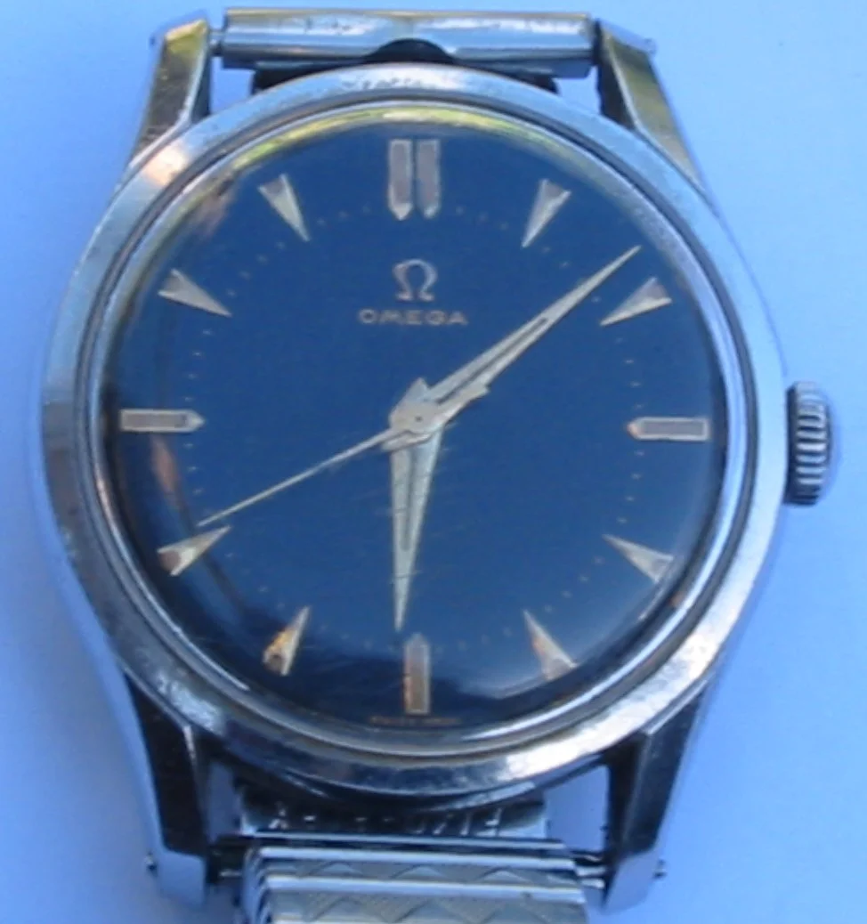 From the OTTUHR website, it seems have been made in 1952 (a long time before my purchase) and is unusual in that it has no Arabic numerals, a black face and the minute markings are at the end of the faceted dagger indices and not at the rim of the dial. For almost 70 years I have thought that its elegant simplicity was a typical Omega design without realising the enormously wide range of design options that were available.