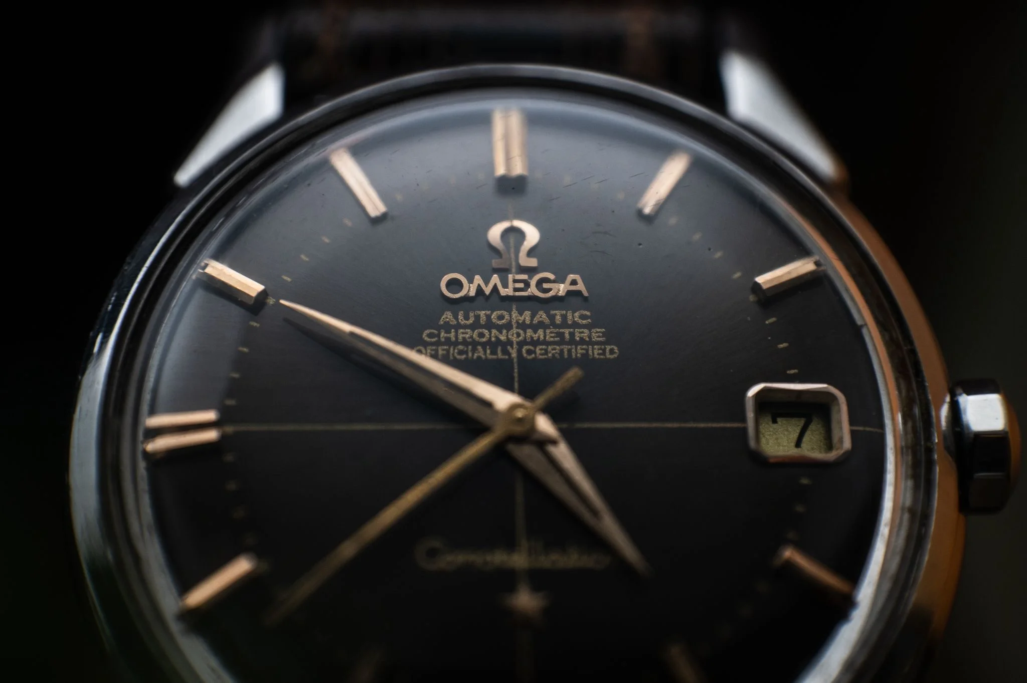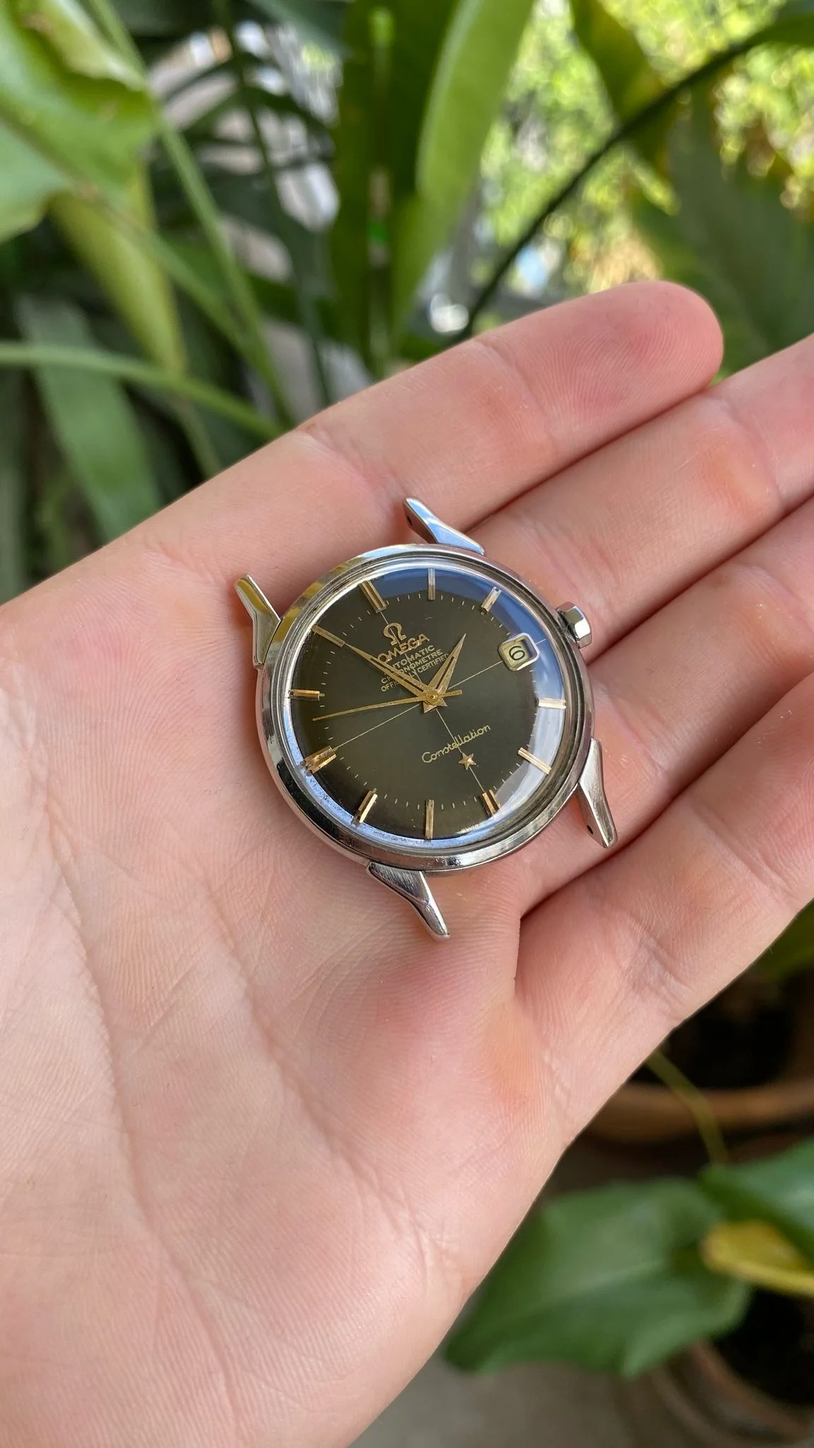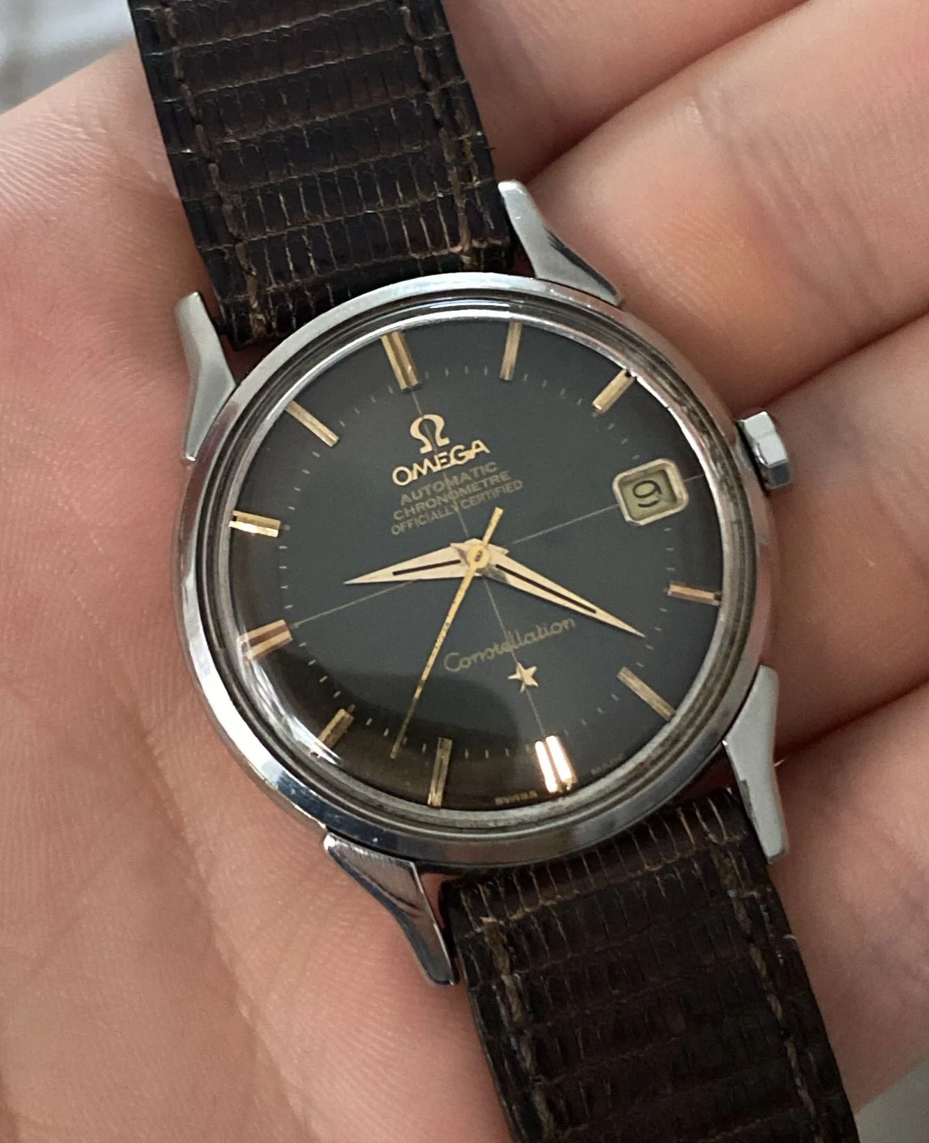 Condition and Authenticity: The markers and hands have not been altered. The plexiglass was replaced with a new piece, which is likely not original to Omega since it lacks the engraving in the center (though some original plexiglass models also lack this engraving). The markers are not lumed. This is correct for this specific Constellation model, as it doesn’t have lume, unlike other models like the perpetual calendar that do. The crown is original. The case is in very good condition, with no indication of polishing, as the characteristic eight stars on the Constellation caseback remain sharp and well-defined. he quick date change function works perfectly.