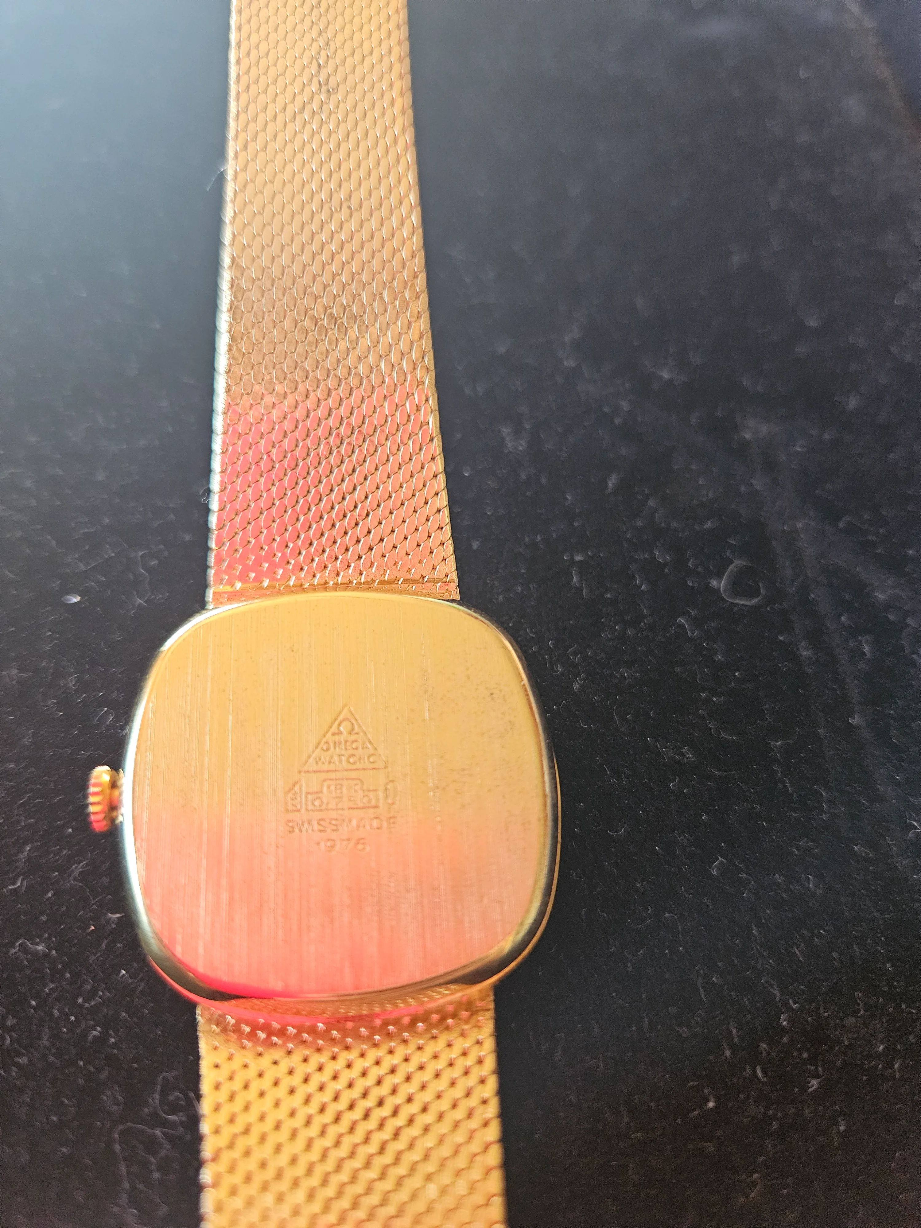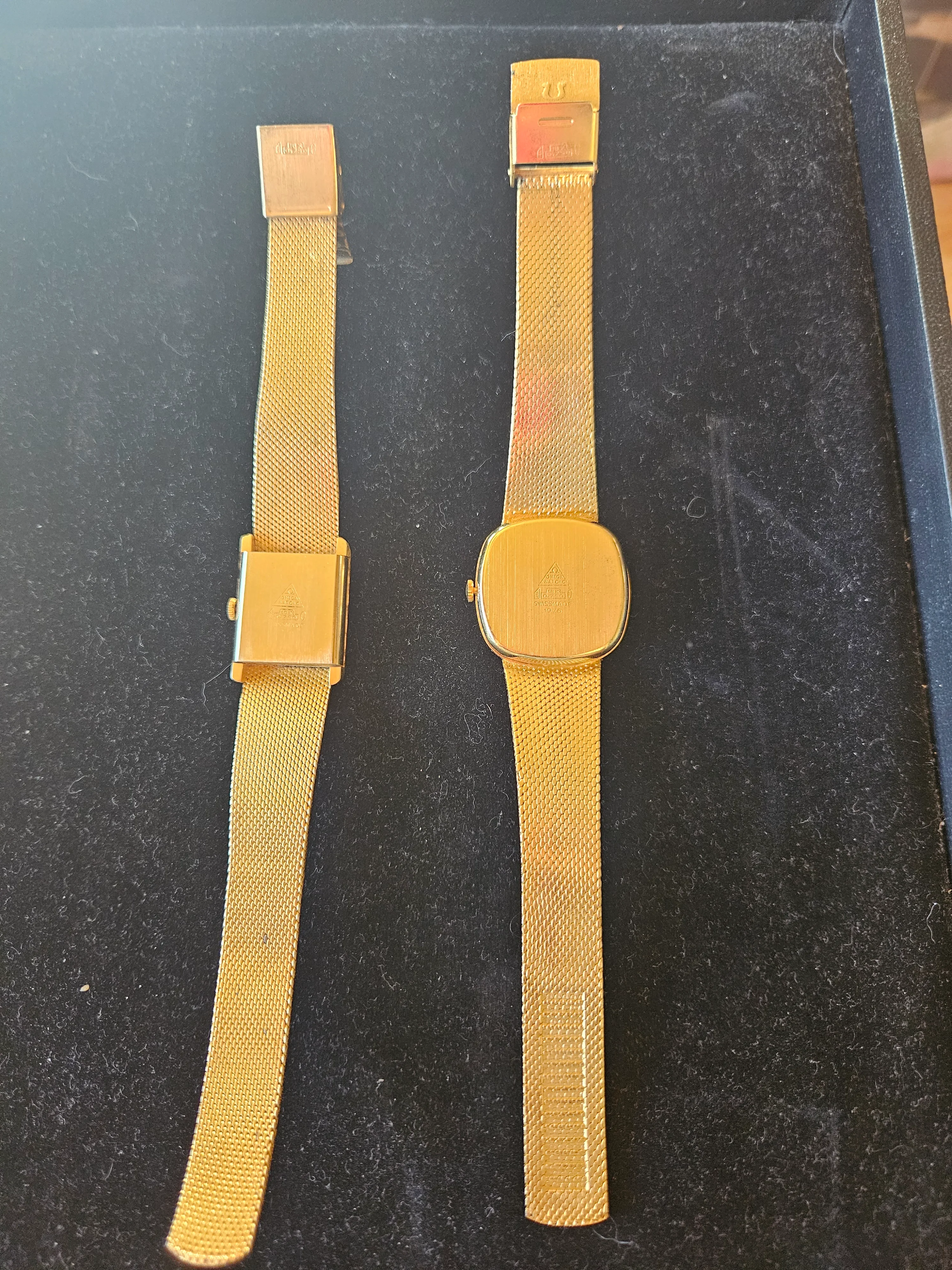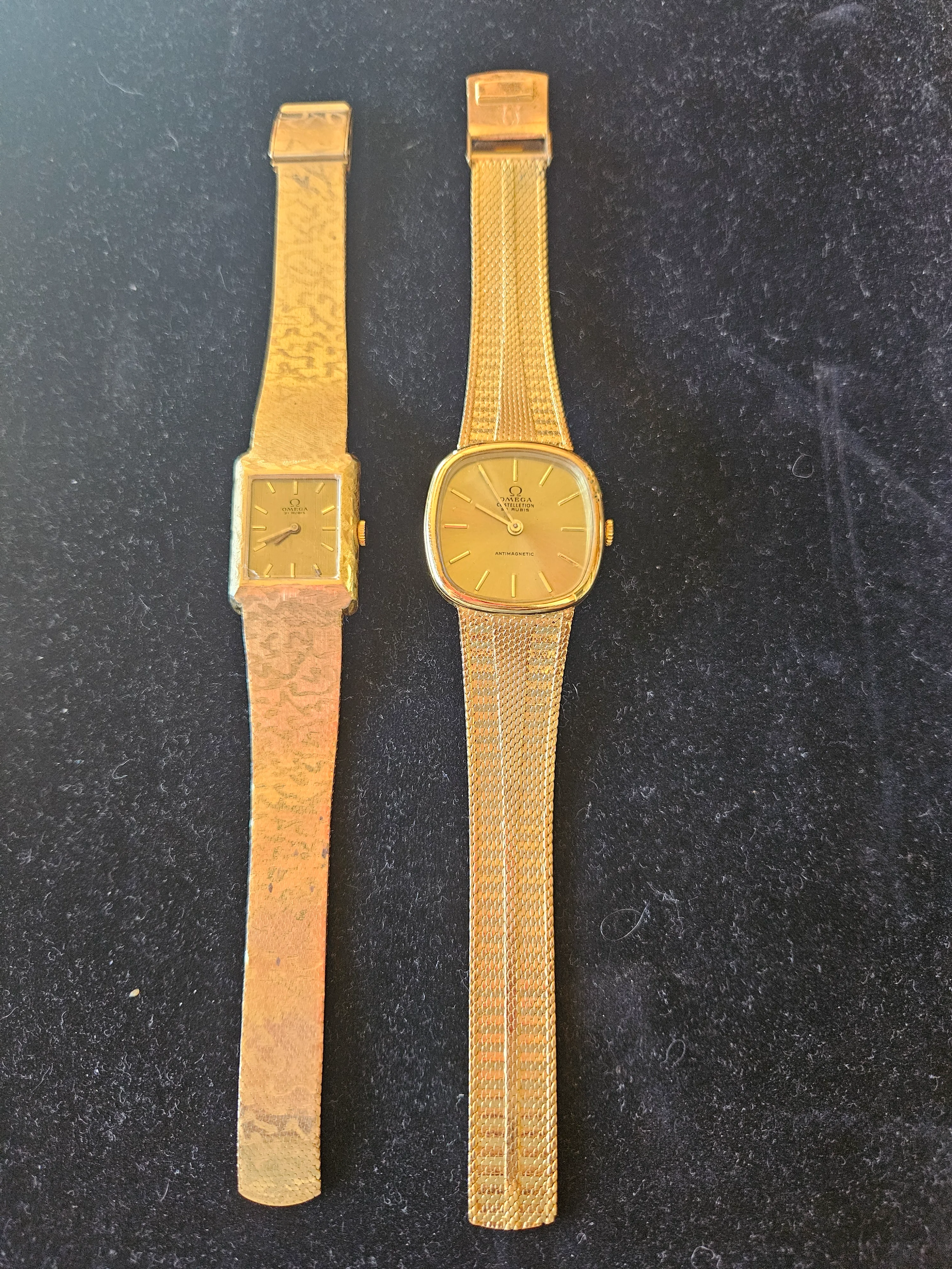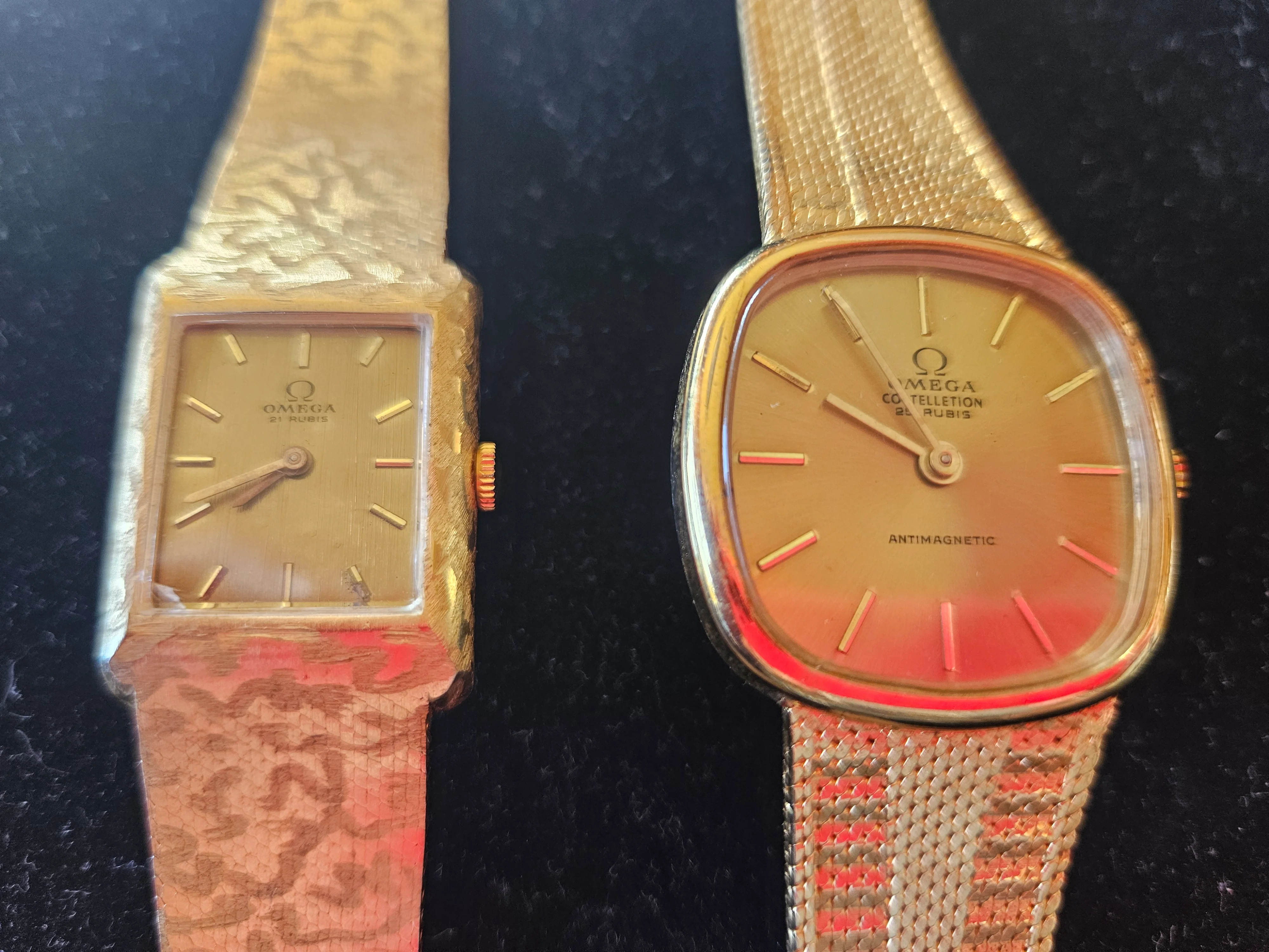 You should have the watches checked by someone who can verify the quality of the cases and bracelets. The definition in the photo of the one is indistinct, but the other one shows .750 which means 18 karat. Have the cases and bracelets tested to see if the stampings are true. With gold at over $3,300 (US) per ounce, the price yield should take that into consideration. Genuine Omegas won’t have these types of stamping on the exterior of the case back, so don’t expect the value to be much higher than scrap value.