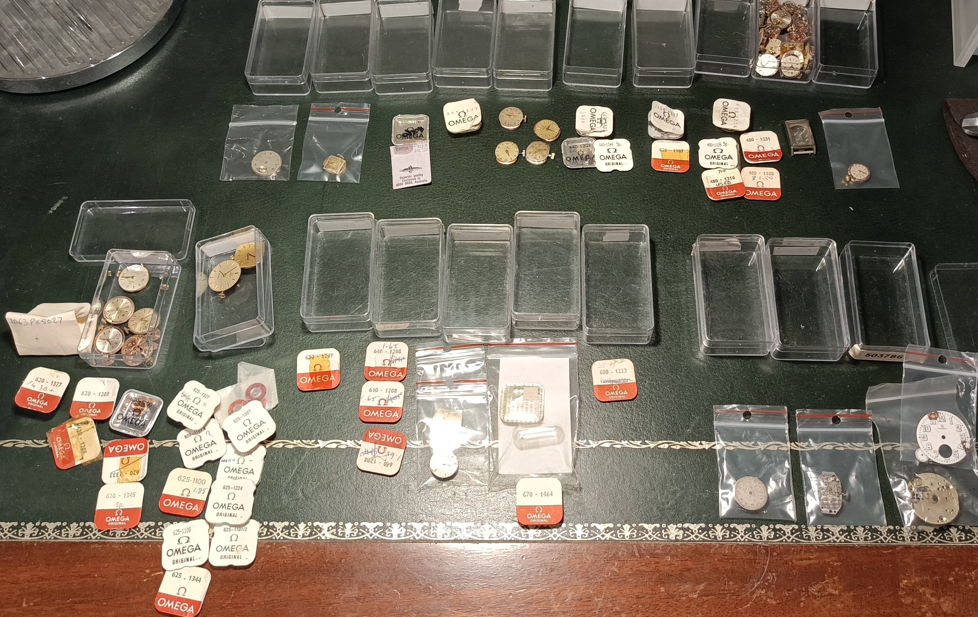 Cal. 620 mechanism (x4) one ticking, crystal, mainspring barrel (x2), balance wheel, regulator arm, incabloc bolt (x5)