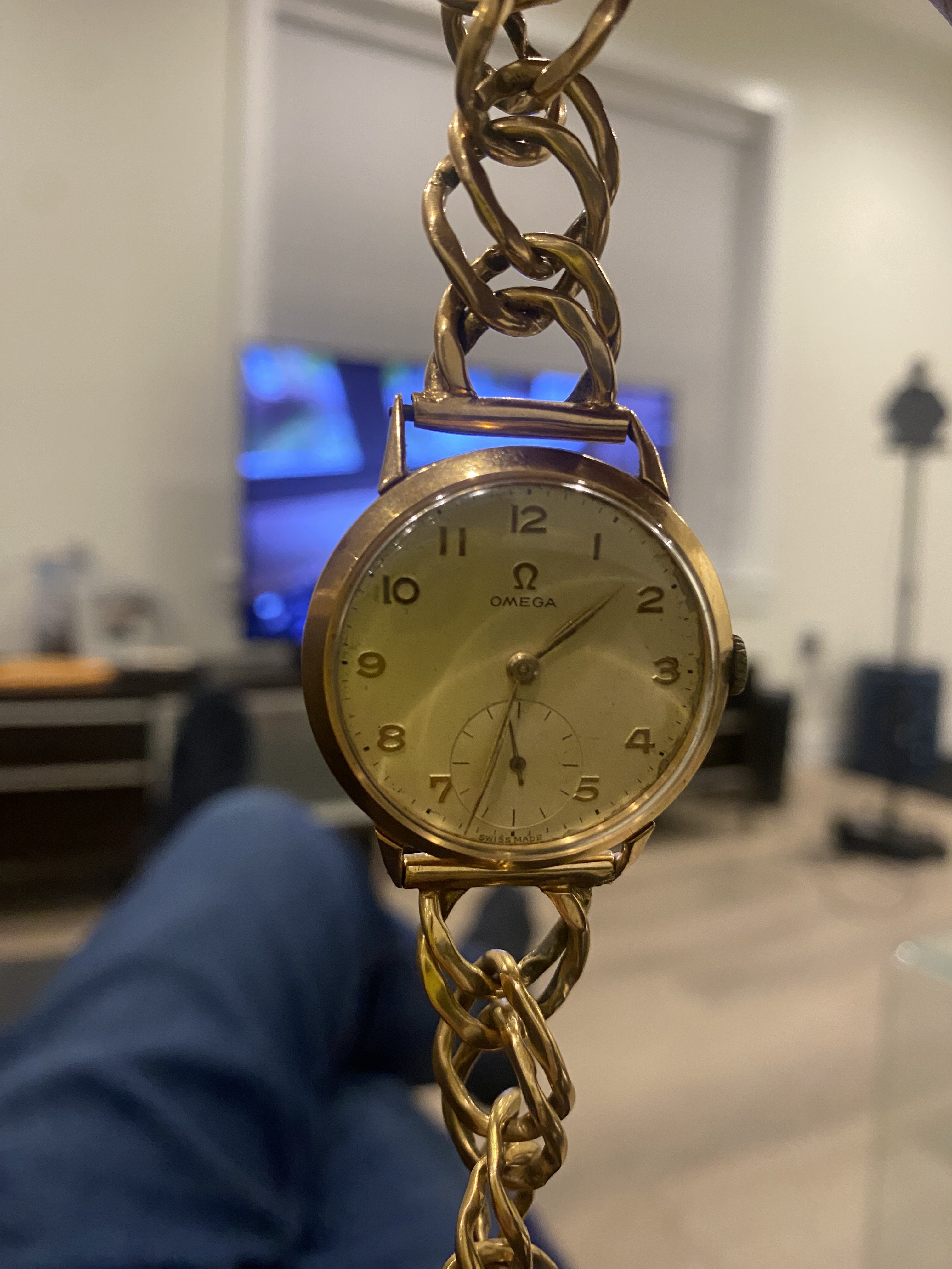 ·That is a very emotional watch, I don't want to sell it. It belonged to my father, a wedding present from my grandmother to him. Making story short, he has a very difficult time, so the watch was not well maintained. Starting the thread, I don't know the model, it's 18k gold, and the crown has not omega symbol. it is not work properly now, I intend to fix it soon. I would appreciate any starting point. I would like to bring it as the day was given to him. Thanks beforehand. I'm in Canada, British Columbia.