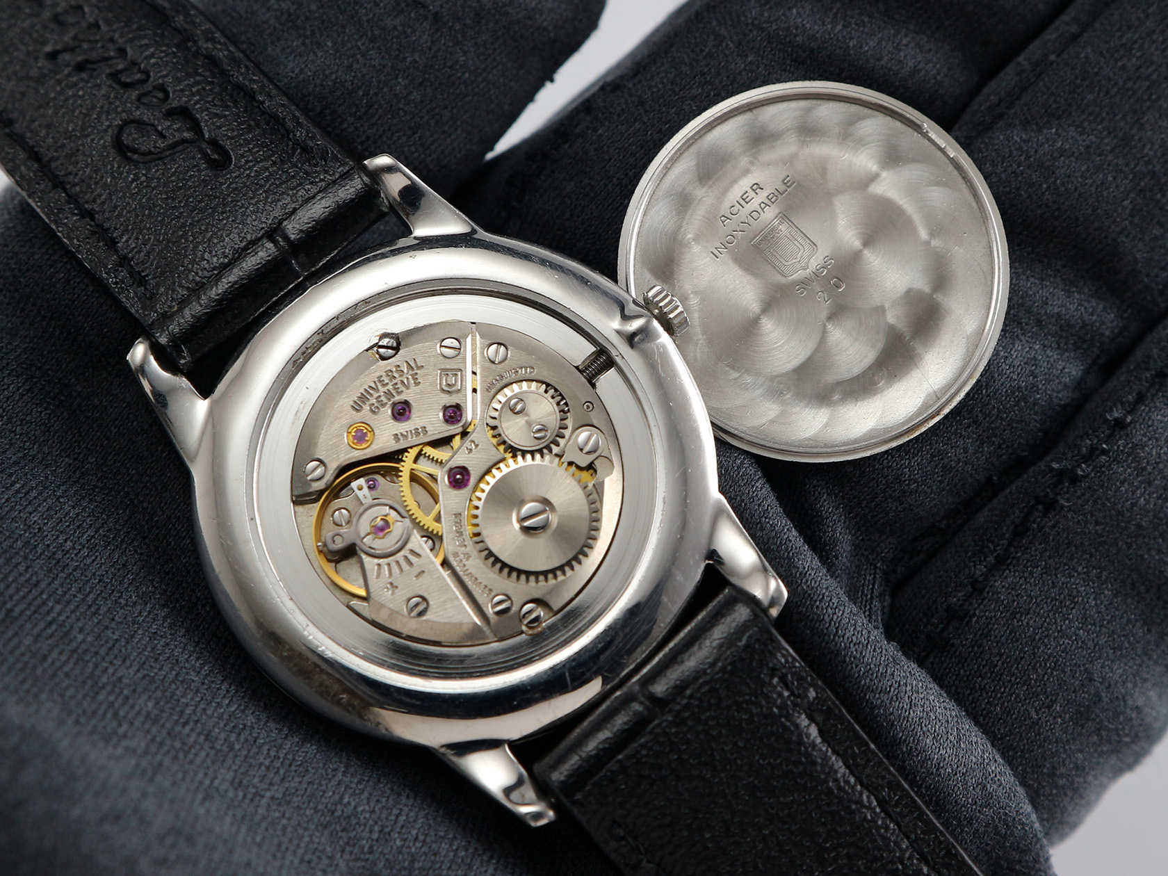 ·Up for sale is a very nice UG dress watch Ref. 542101. The original dial with Roman numerals is in great condition. The case is unpolished and in great shape plus the original crown. It is measure 31mm wide without crown and 37.5mm lug to lug, lug width is 16mm. Thanks to the ultra-slim profile: only 6.5mm in thickness, it wears larger. Inside is the UG cal. 42, service history unknown but still running strong & keeping time.