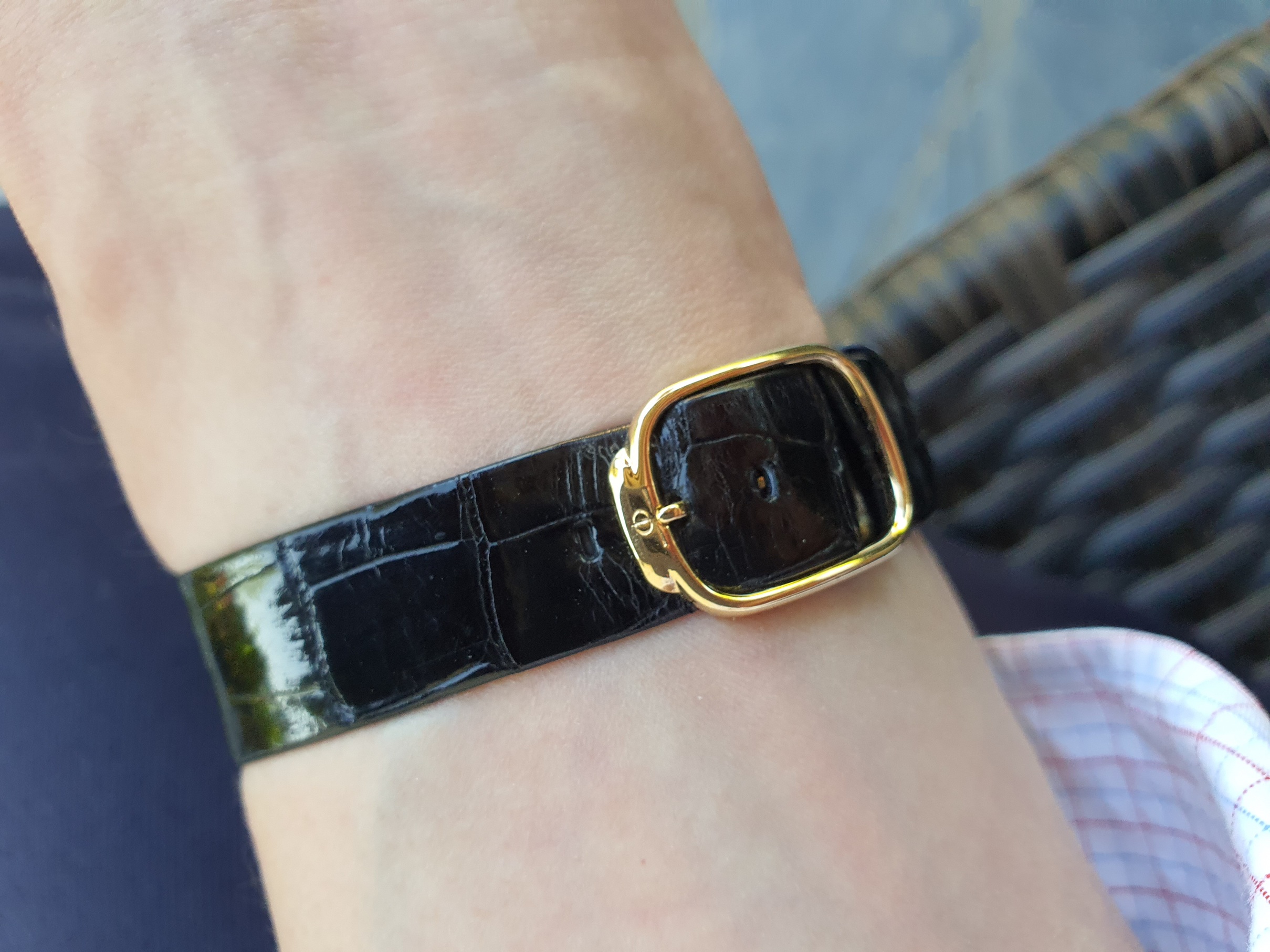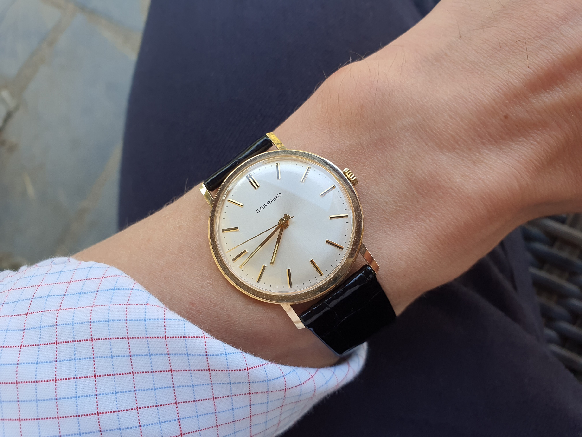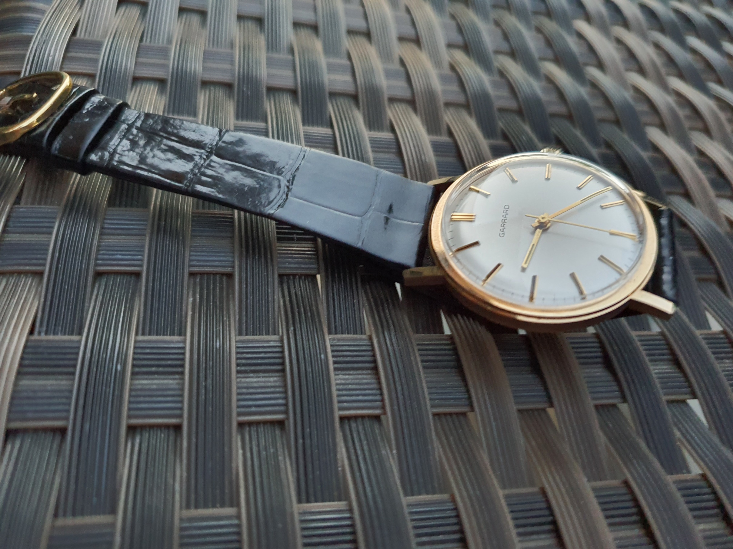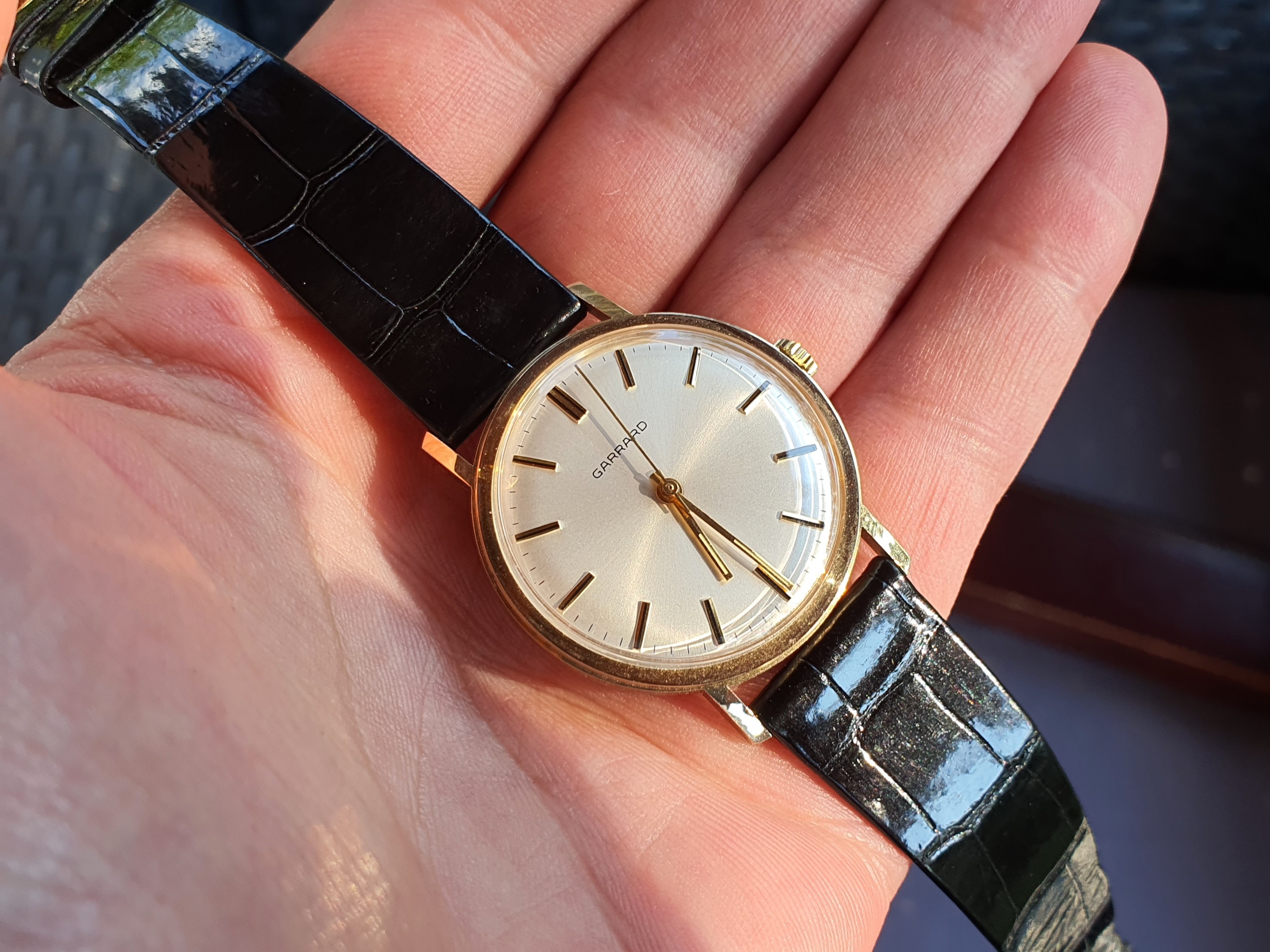 It is accompanied by its original Garrad box,original Garrad leather strap and it is fitted on very nice Rolex croco strap with Gold Plated Baume et Mercier buckle