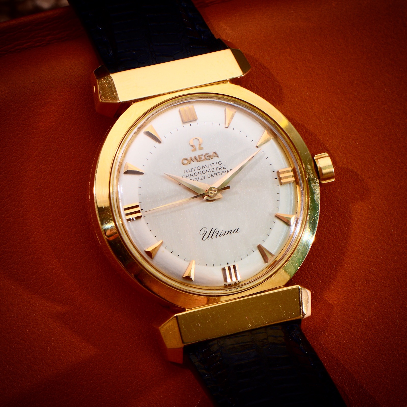 路路Ash @ 惟FFor sale is my seldom worn but well cared for OT14368 Ultima Chronometer. The Ultima is a watch that genuinely deserves the title rare, a hooded lug solid 18K gold version of the Seamaster with a Chronometer rated movement, comparable to the Constellation Grand Luxe in market positon. This pieces was serviced about 4 years ago and has been in a vault since then. It comes on a lizard print leather strap and at wears very large compared to regular 34.5mm Seamaster models due to its smooth bezel and large hooded lugs.