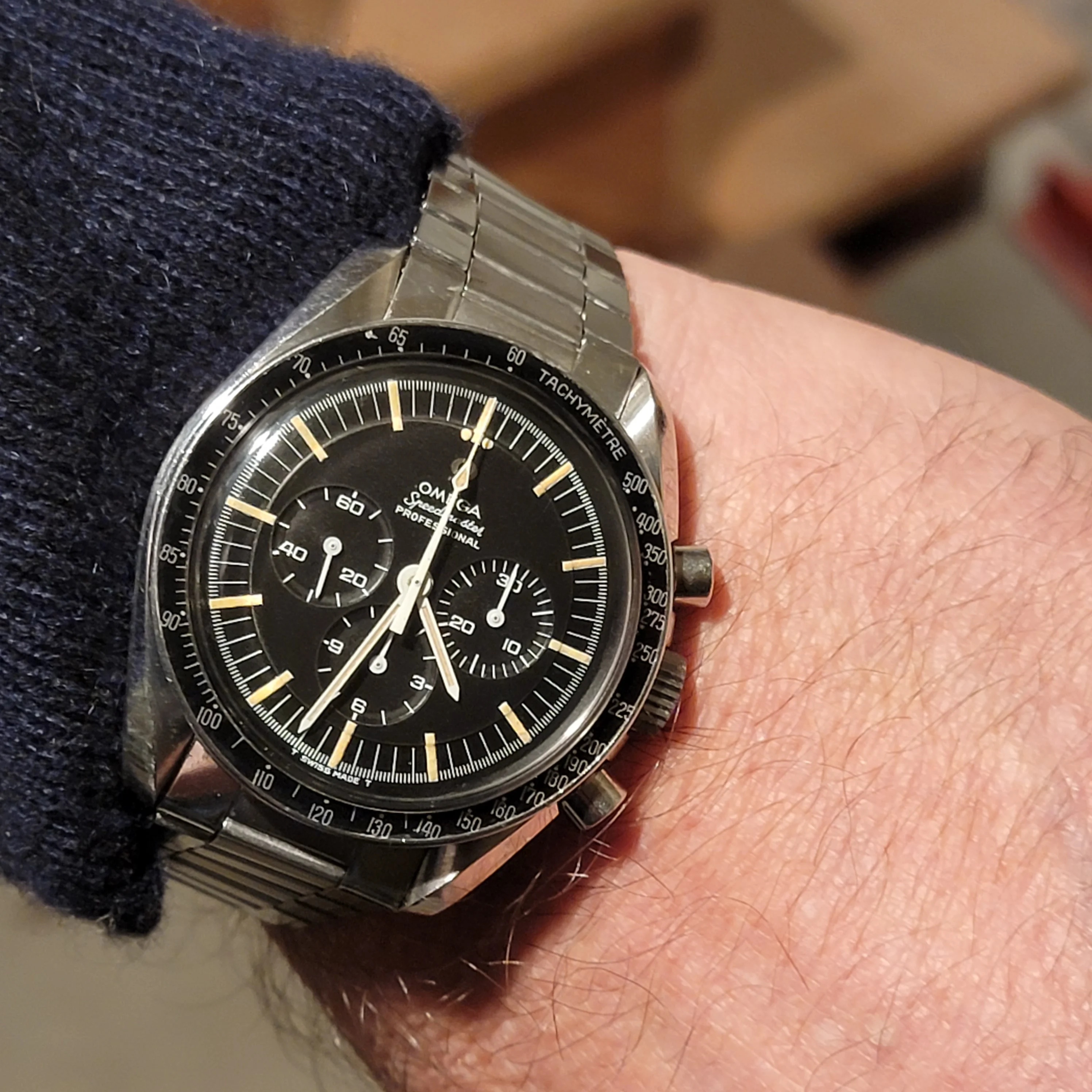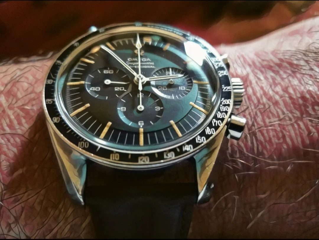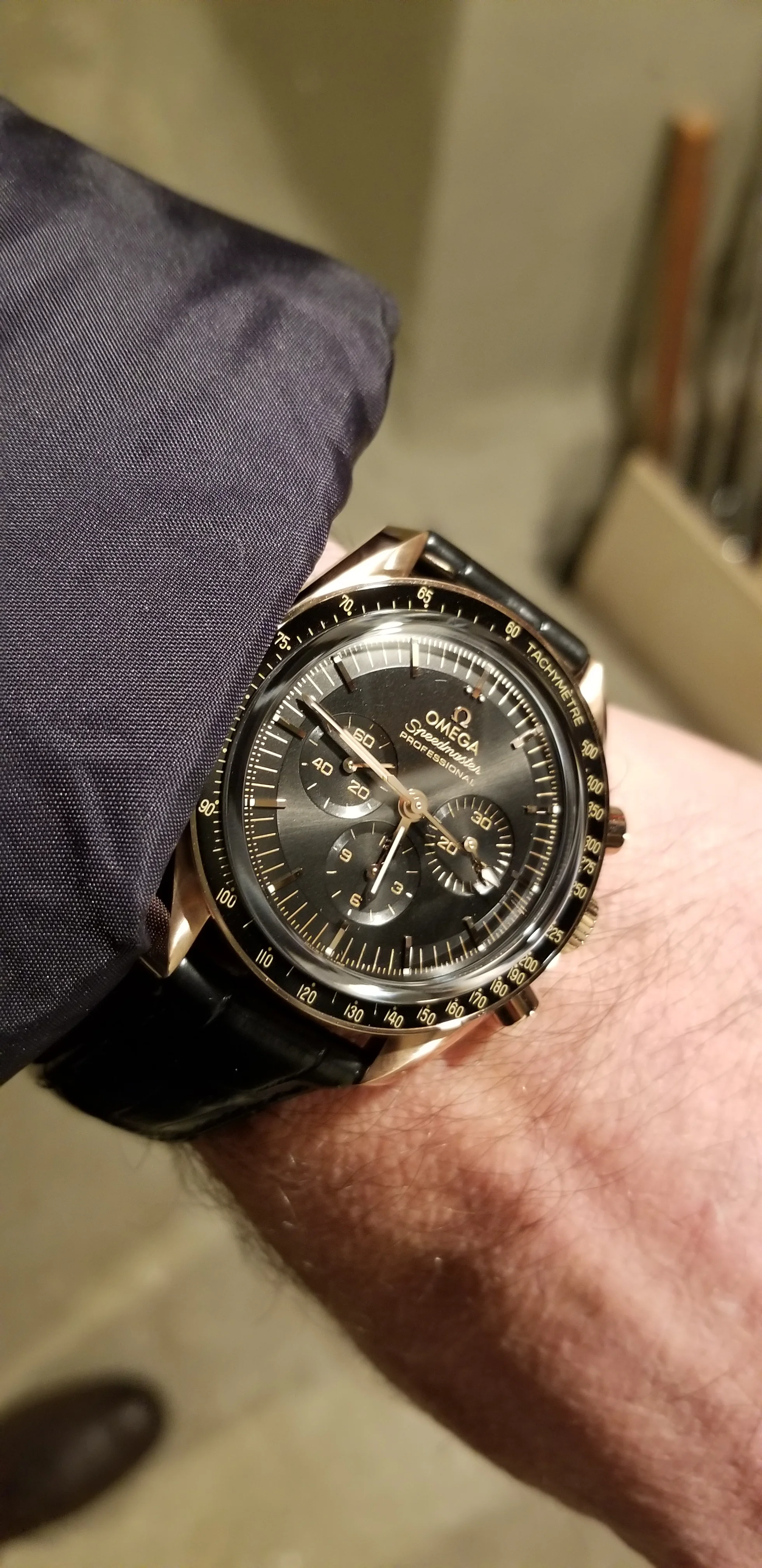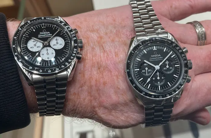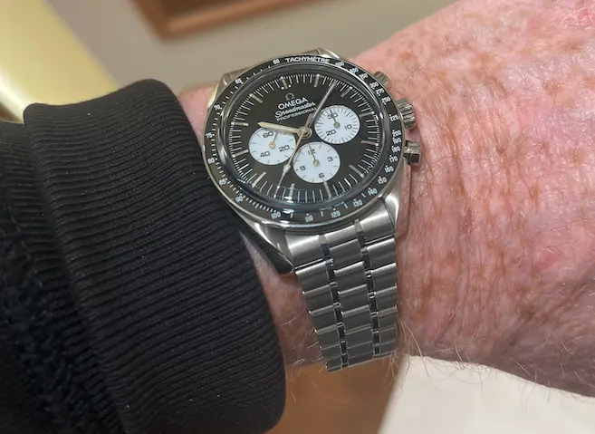 just barely acceptable. I was still able to read the time on the watch looking down at it. It failed my test of standing in front of a full length mirror about 4 feet away and being able to read the time on the watch. (The standard speedy and white dial passes this test.). I think I am going to buy this. It ticks all my boxes for an upgrade on the Speedmaster to a more luxury looking watch. I think this reference can compete on equal footing with the Daytona. Just my 2 cents.