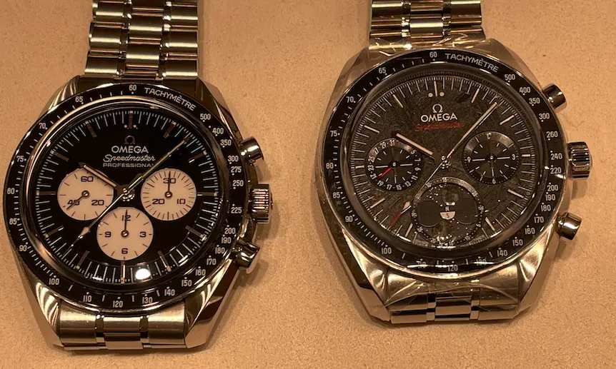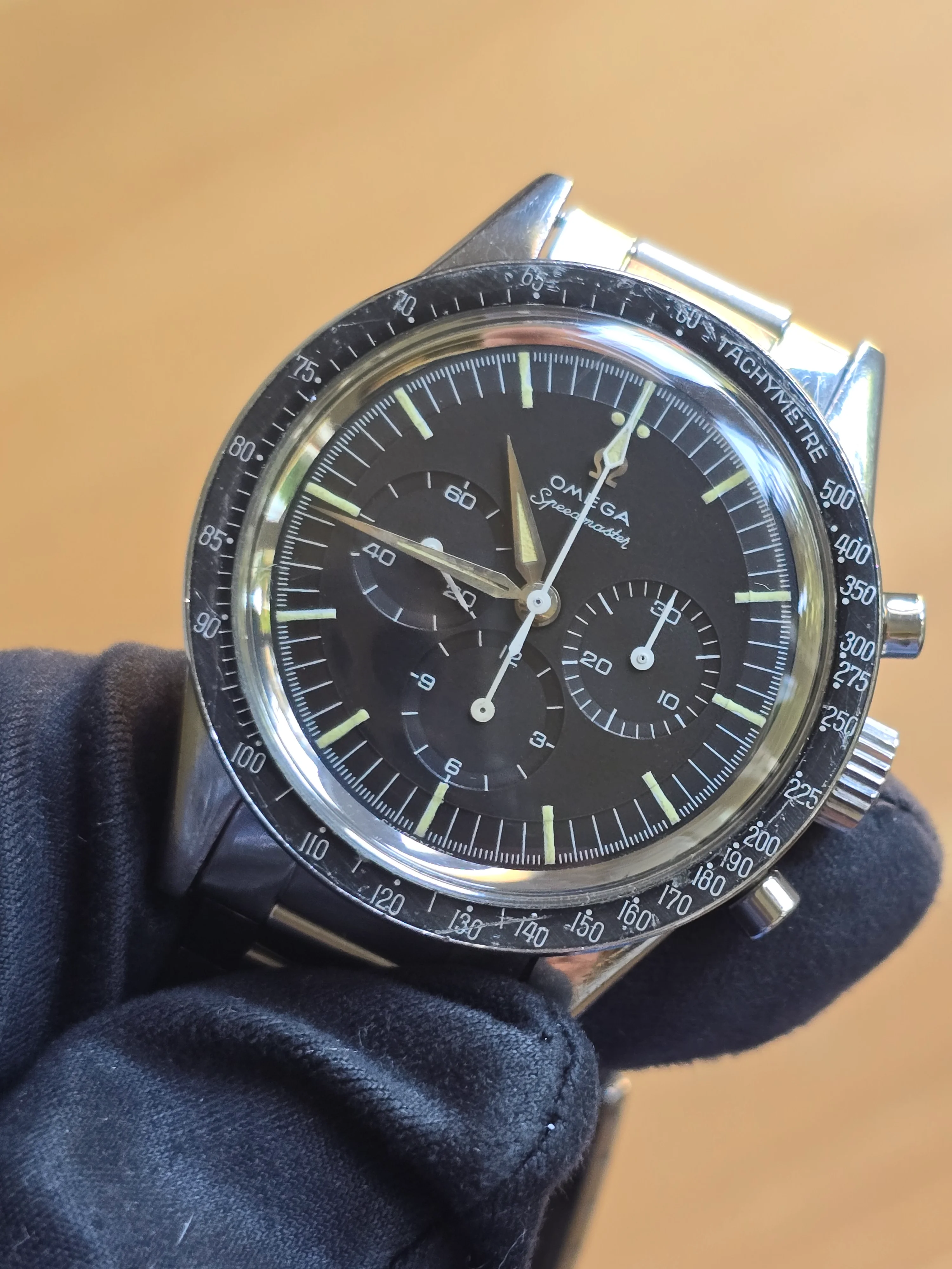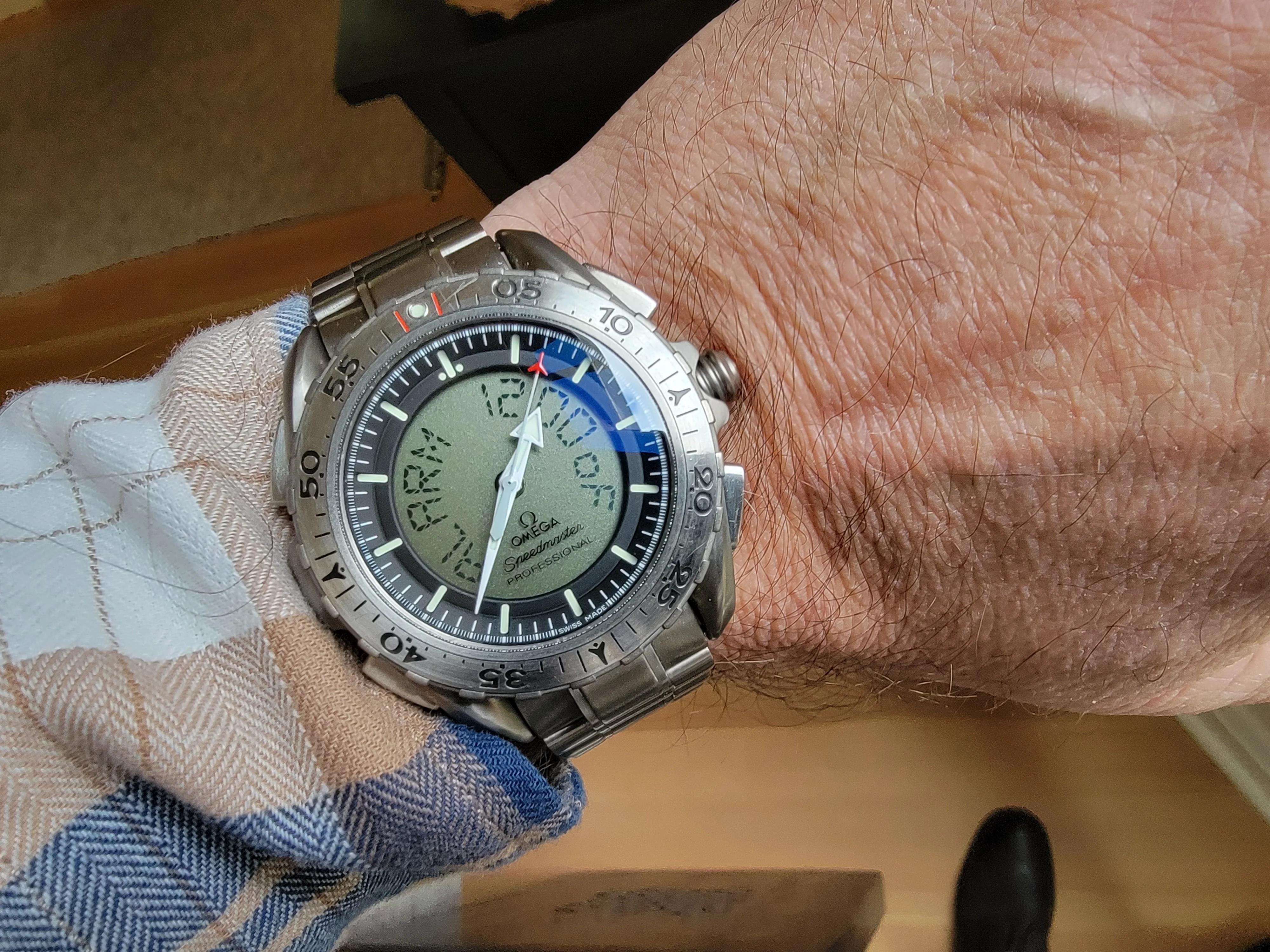 just barely acceptable. I was still able to read the time on the watch looking down at it. It failed my test of standing in front of a full length mirror about 4 feet away and being able to read the time on the watch. (The standard speedy and white dial passes this test.). I think I am going to buy this. It ticks all my boxes for an upgrade on the Speedmaster to a more luxury looking watch. I think this reference can compete on equal footing with the Daytona. Just my 2 cents.