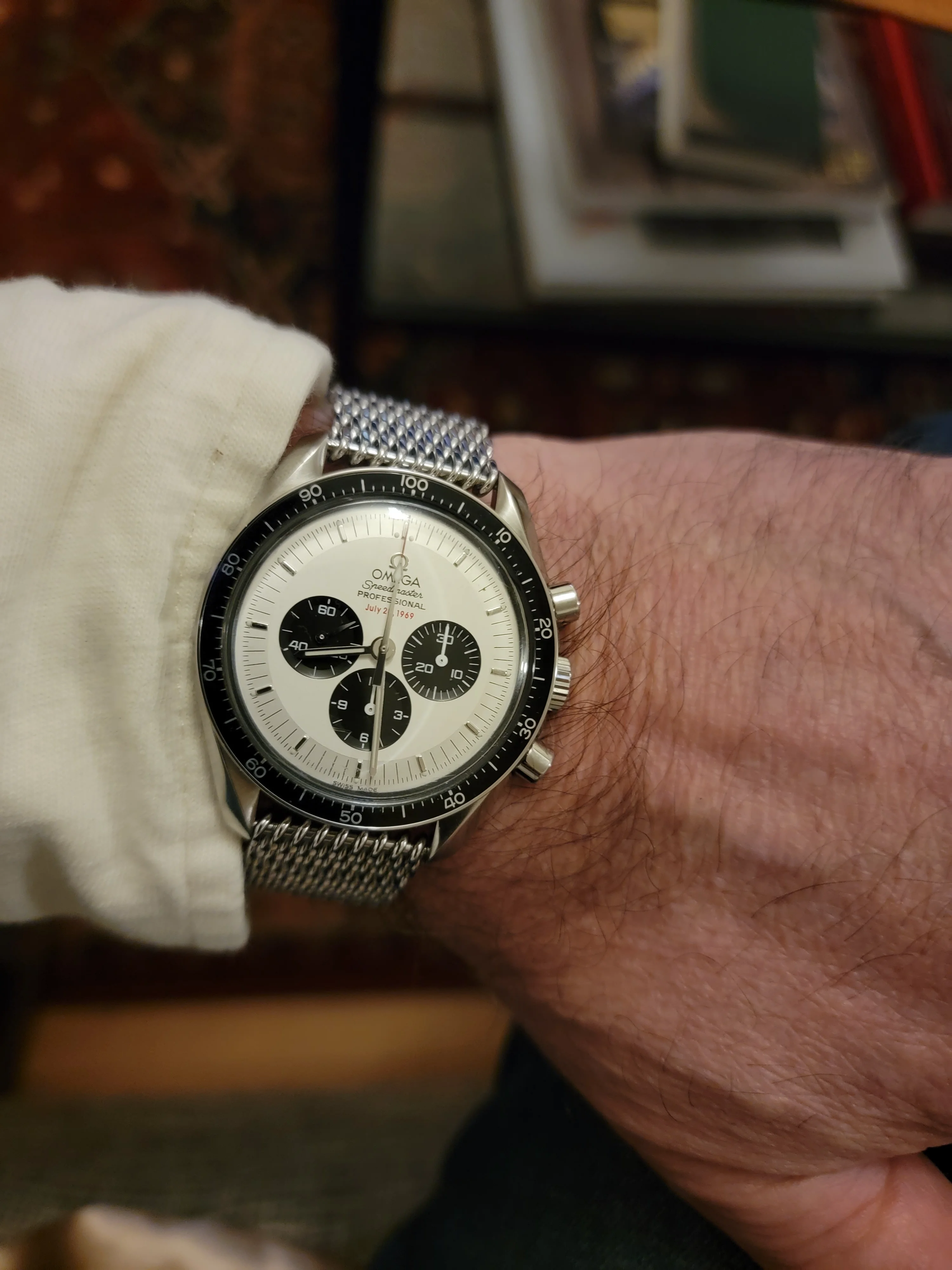 stunning in person. It really does look like a different watch compared to the standard black dial Speedmaster. The black on the Panda is significantly and noticeably darker, deeper, richer and more