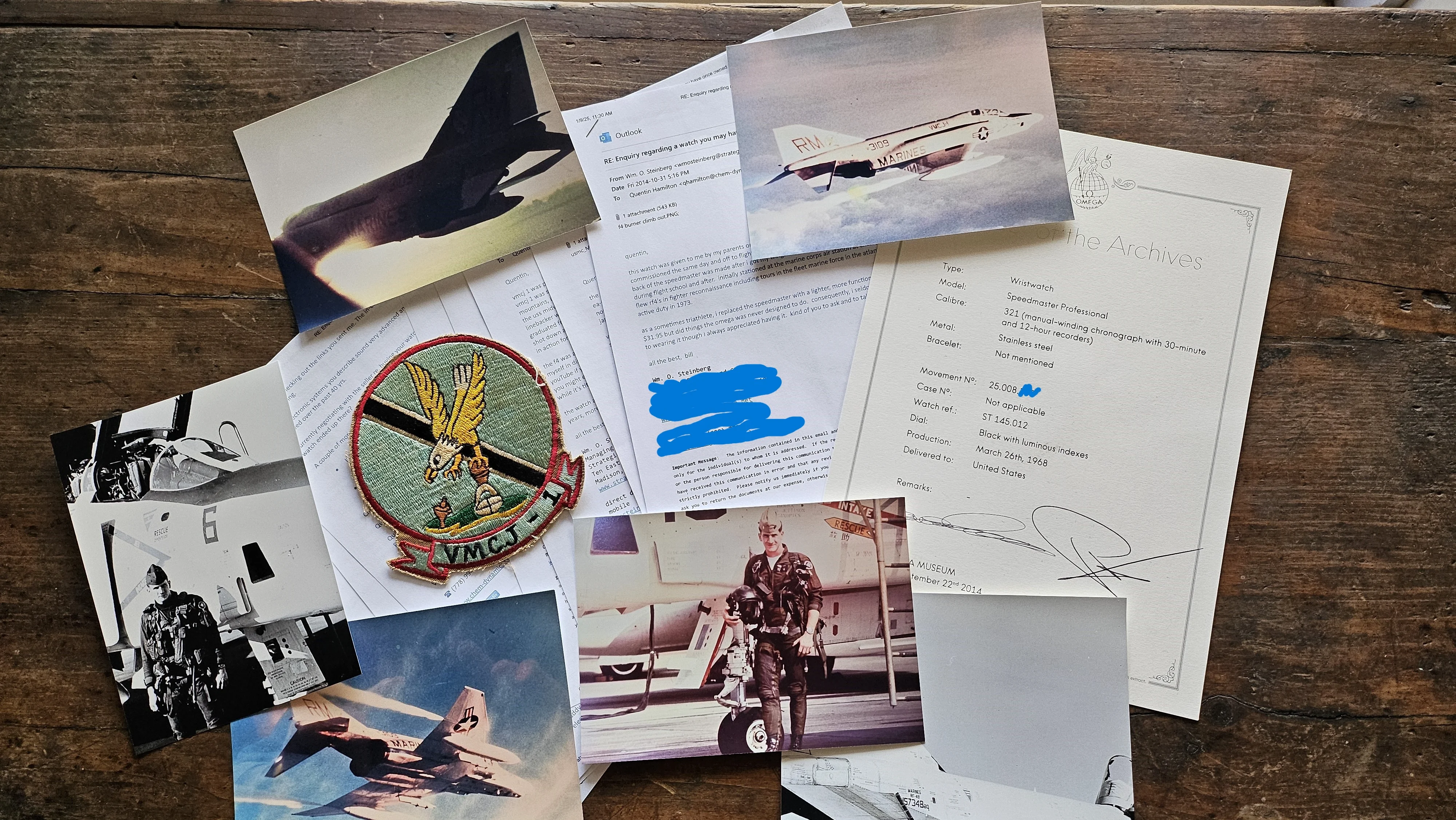 The watch comes with everything shown in the photo below i.e. an extract from the archives, electronic and printed copies of photos (provided by Bill), copies of communications (several emails) with Bill from 2014, and also an original VMCJ-1 squadron shoulder patch.