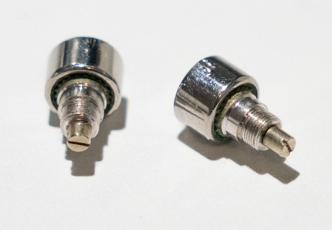 I'm attaching a photo of the original pushers. The tip that goes inside looks like coated brass. It's not typical yellow as brass but not "silver" as steel.