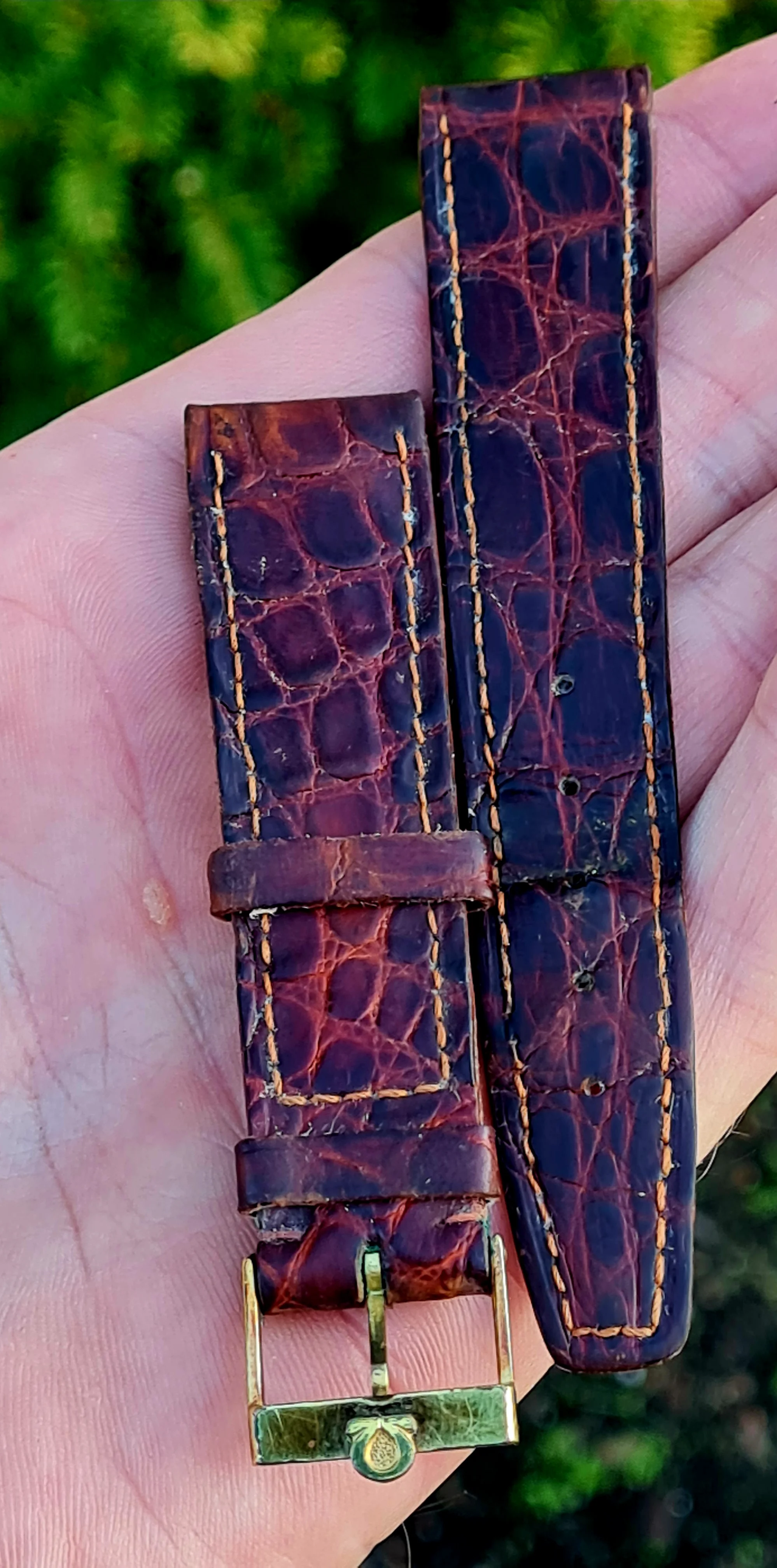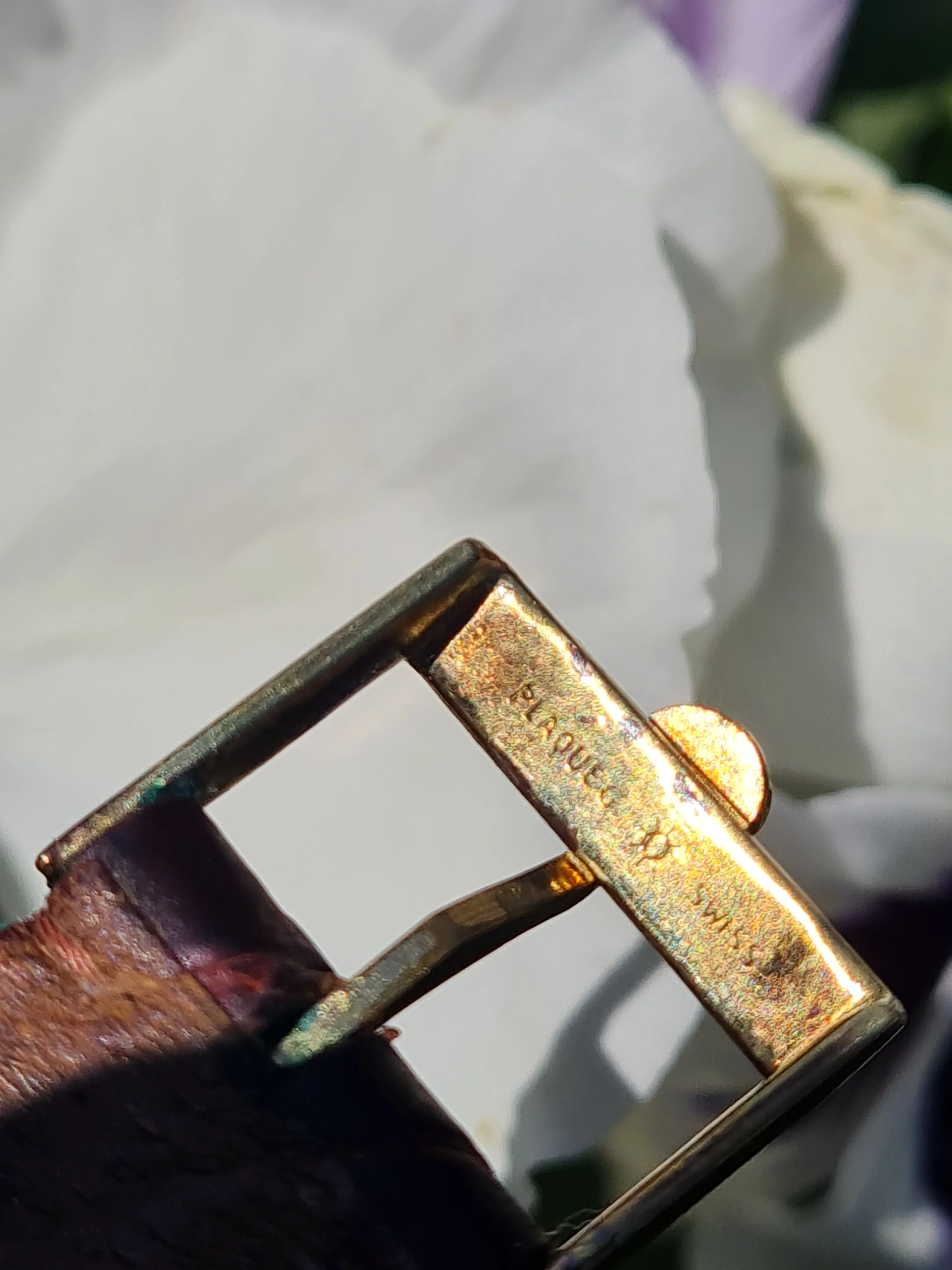 The buckle is mounted on an old Omega leather bracelet in kind of poor condition.