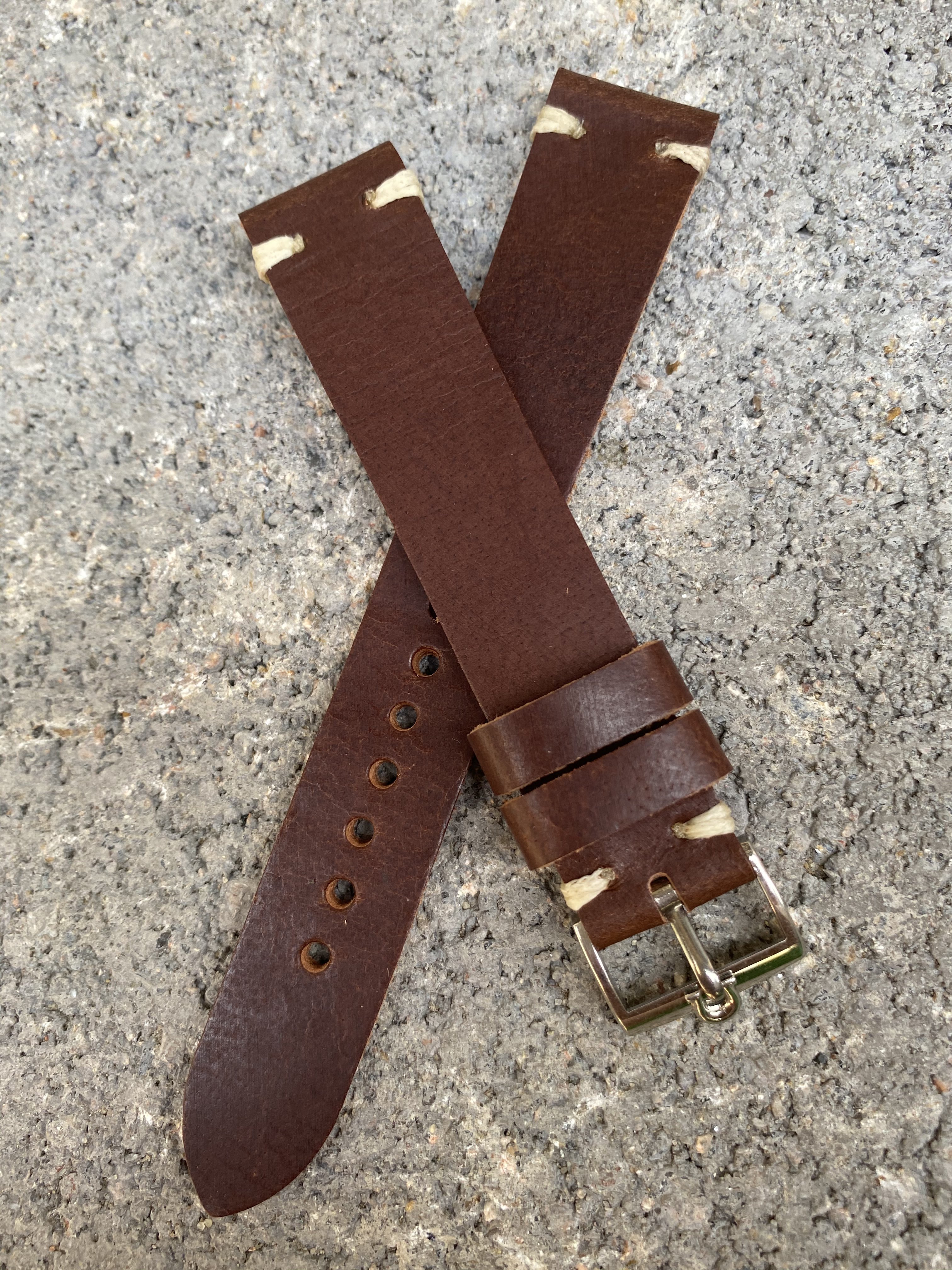 Two Stitch Brown - 18/16mm dark brown leather strap with white/cream stitching and a basic spring bars included.