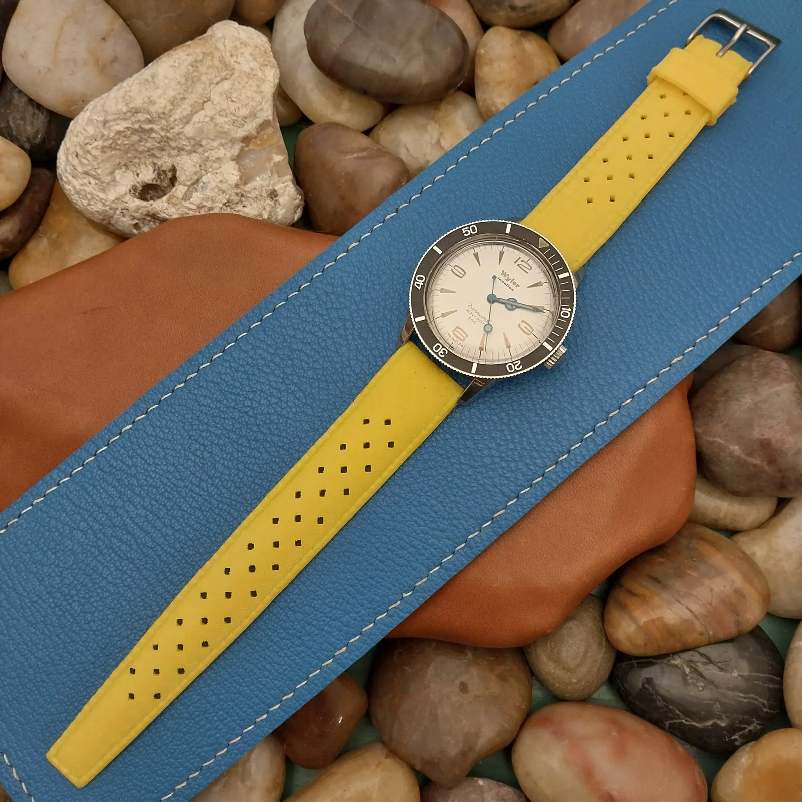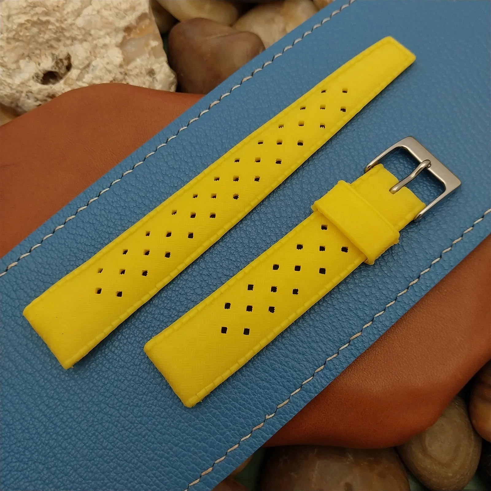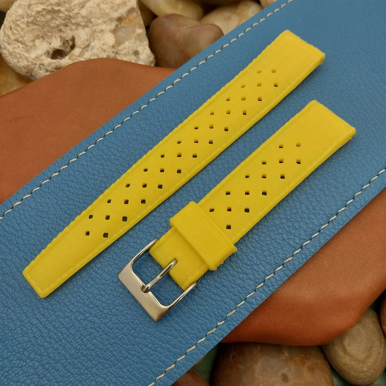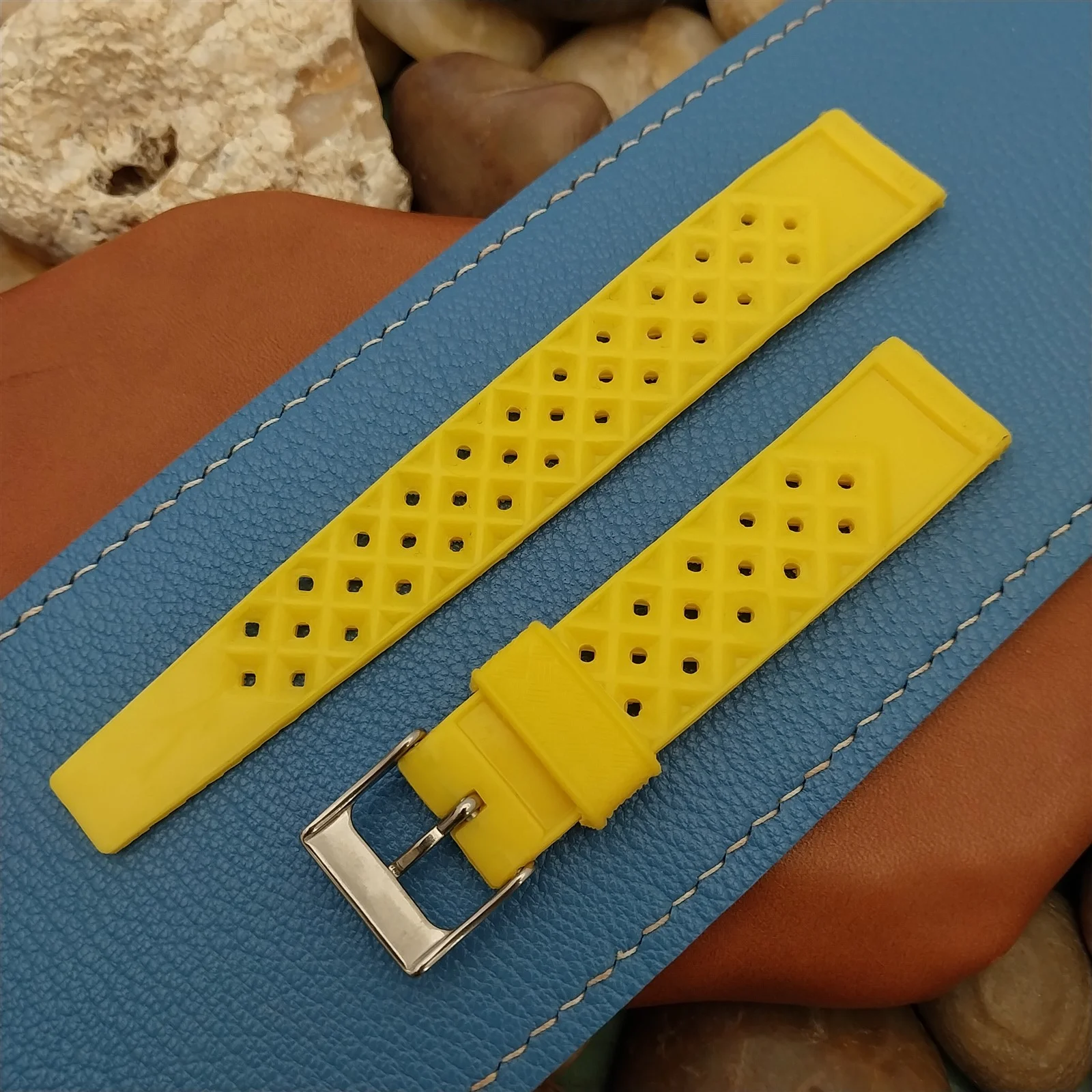 ·NOS unused 1960s-1970s old-stock yellow rubber diving watch strap.