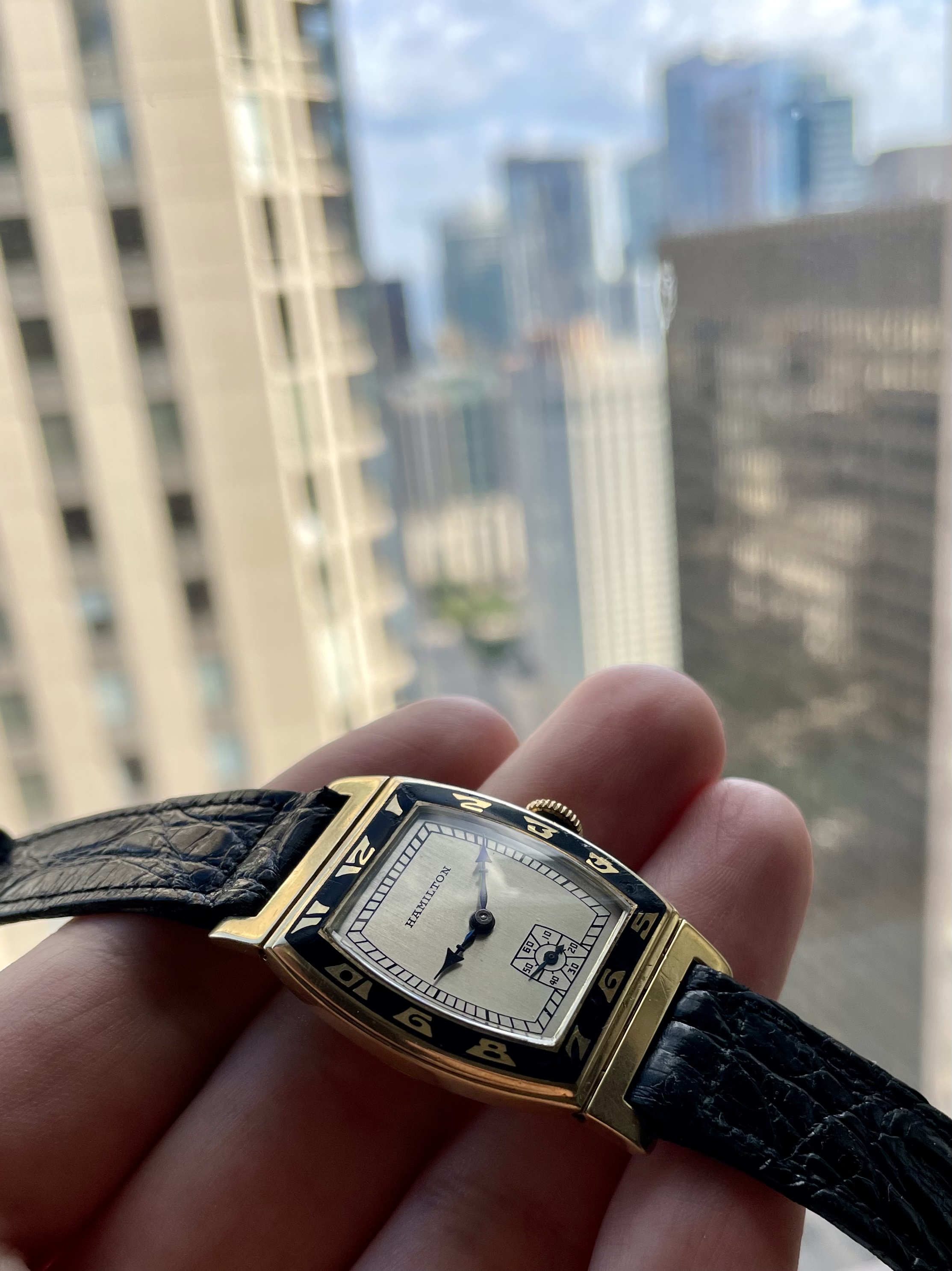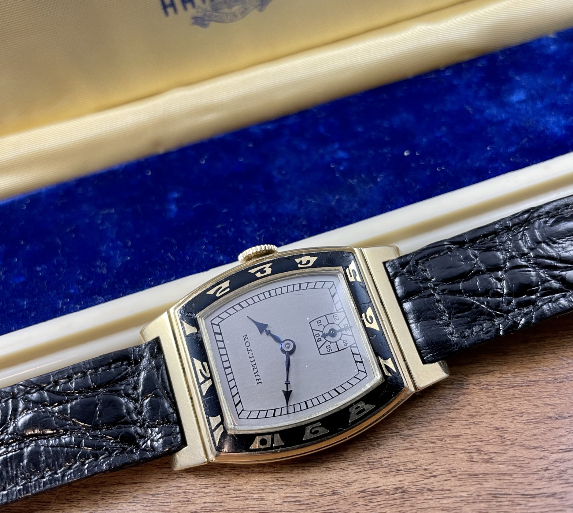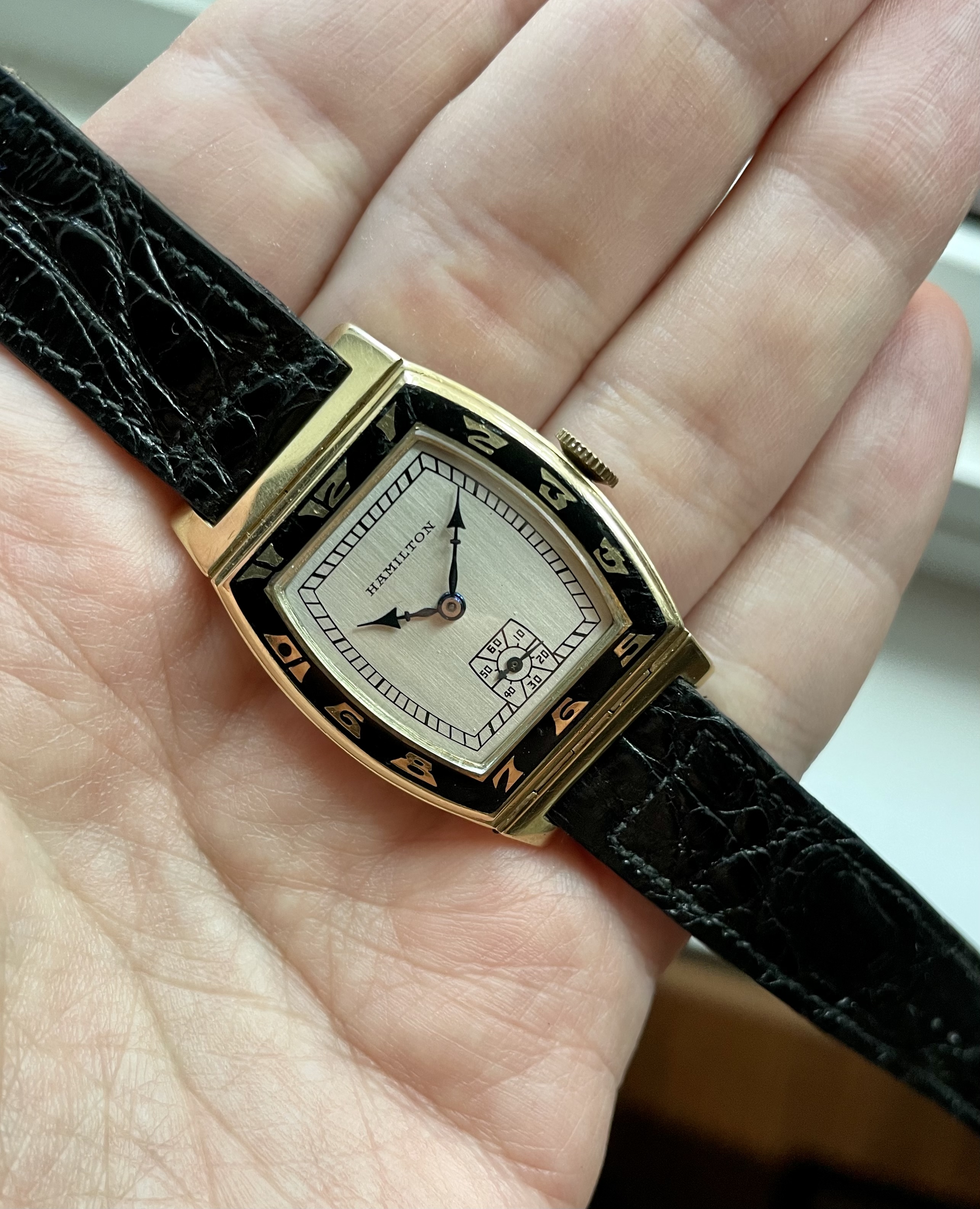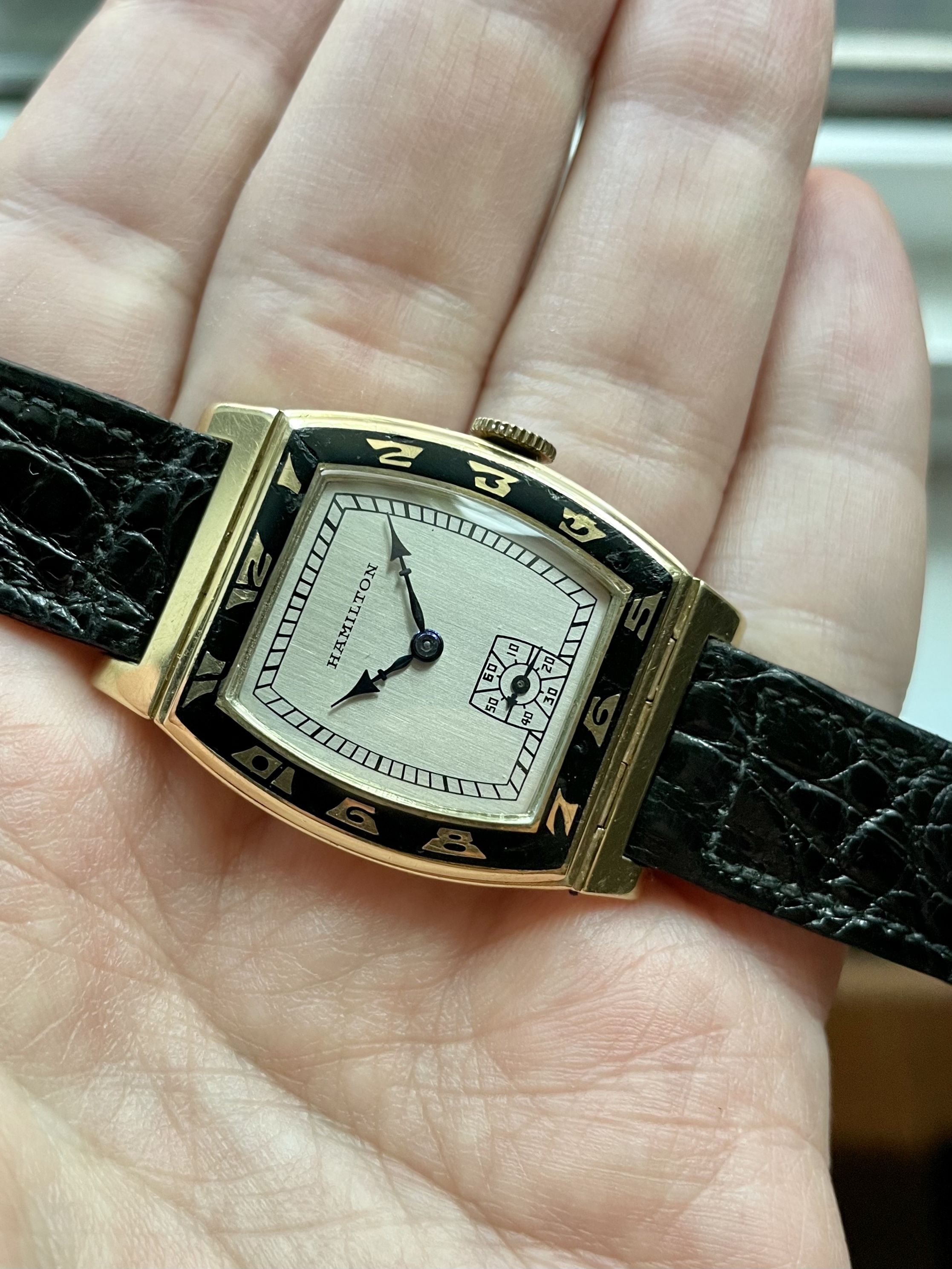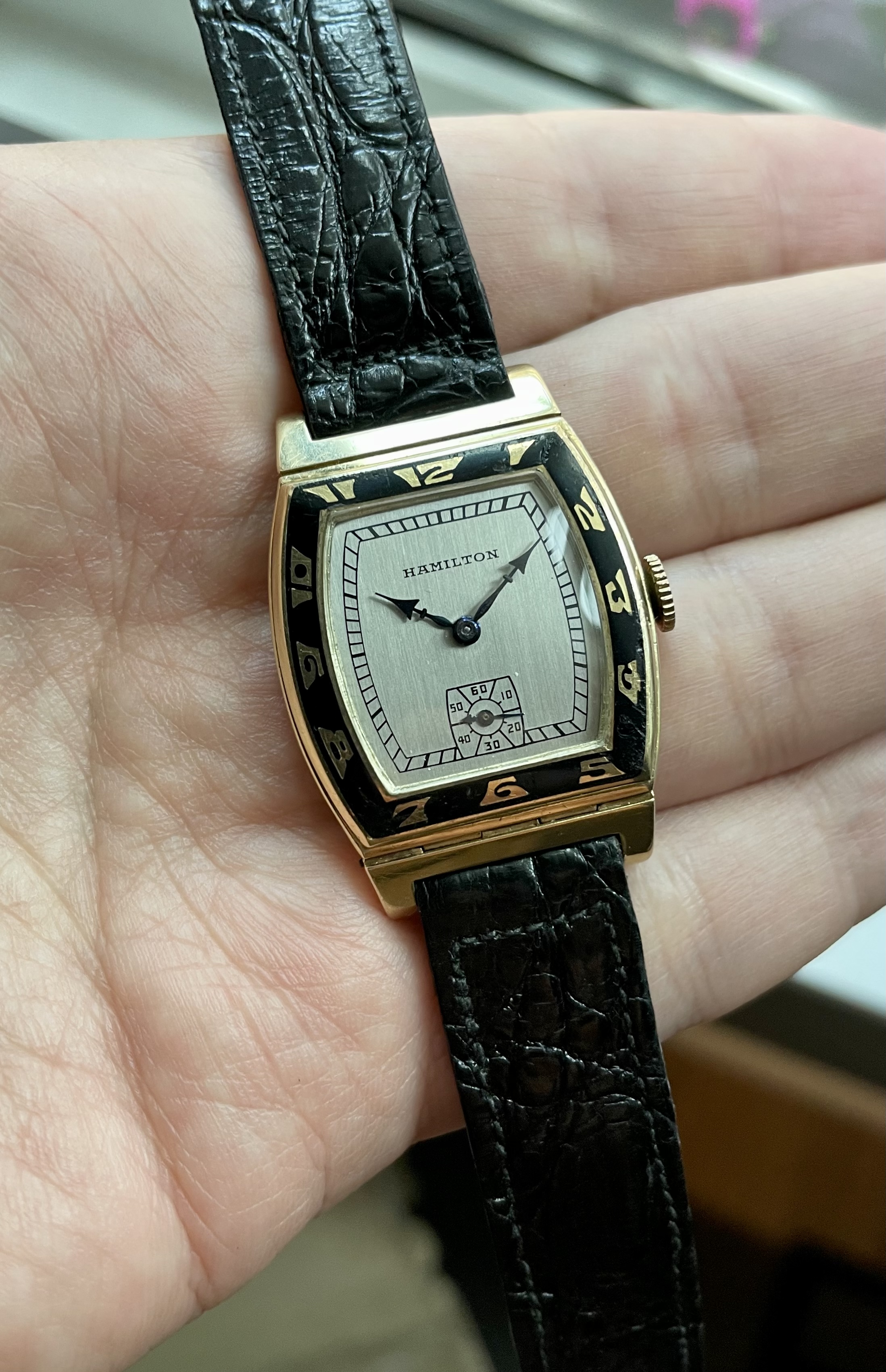 Fantastic Art Deco design with a black enamel bezel. Wears considerably larger than most tank style watches of the era (29mm wide and 43mm long). Hinged/pivoting lugs.