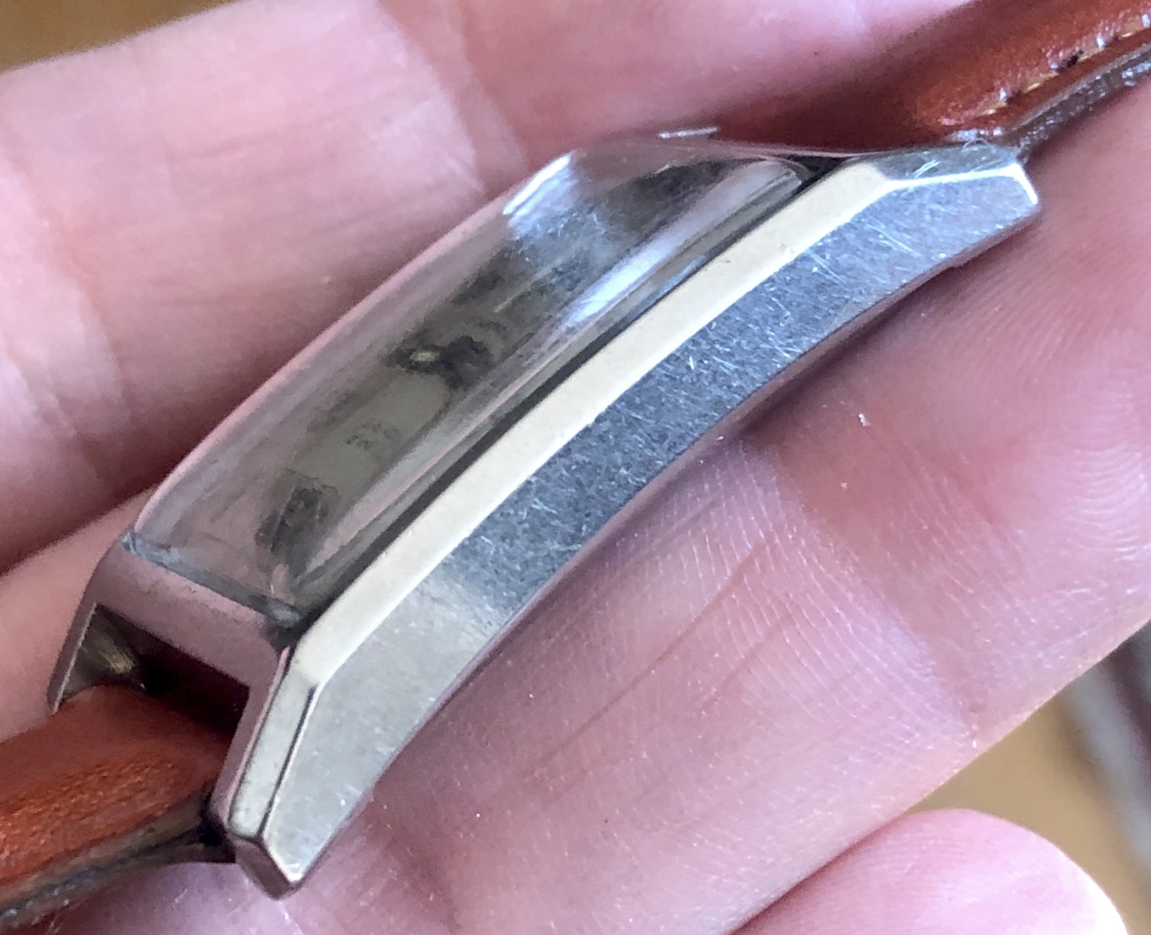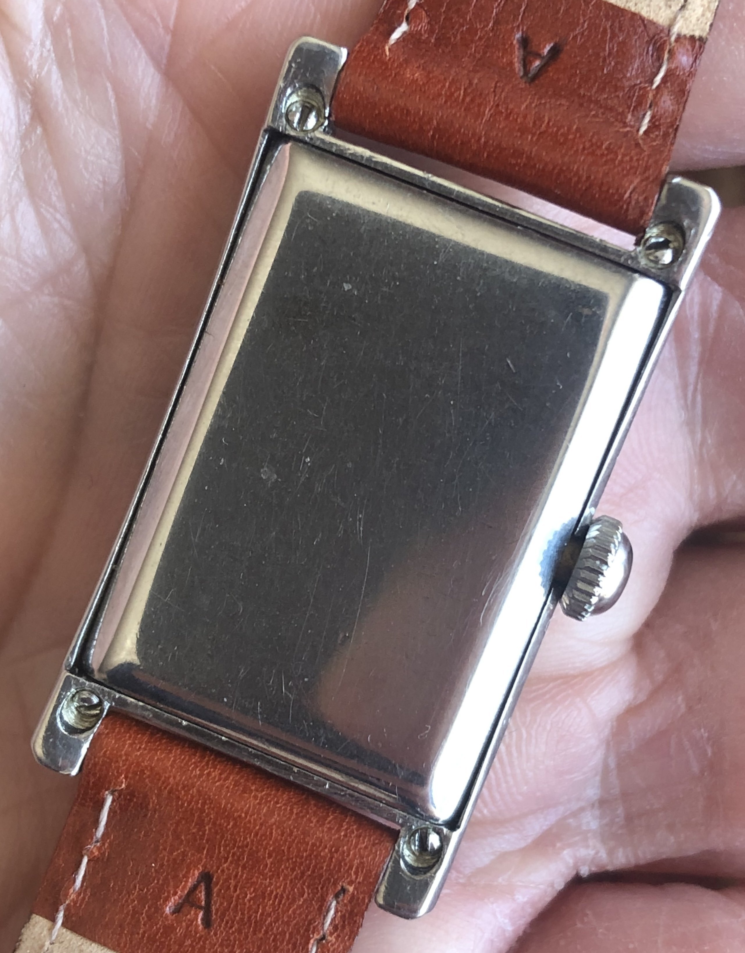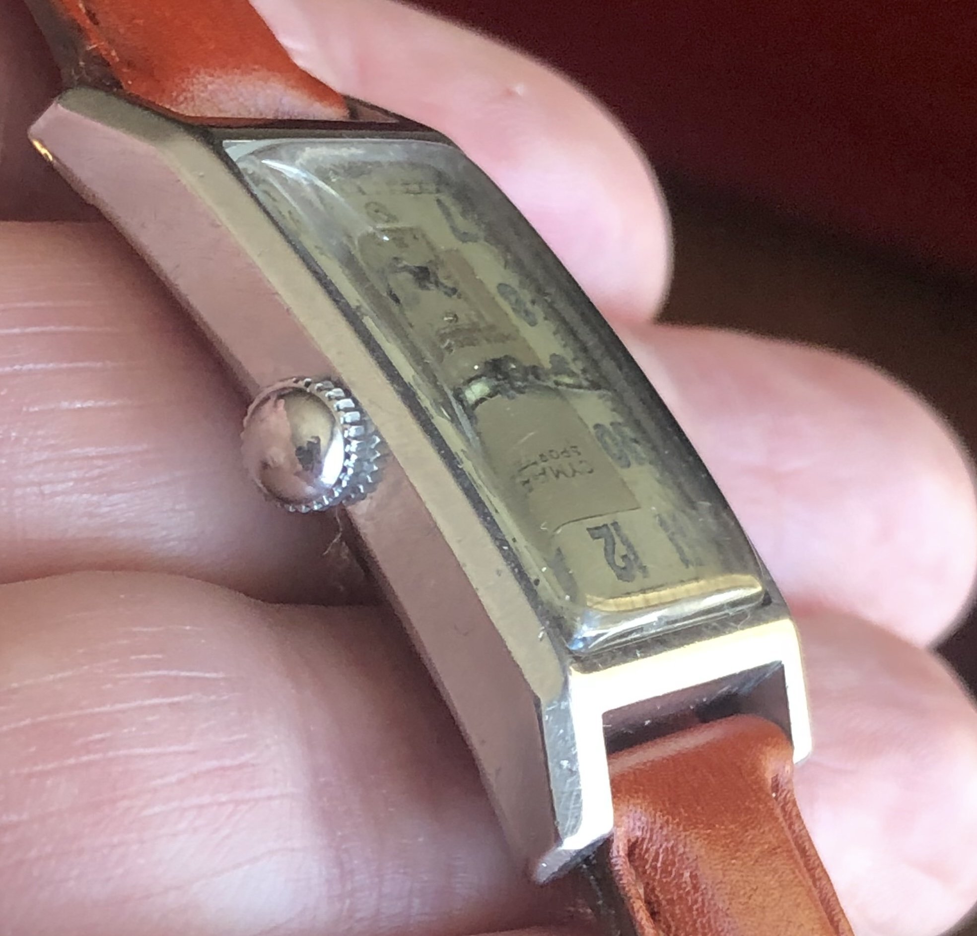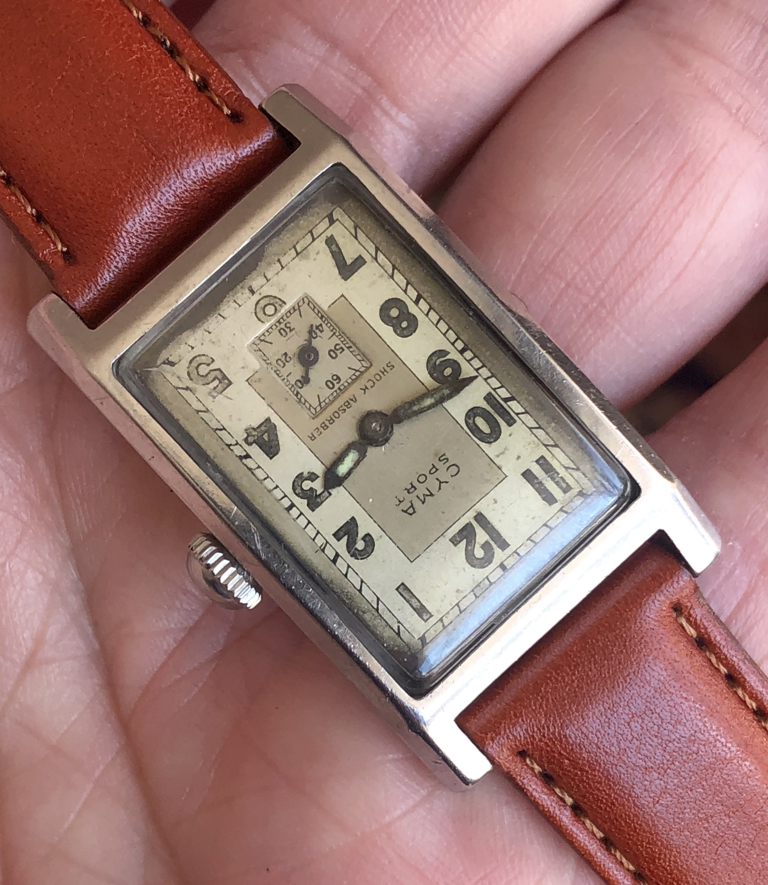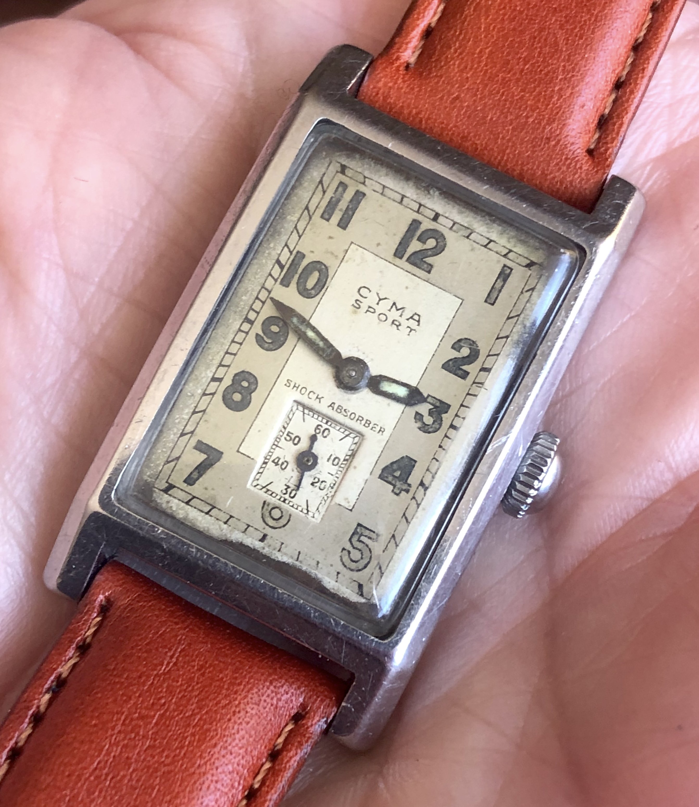 ·1930s rectangular Cyma Sport watch with an attractive two-tone dial in an early Schmitz Freres waterproof "clamshell" case. These cases use the set screws in the back to push the flanged crystal against the front of the case. Not expected to be actually waterproof, of course. The case has a slight curve that makes it sit nicely on the wrist. The watch shows wear and aging, most notably some paint loss at the bottom edge and a crack in the crystal. Everything appears to be correct, including even the crown. The case is approximately 22.3mm wide (excluding the crown), 38.4mm lug-to-lug, and 16mm between the lugs. Nice size for a tank.