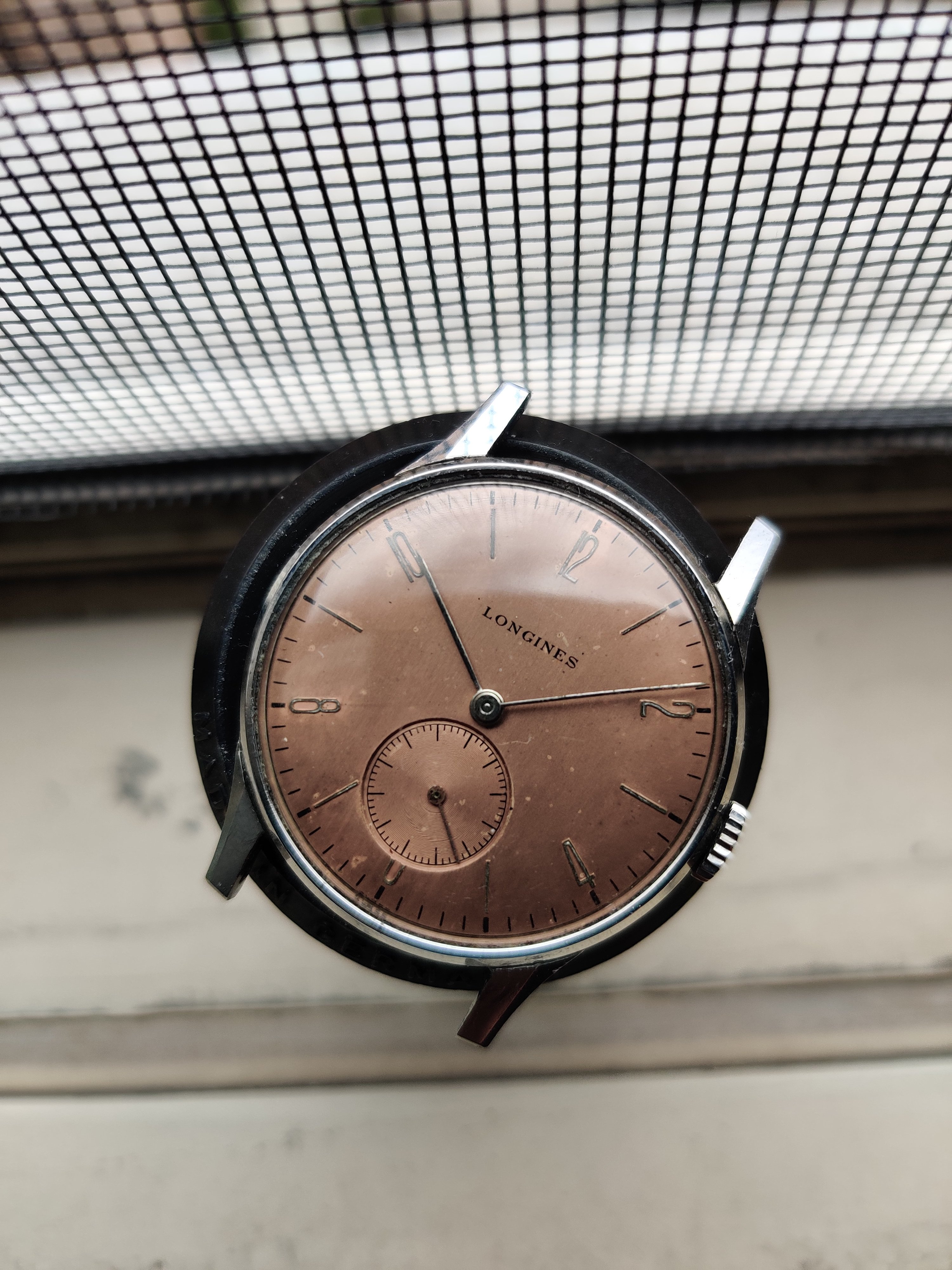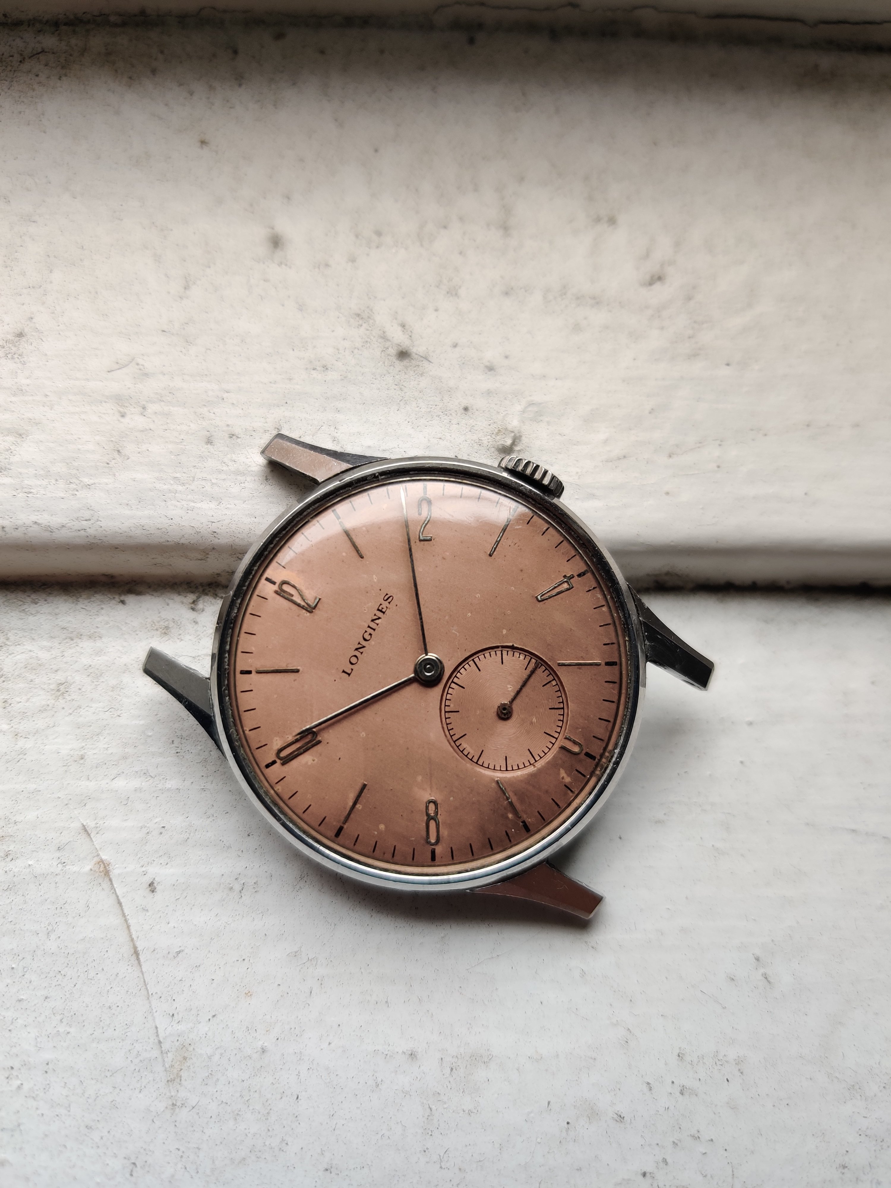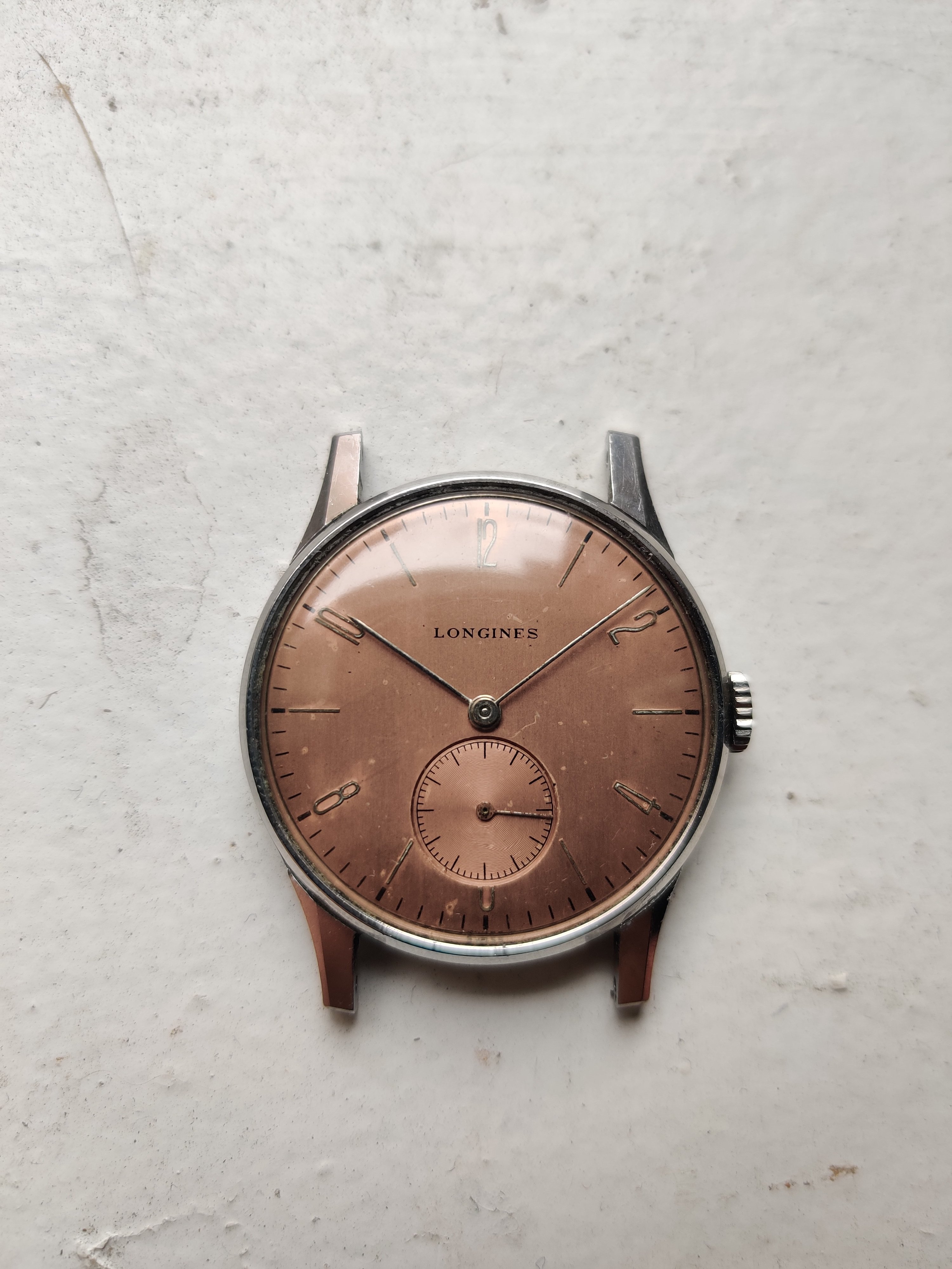 Up for sale is a nice Longines 23M. Case measures about 32mm in diameter and is in nice condition especially the lugs. Original dial and hands, the salmon dial has some small marks on the dial and aging. In person, the watch has a copper/salmon tone. Watch runs, but has not been serviced in my possession. I would recommend a service if used daily.