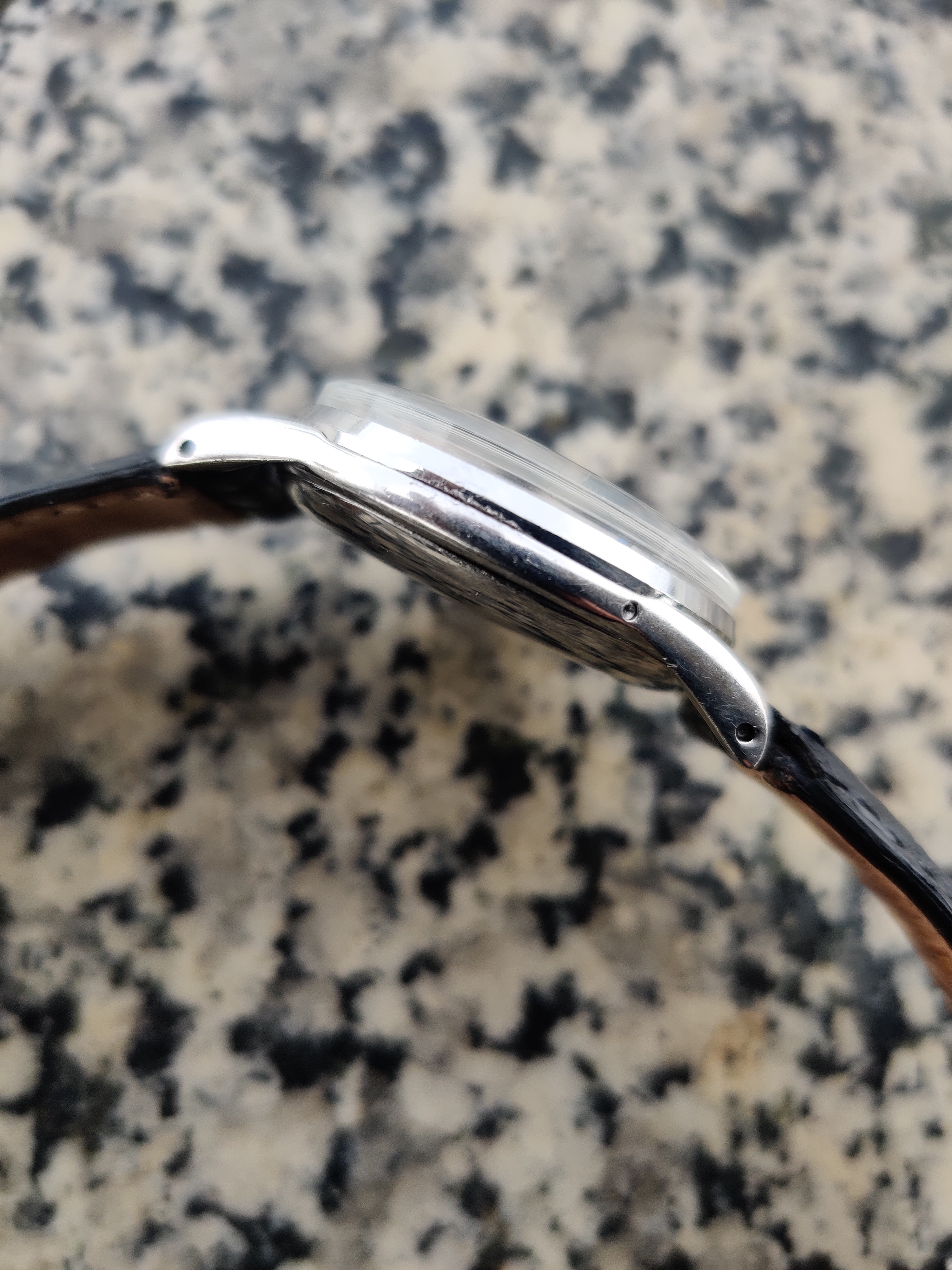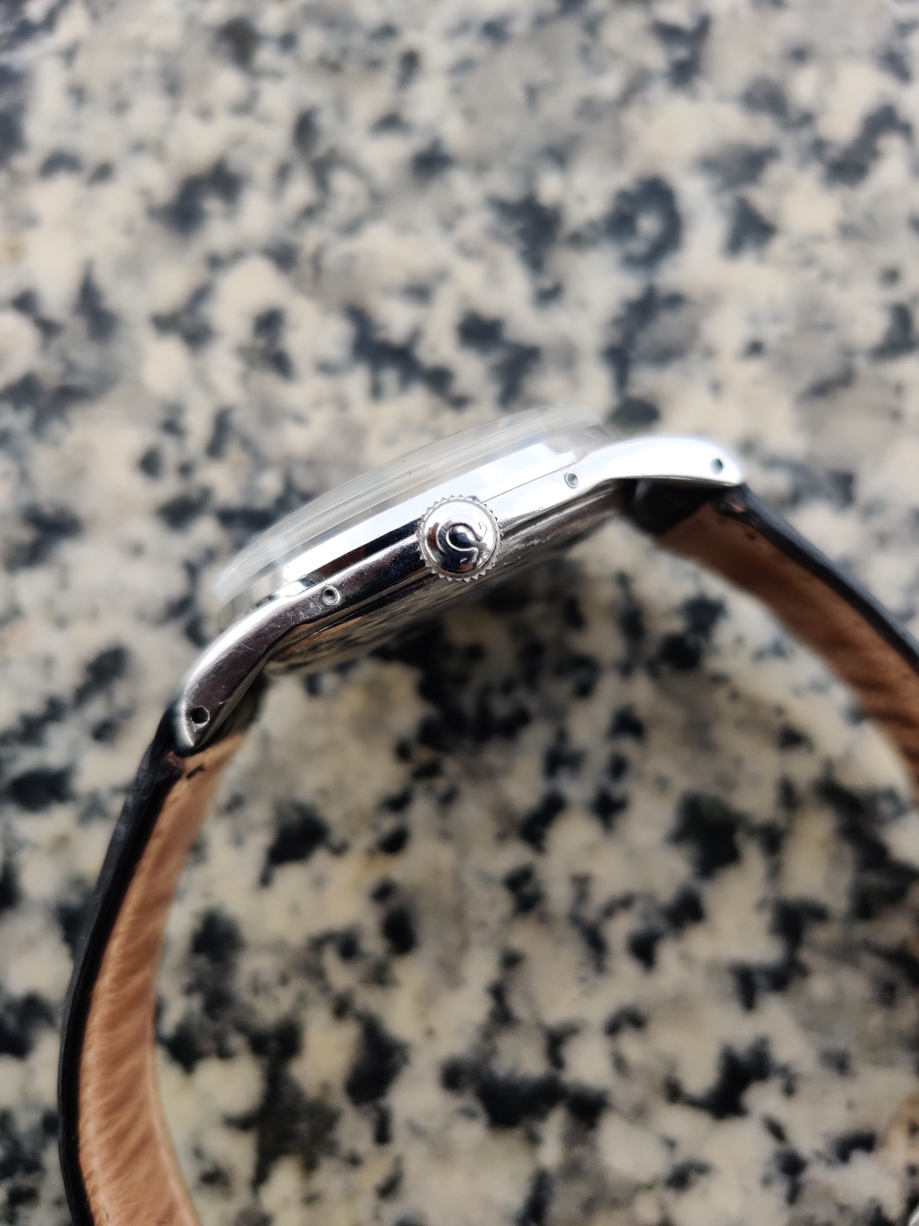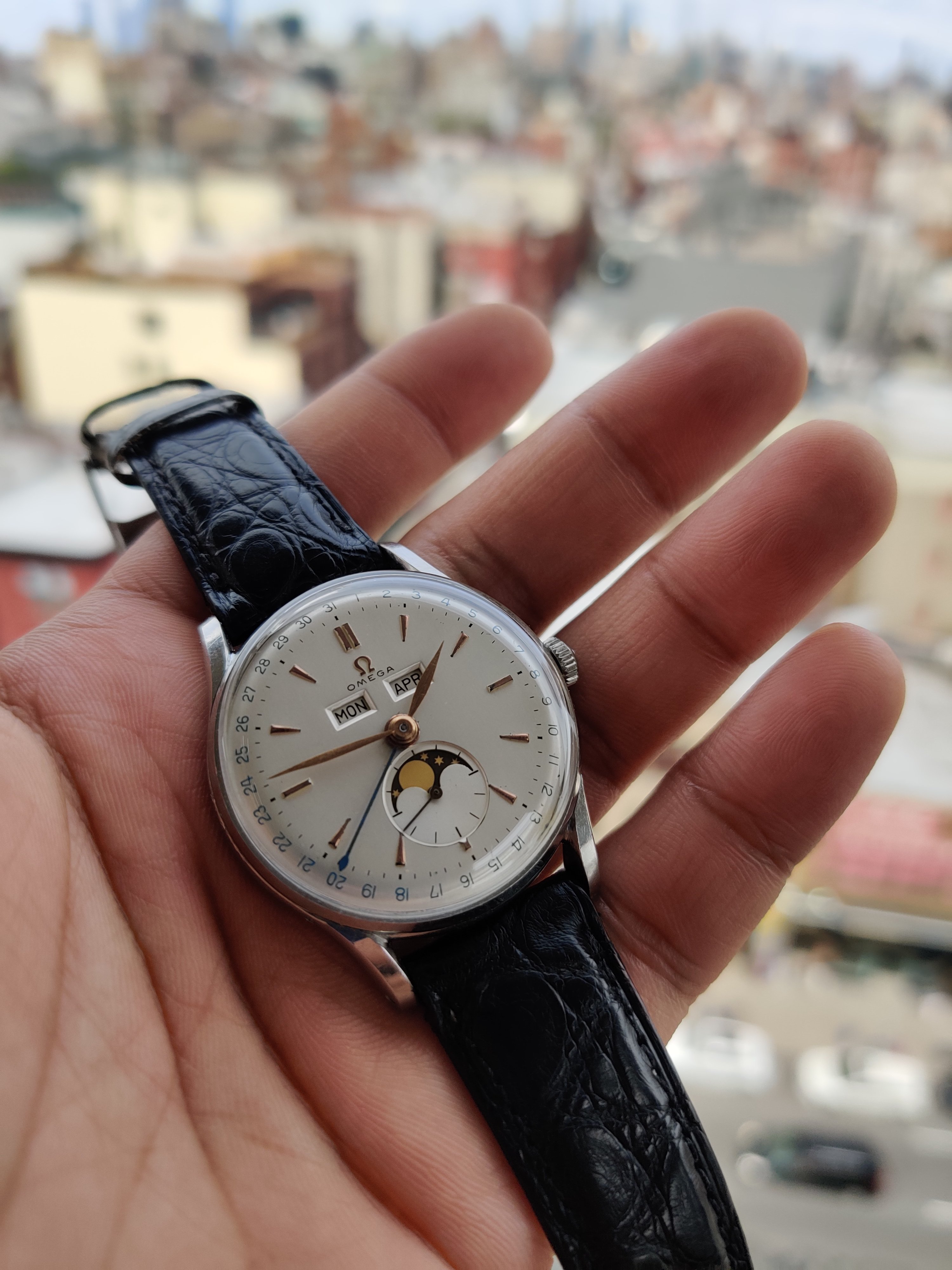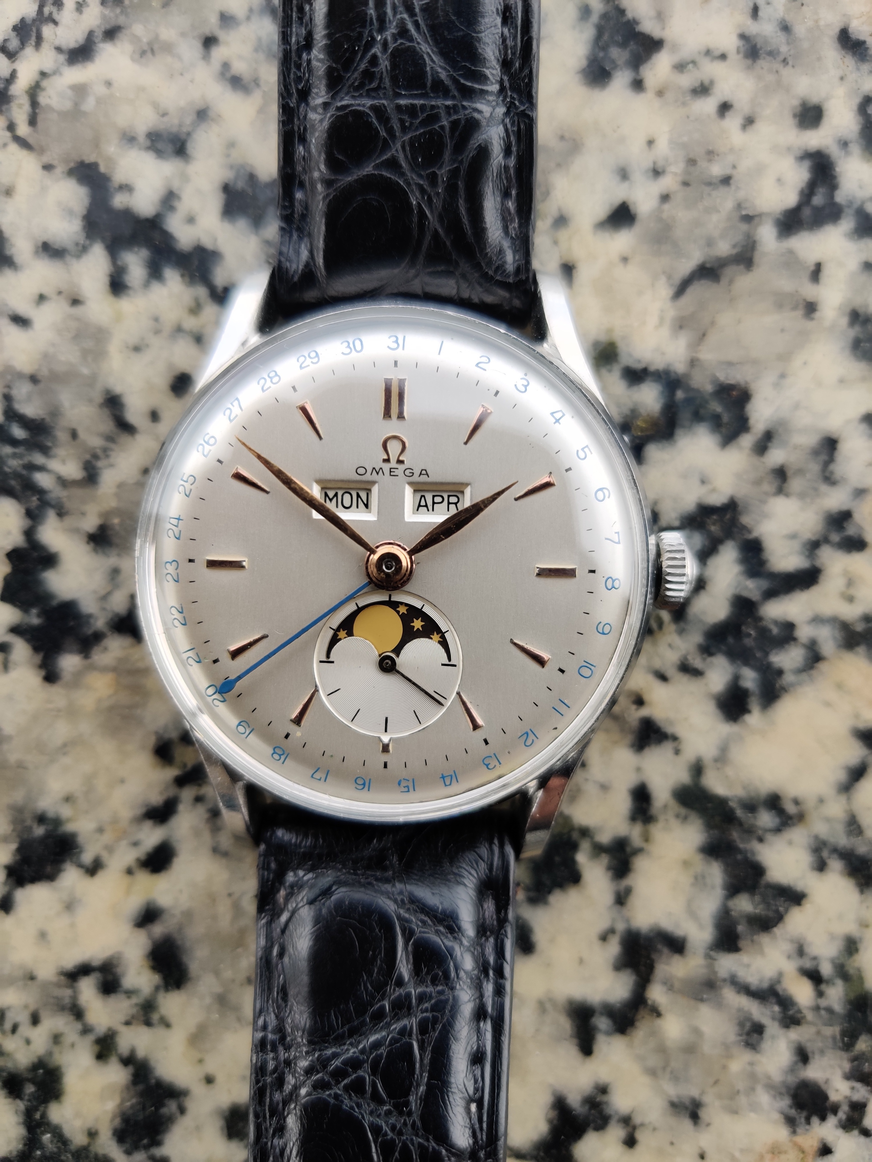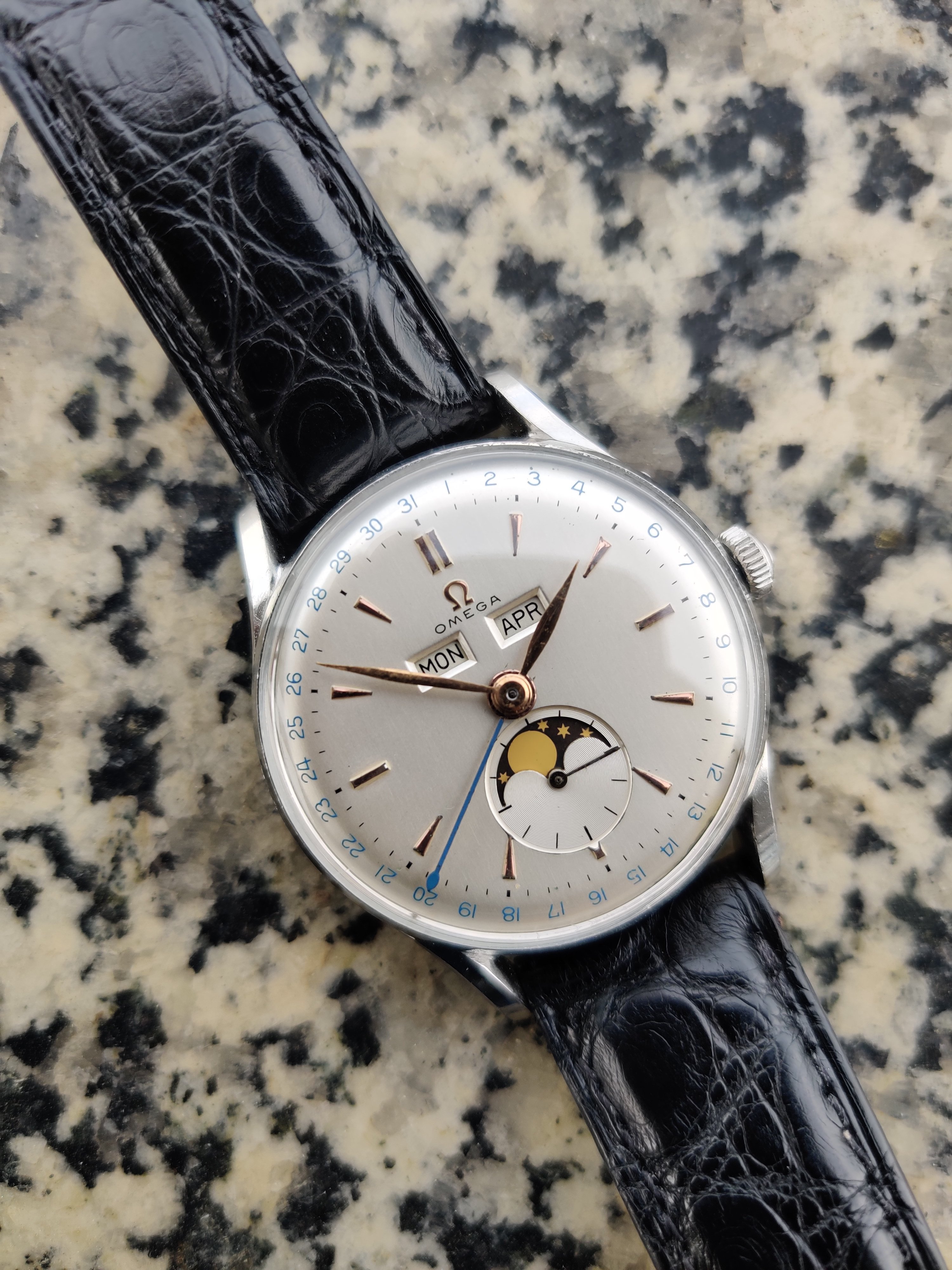 Up for sale is a very nice Omega Cosmic Moonphase from my collection. Will be sold on a different strap. Recently serviced, the watch also has a new crystal and crown. The dial and hands are original. The dial has some very small marks near the center of the dial, but there is very little aging and one of the better examples I have seen. Markers I believe are yellow gold, but they are close to rose gold. Caseback has some scratches on the back. If you have any questions, let me know.
