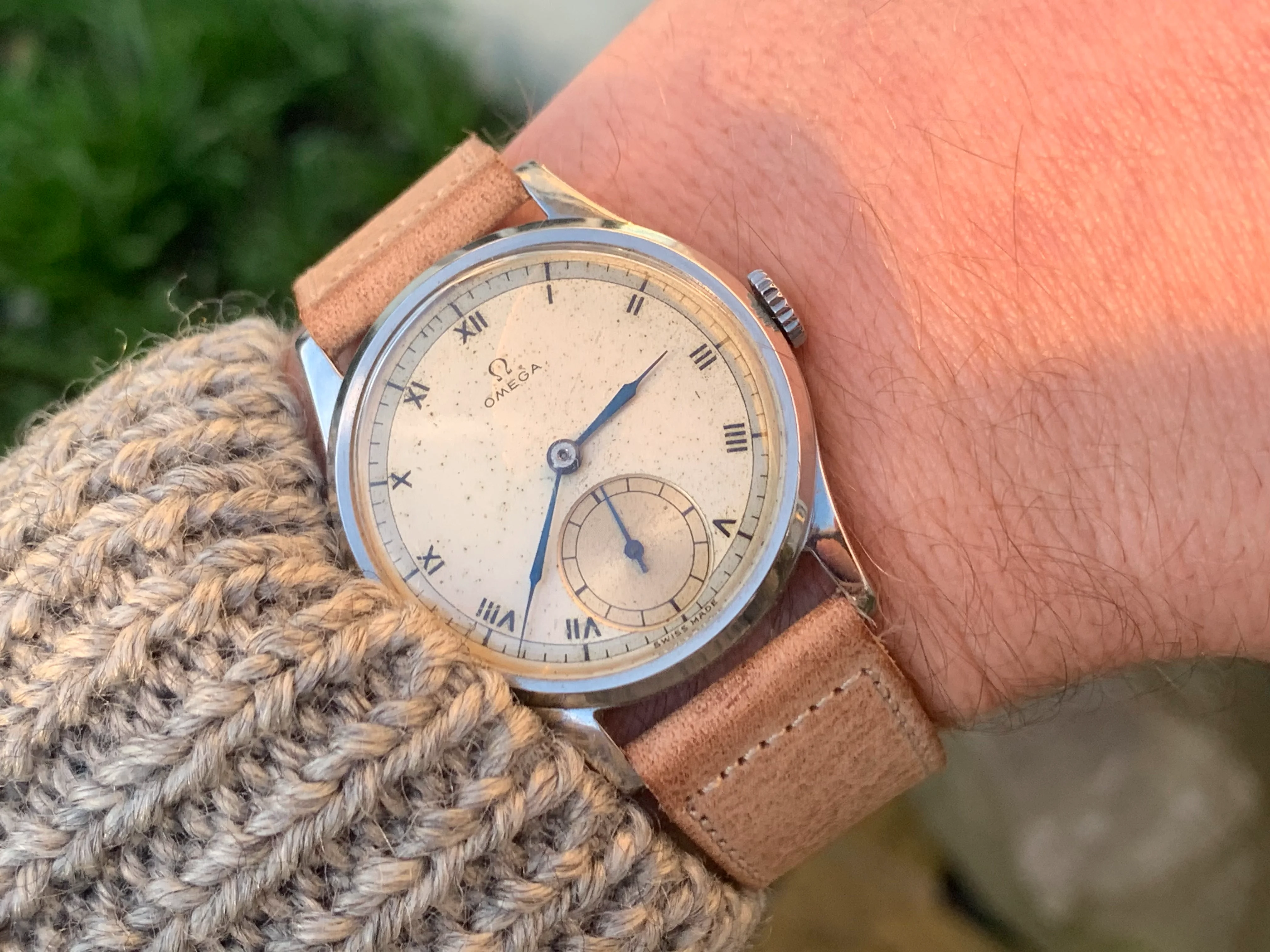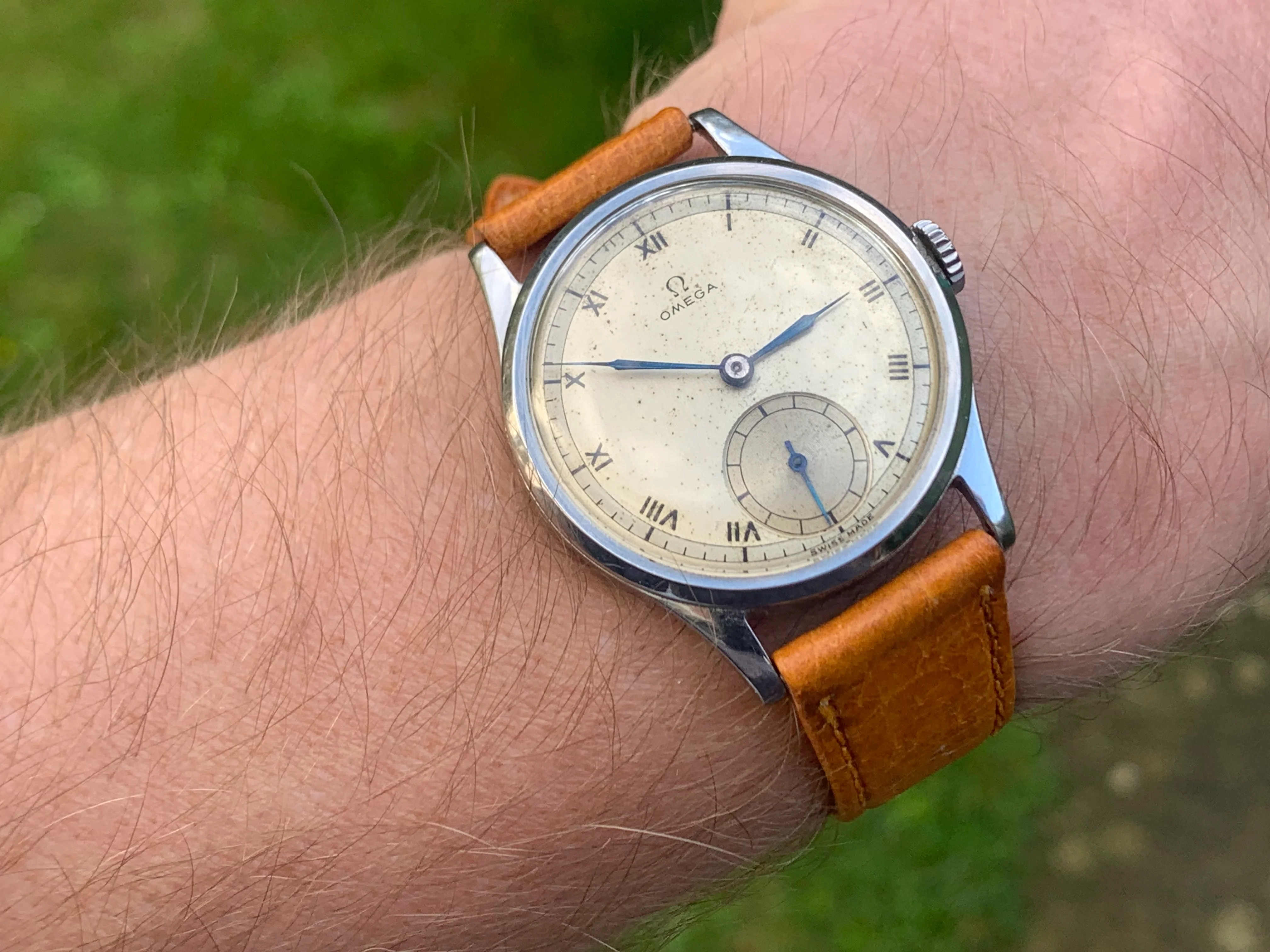 Dial: For an 80 year old watch the dial is in remarkable shape, there is a subtle and even patina that covers the entire dial. The black roman numerals create a great contrast against the creamy dial, and combined with the beautifully blued plume hands create a visually striking and very legible watch. The numerals form a radial pattern around the circumference of the dial, with a second track to their outer edge that reacts differently to the light and so creates a two tone dial effect.