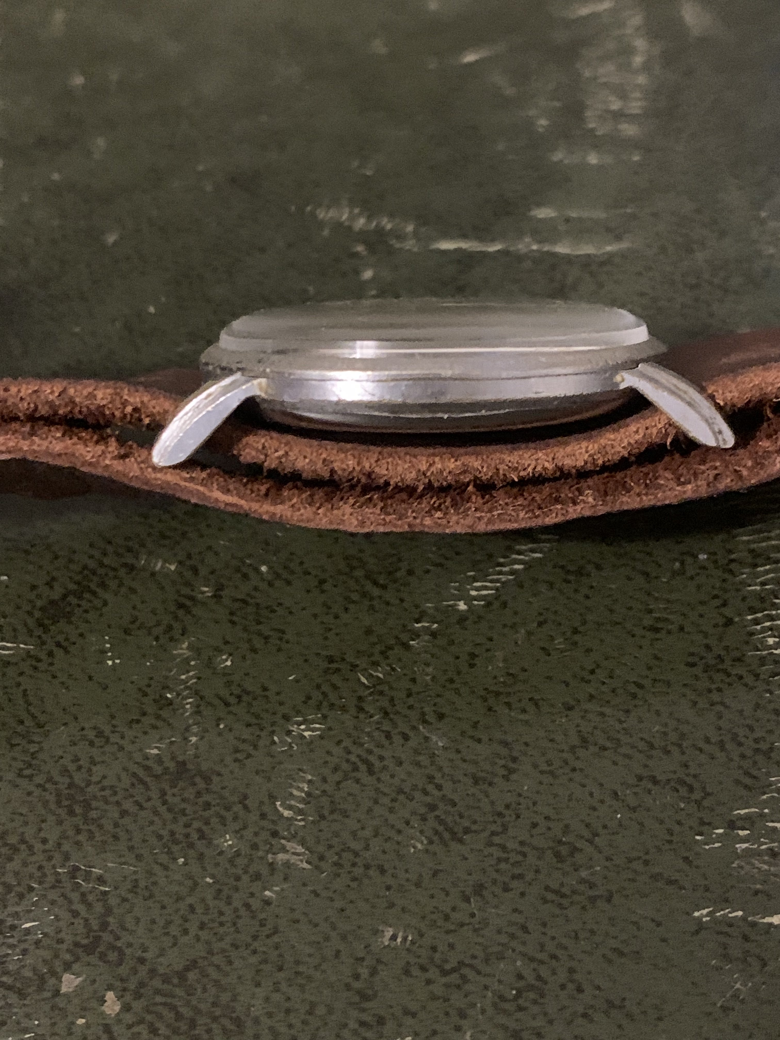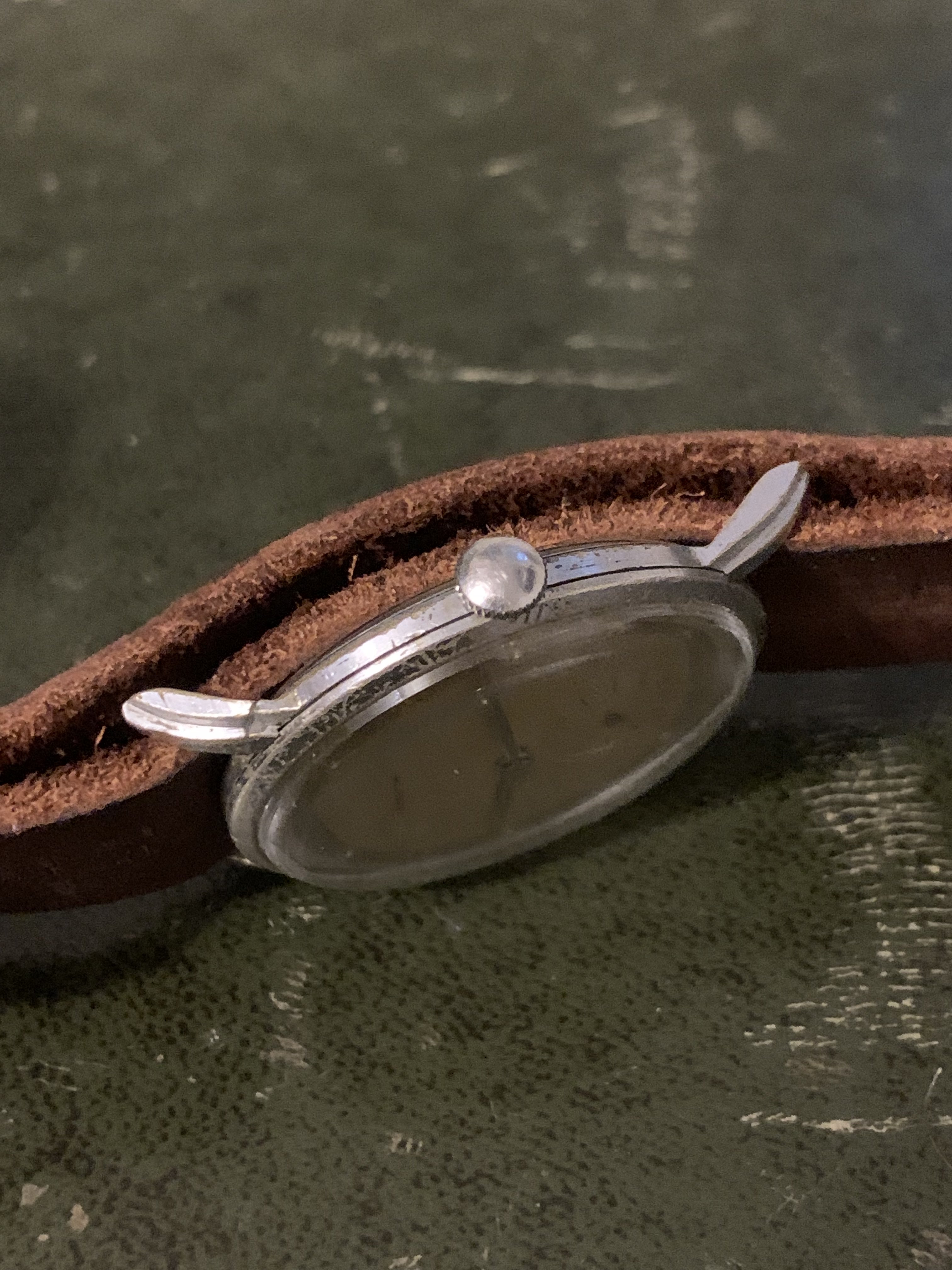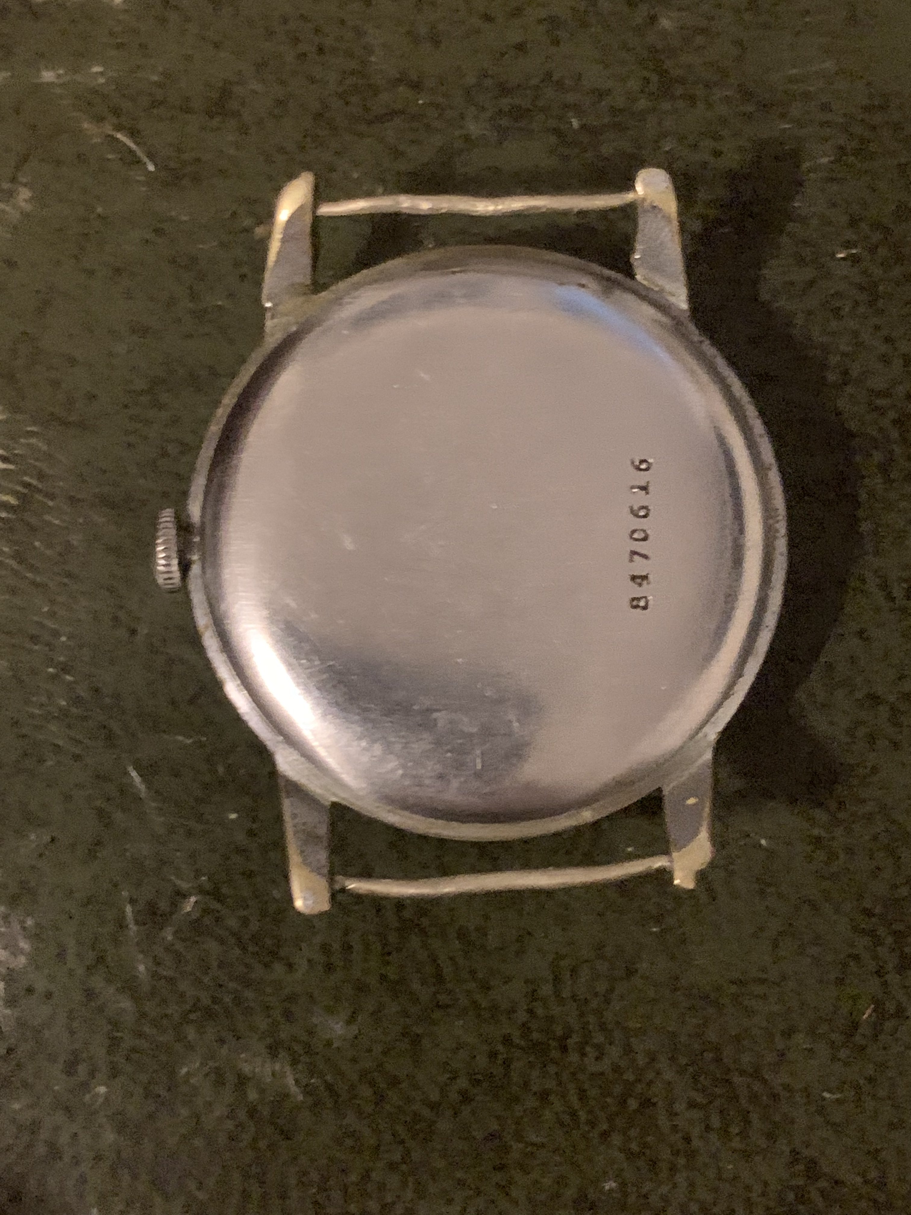 Case: Unfortunately the case is the weaker part of this watch, being in a less than desirable condition. It is serviceable however and remains wearable. The lug at 1 oclock had broken and was fixed with araldite epoxy resin for metal repairs and that appears to have a strong hold. It is a 35mm case, with fixed bars and has a clear Art Deco design, which I had considered having repaired professionally and replated but I never got around to it.