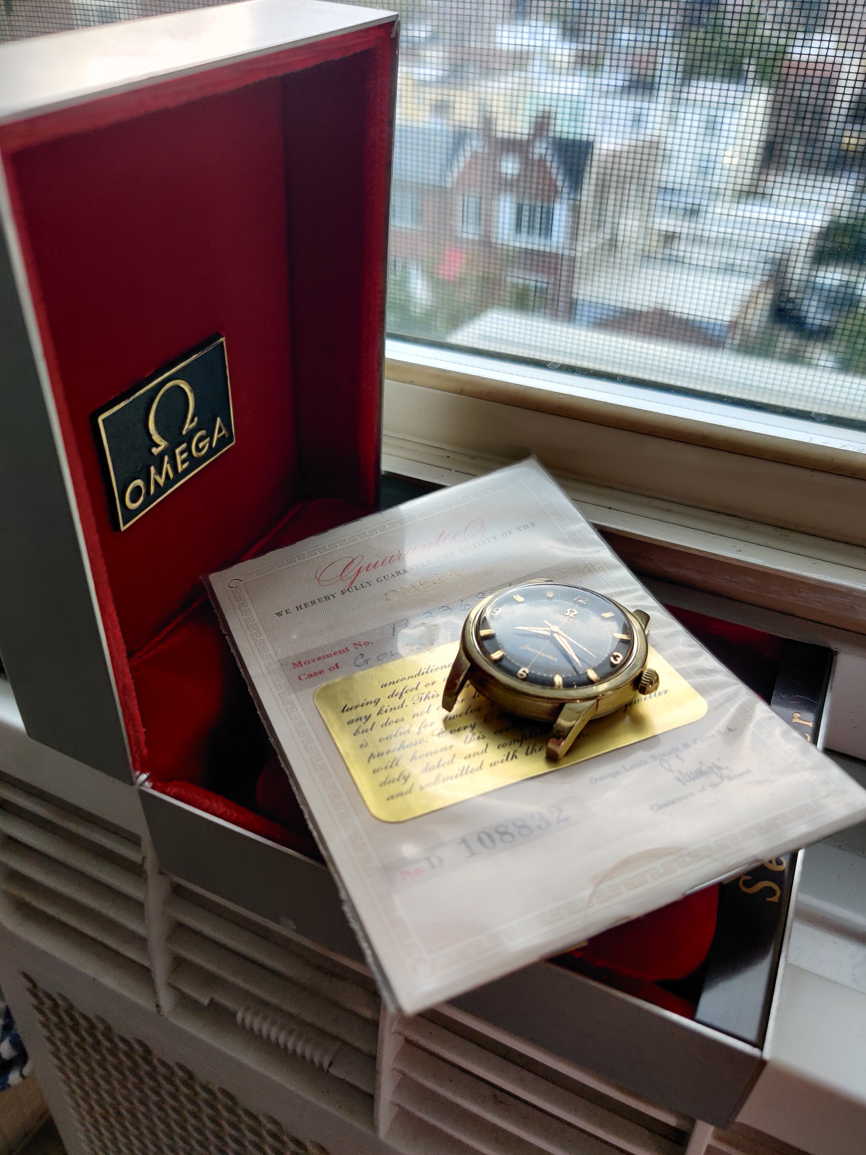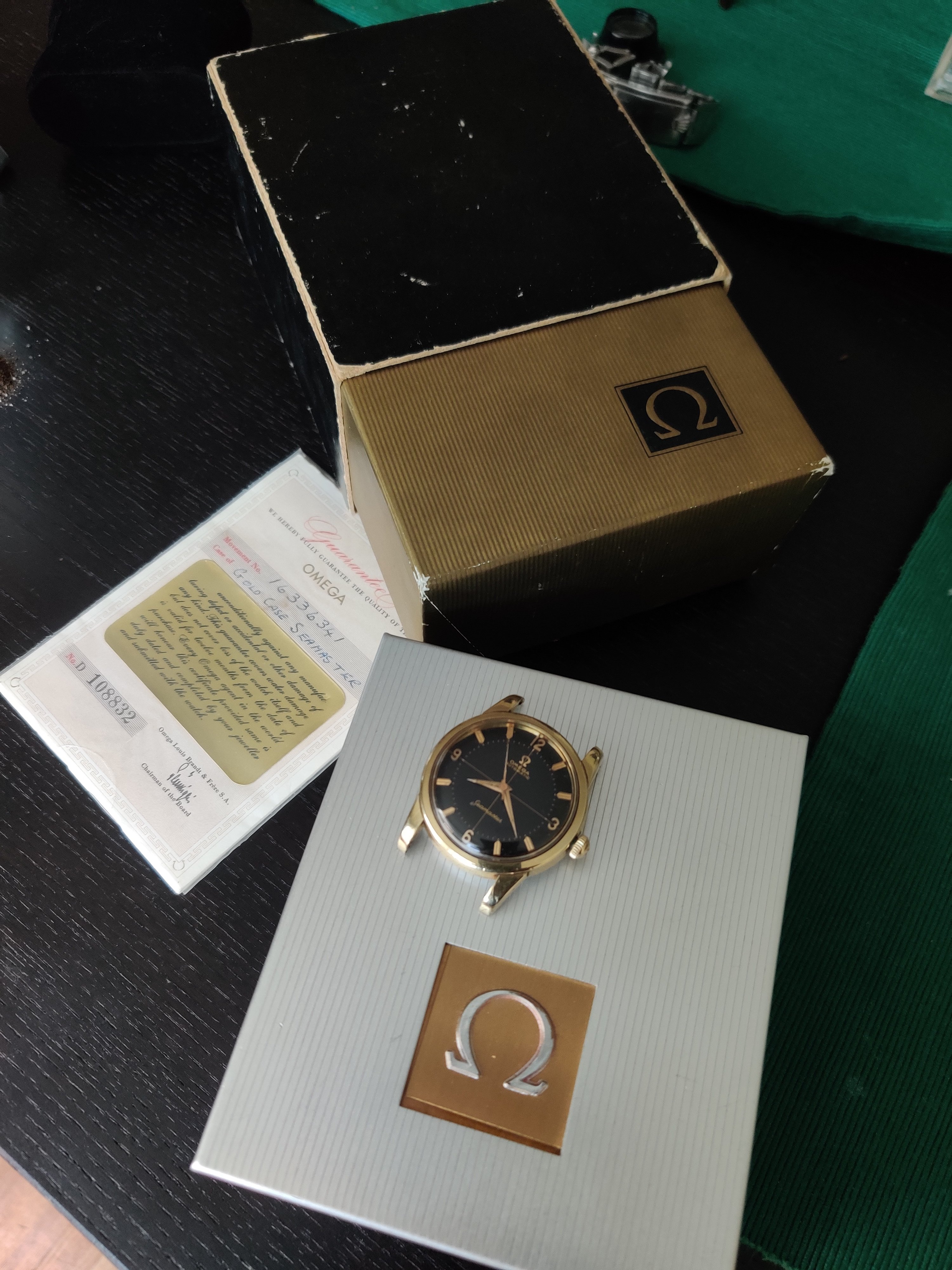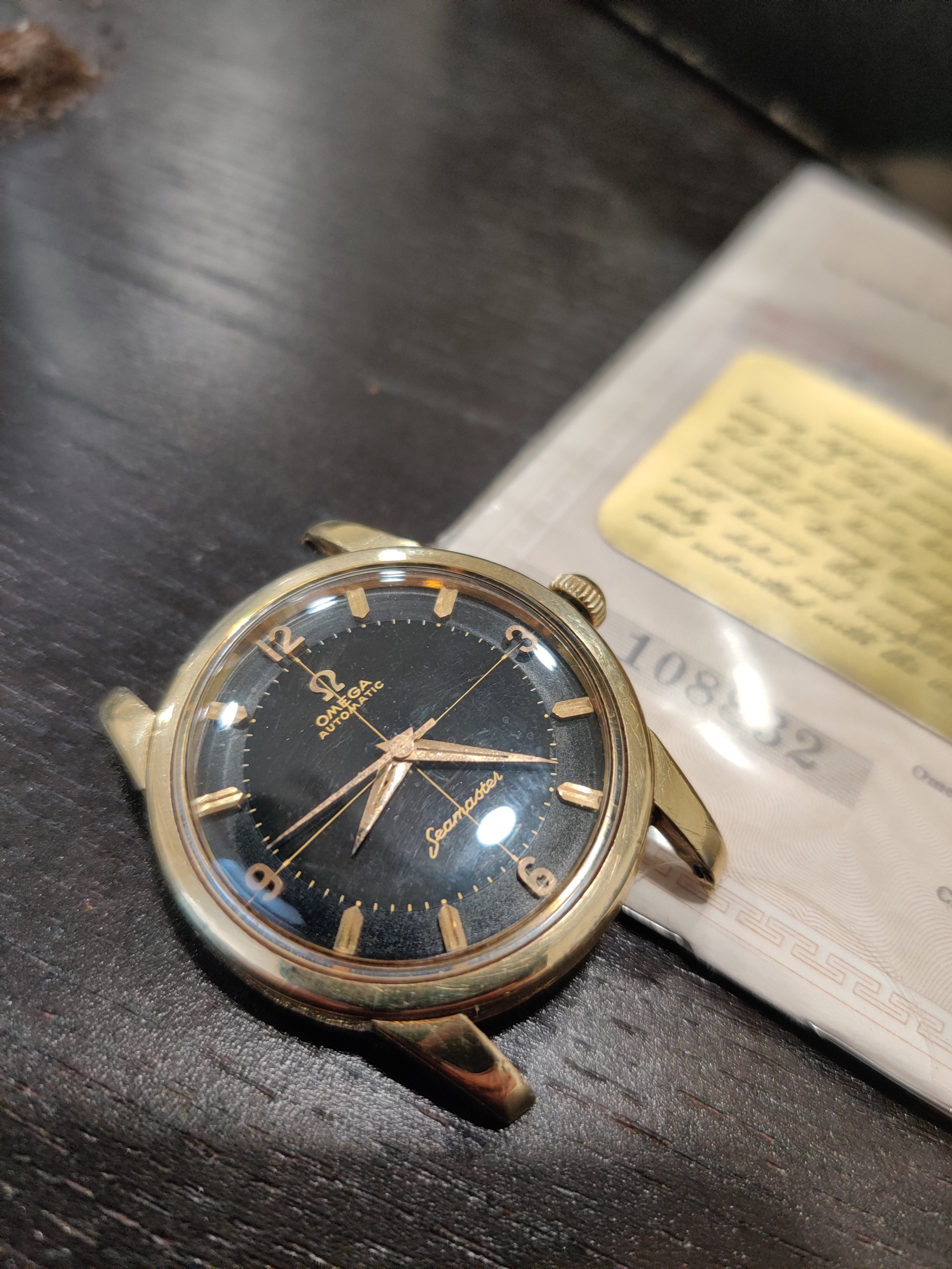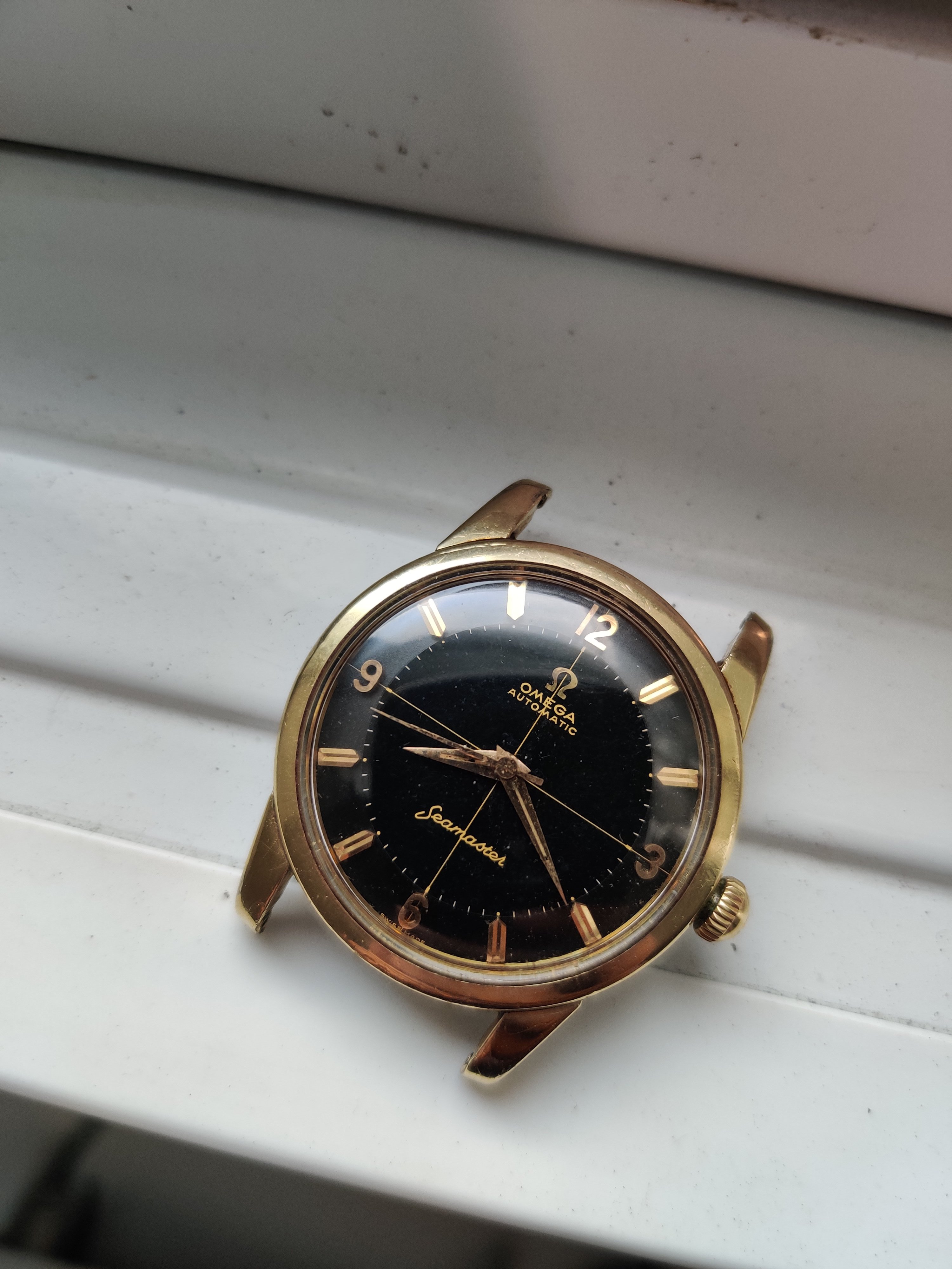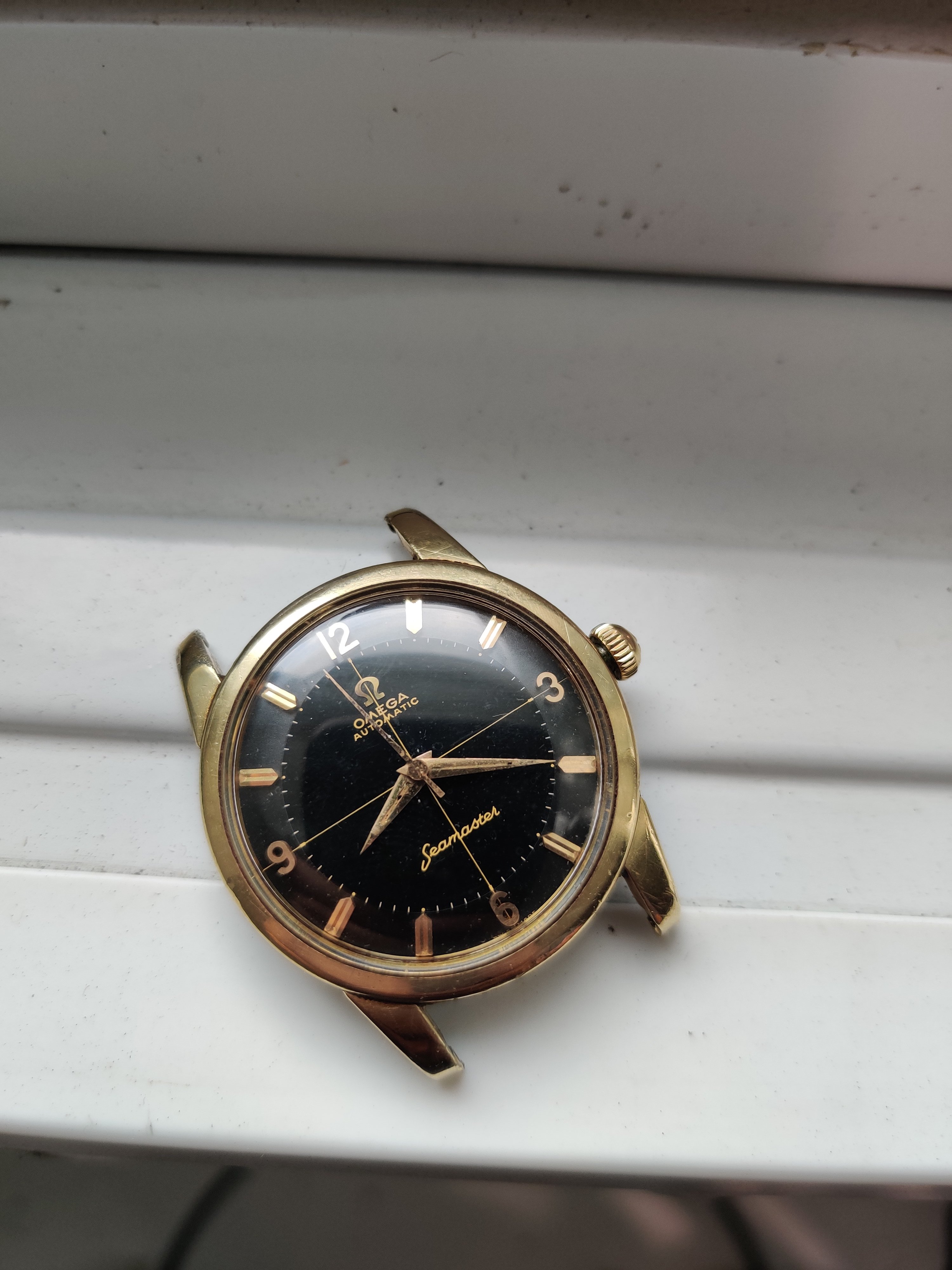 Up for sale is a Seamaster 2846 with an original black dial. The dial is in honest condition with some marks and lacquer crazing. It is not perfect, but it is still mostly glossy and looks good in most light. The case has seen better days - it has evident marks and has been polished where the bezel is not sharp anymore. The inner lugs have some damage, probably from a twist o flex bracelet in the past but the damage is mostly covered up when a strap is put on. The crown has been replaced with another Omega crown. It runs and winds well surprisingly ( 0 to +8 sec a day) but I recommend a service if worn daily. It also comes with Outer Box, Inner Box which I believe are from a later date, but the guarantee matches the serial of the watch and the owner's inscription on the back. If you have any questions, feel free to pm me. I have tried to take picture at various angles and in different lighting, but if you want more pictures I can take some! 😀