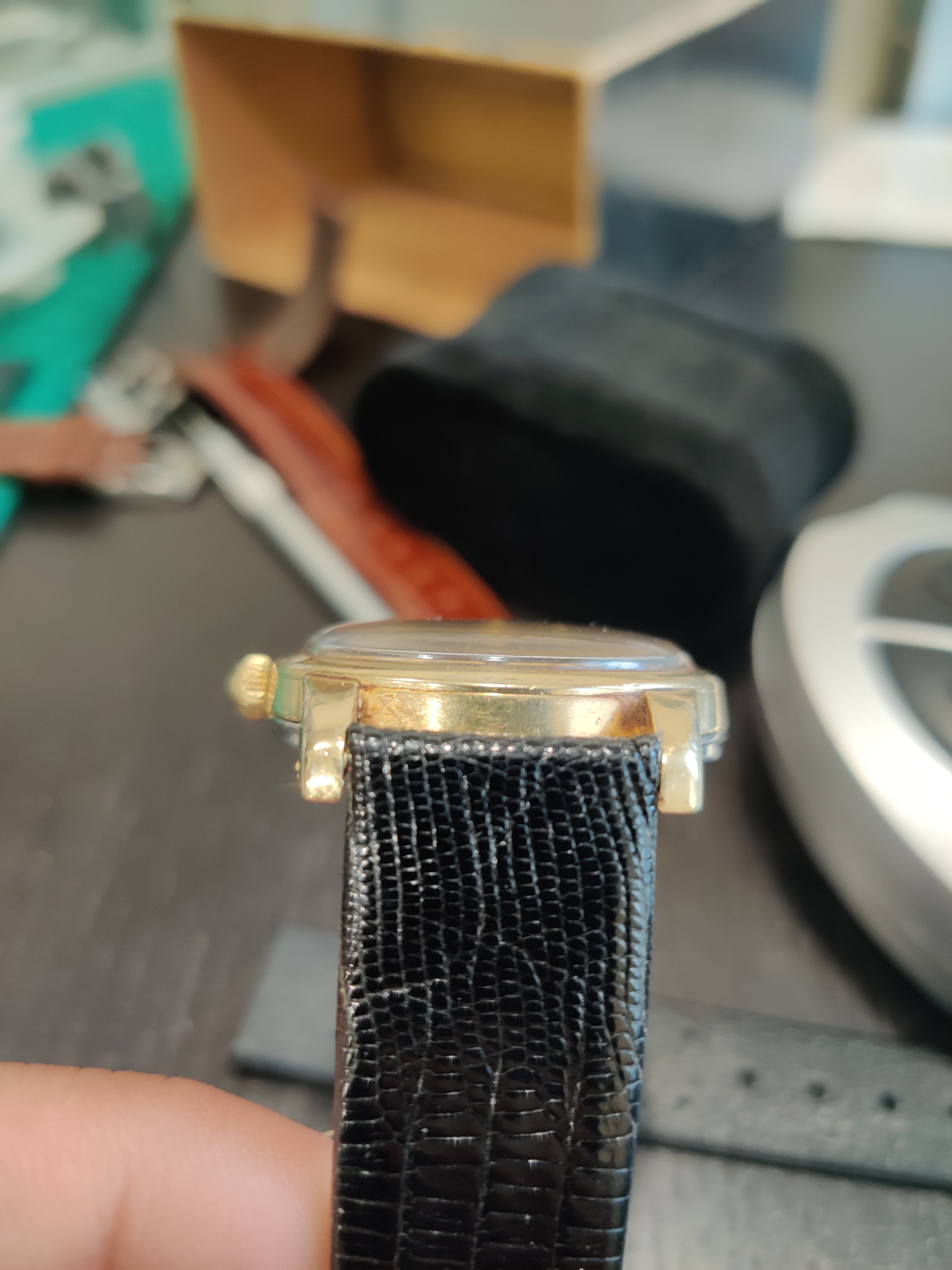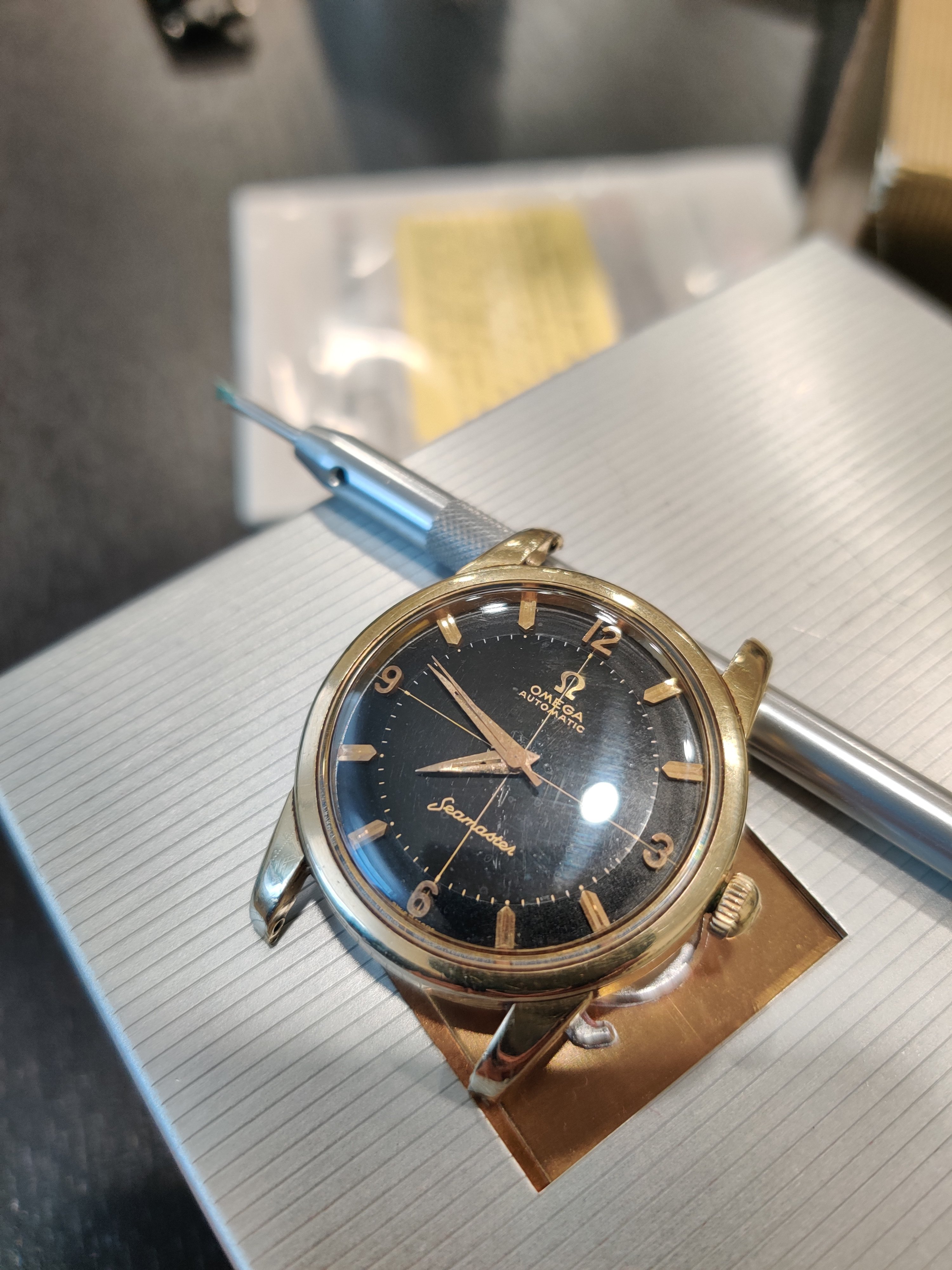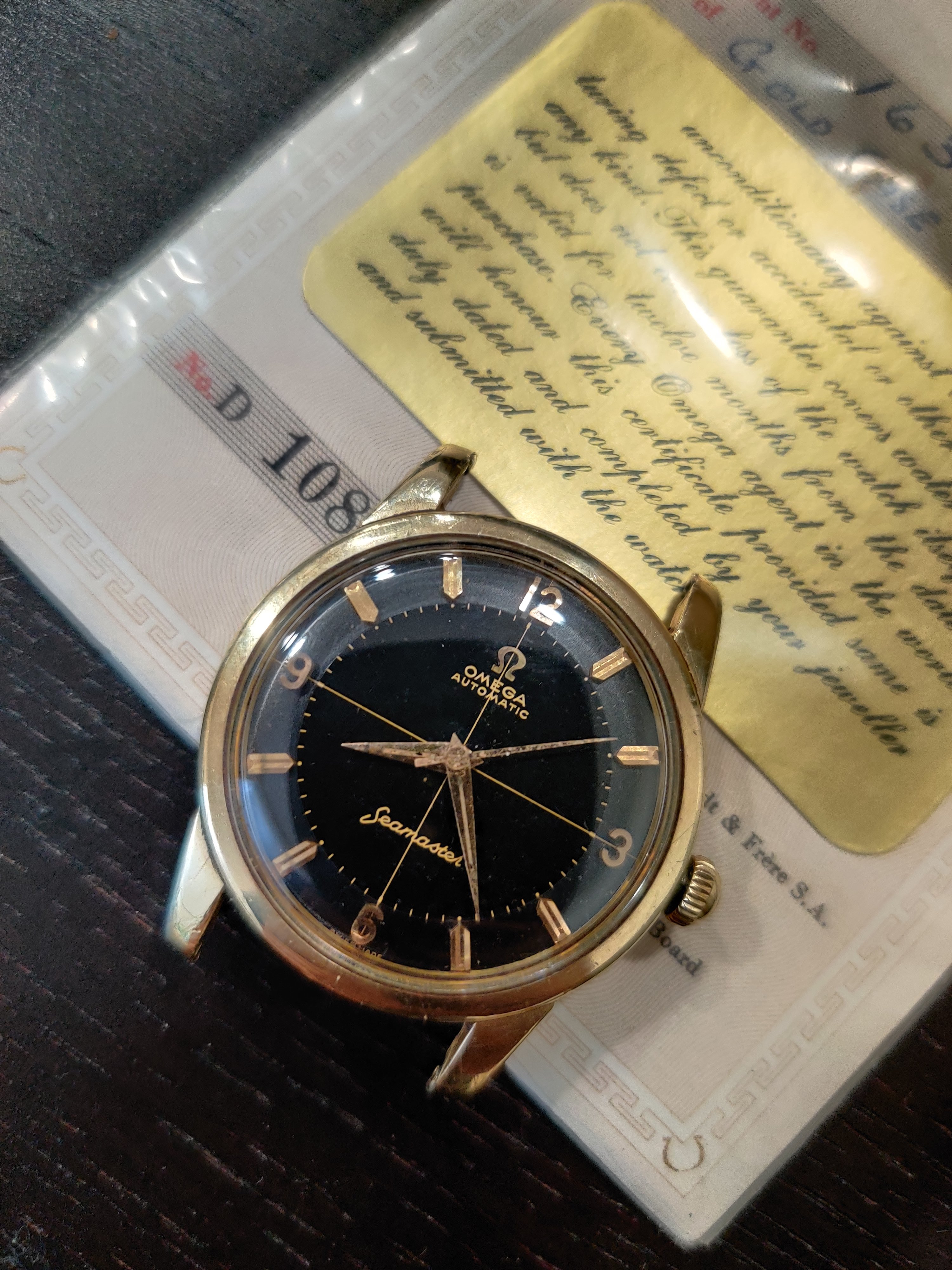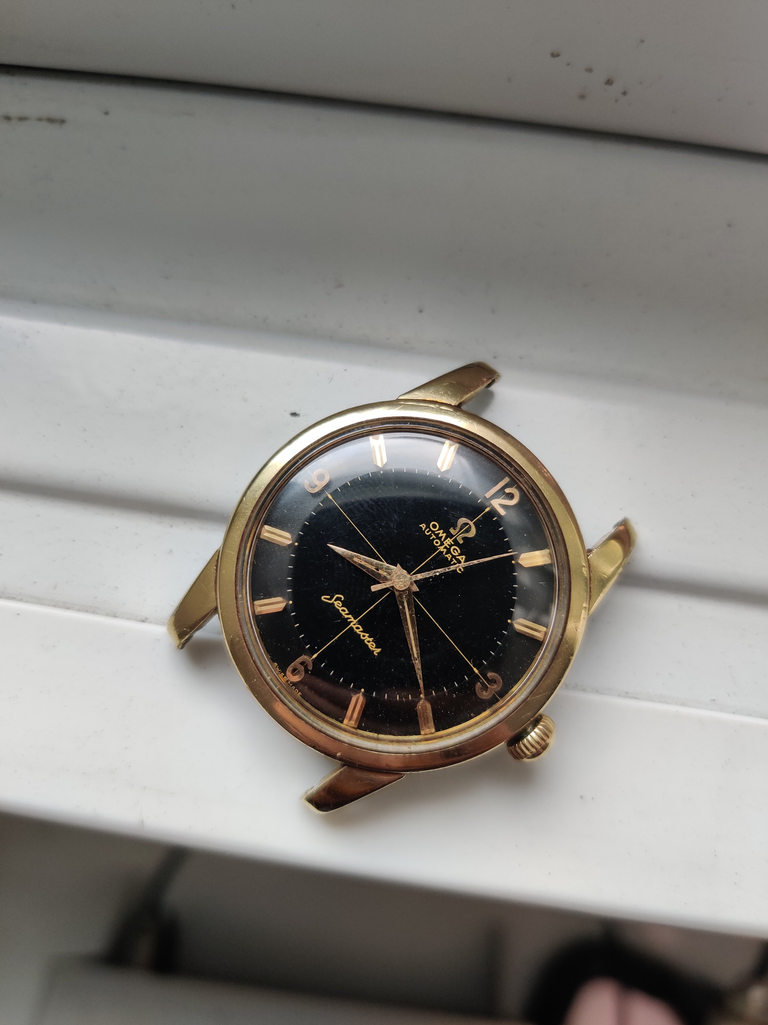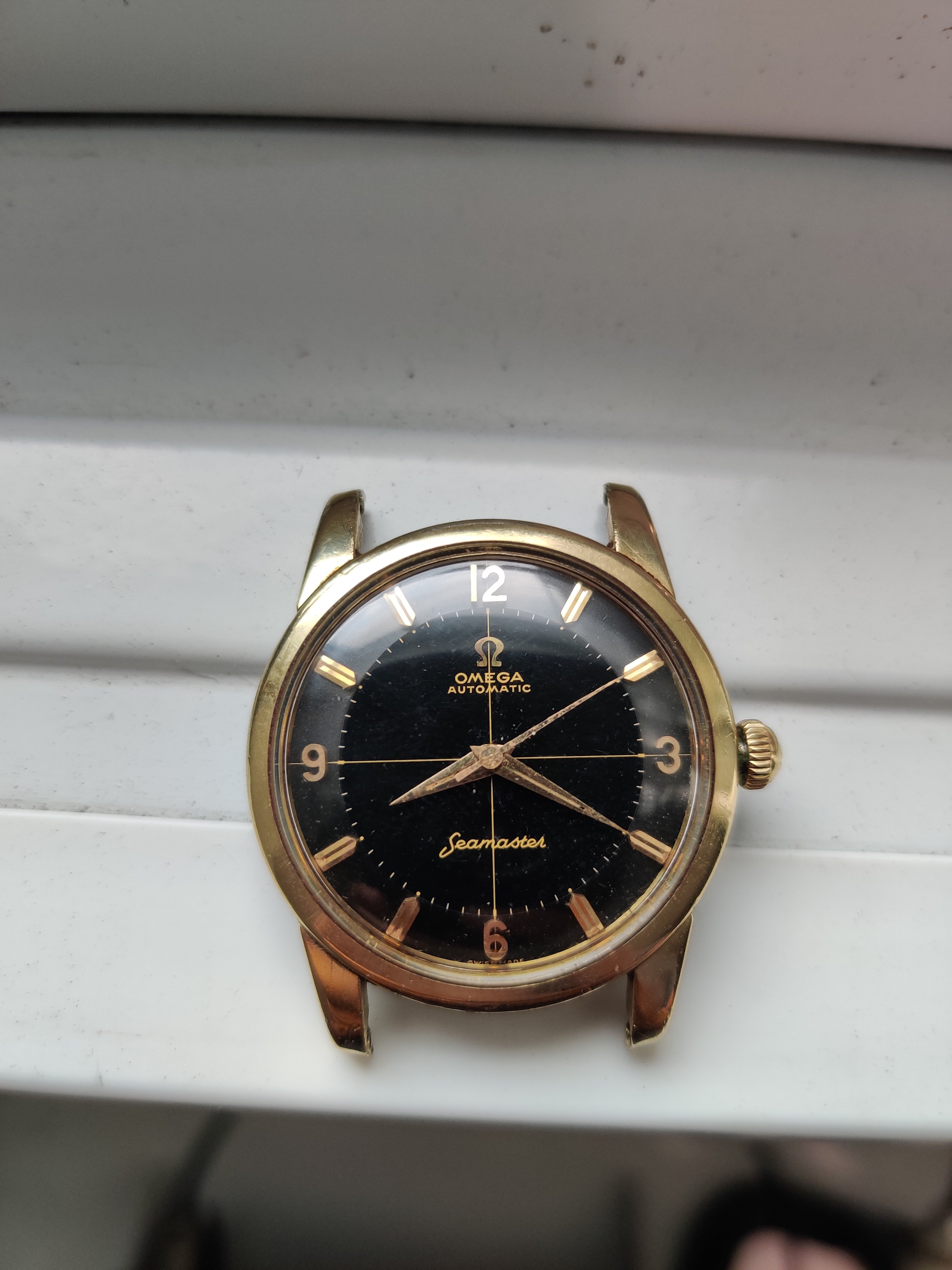 Up for sale is a Seamaster 2846 with an original black dial. The dial is in honest condition with some marks and lacquer crazing. It is not perfect, but it is still mostly glossy and looks good in most light. The case has seen better days - it has evident marks and has been polished where the bezel is not sharp anymore. The inner lugs have some damage, probably from a twist o flex bracelet in the past but the damage is mostly covered up when a strap is put on. The crown has been replaced with another Omega crown. It runs and winds well surprisingly ( 0 to +8 sec a day) but I recommend a service if worn daily. It also comes with Outer Box, Inner Box which I believe are from a later date, but the guarantee matches the serial of the watch and the owner's inscription on the back. If you have any questions, feel free to pm me. I have tried to take picture at various angles and in different lighting, but if you want more pictures I can take some! 😀