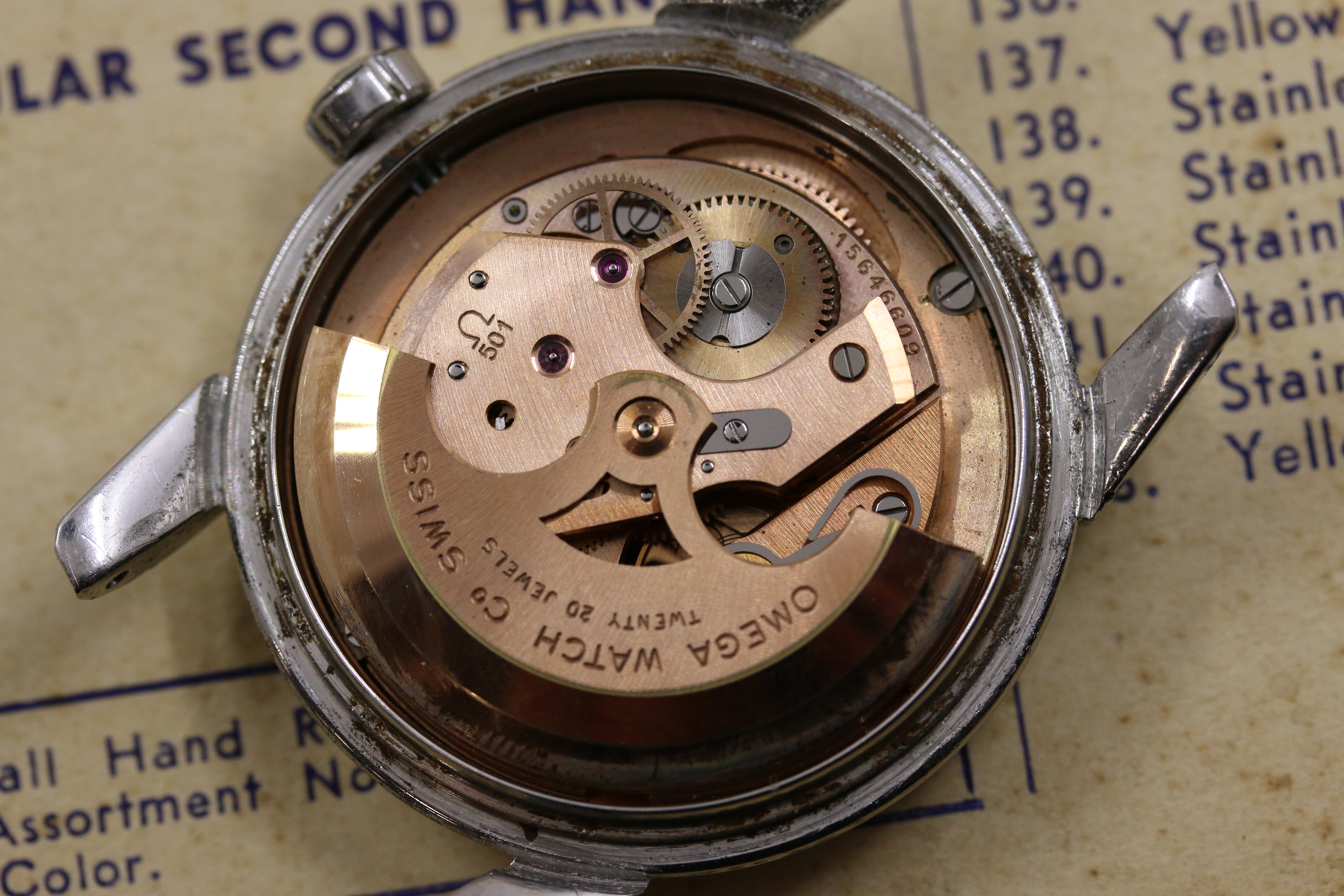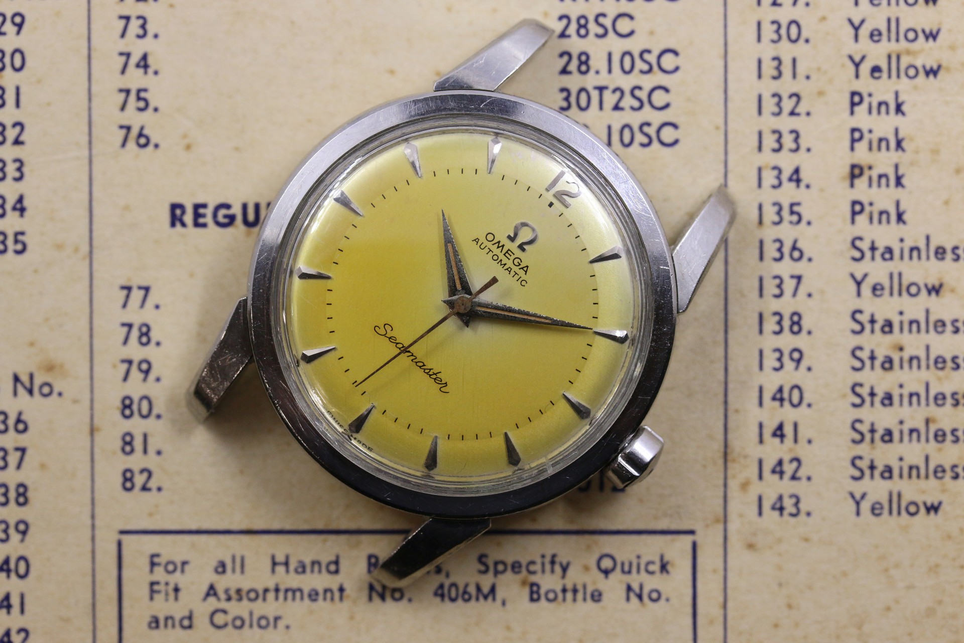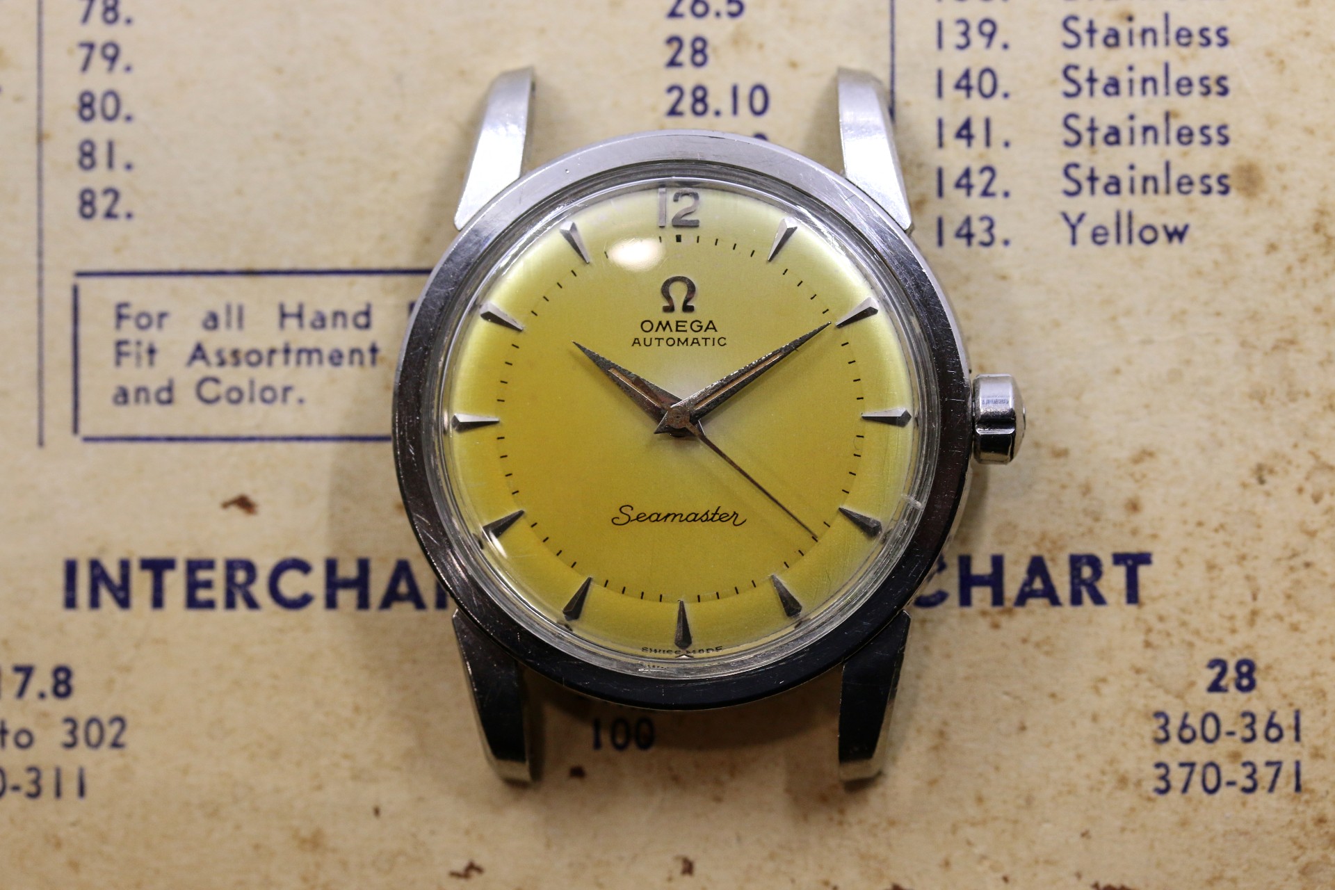 Up for sale is a decent Seamaster 2846 Cal. 501. Most noticeable is the dial which has a nice yellow patina. Overall the dial is pleasing, but there are some minor blemishes shown in the 4th picture which can only be seen in very harsh light. Most of the time the watch does look like how it is pictured in the first couple of pictures. I do believe that the hands were replaced at some point or the dial, as the hands have lume and the dial doesn't. Case is in ok condition with some pitting around the caseback, shown in the pictures. Crystal is original with some little nicks around the edges. Watch runs, but has not been serviced in my possession. As always, if you have any questions feel free to pm me!